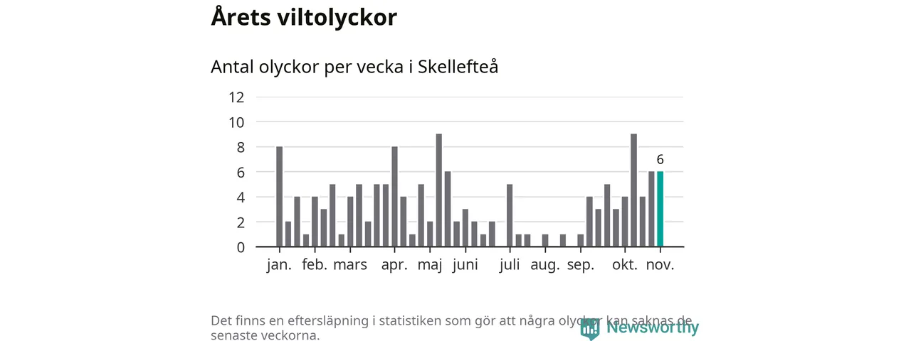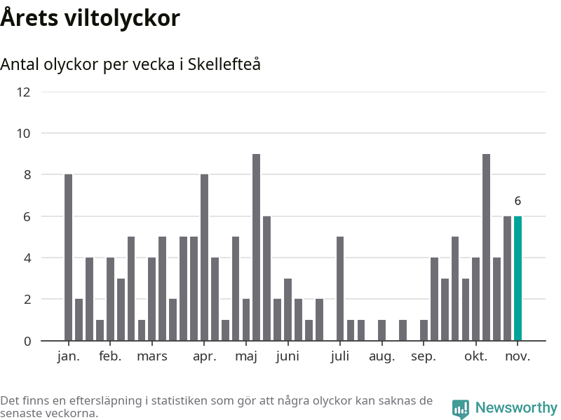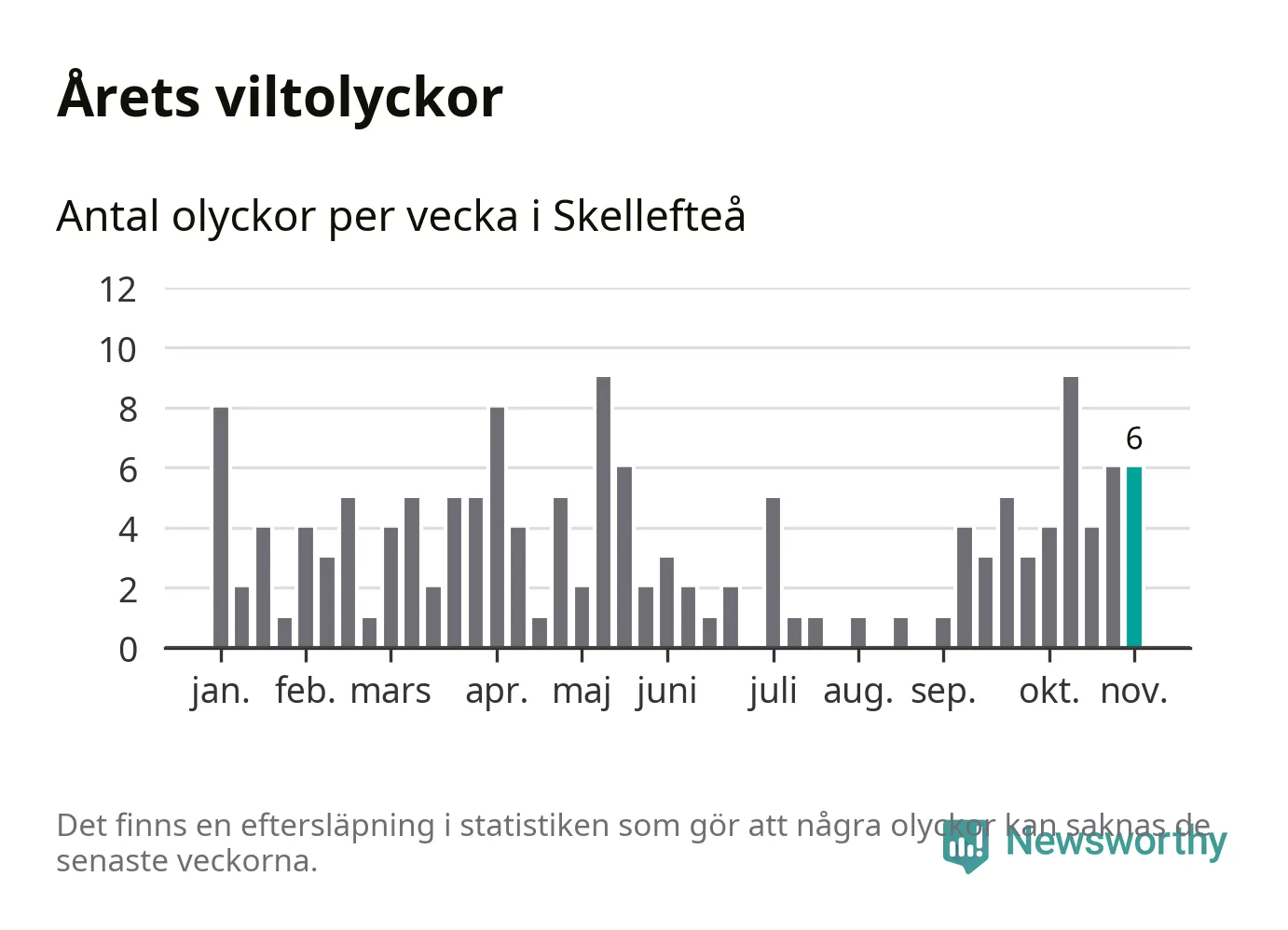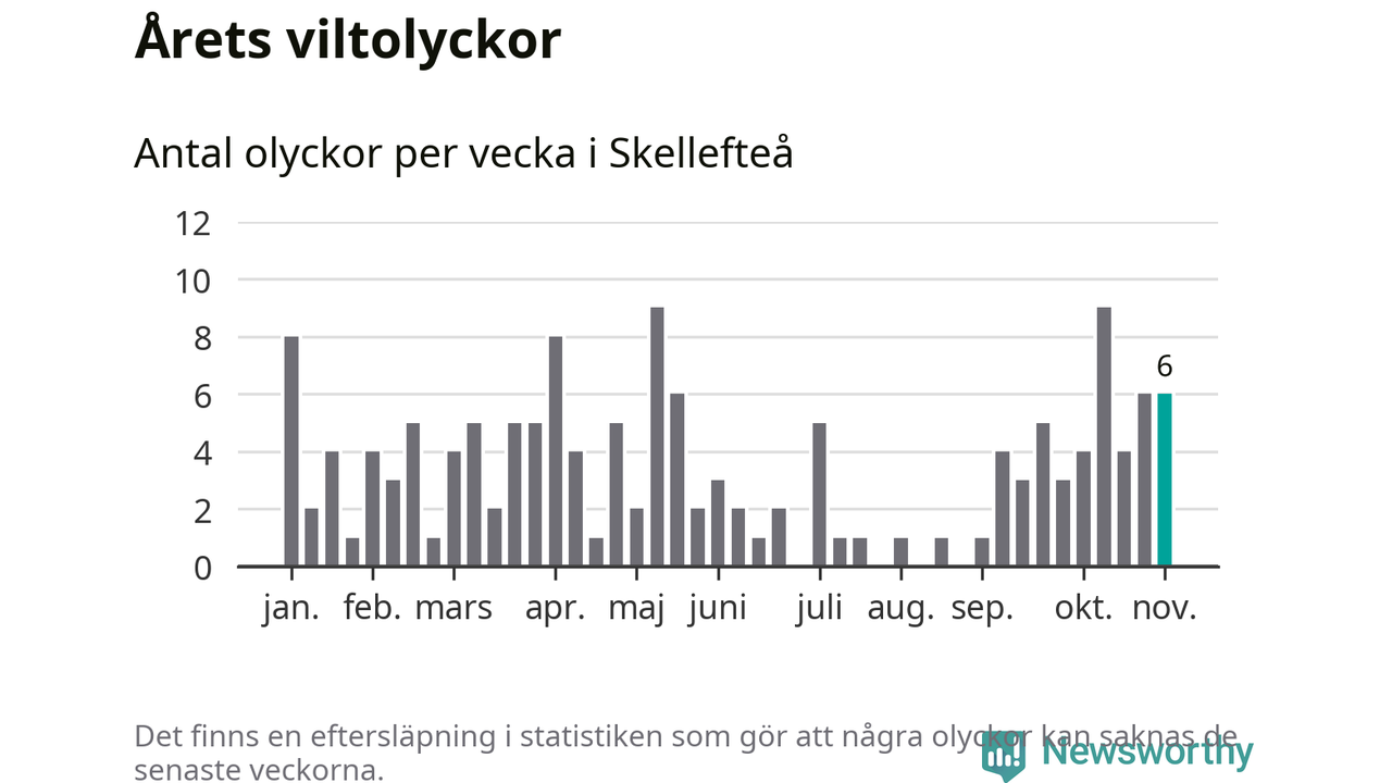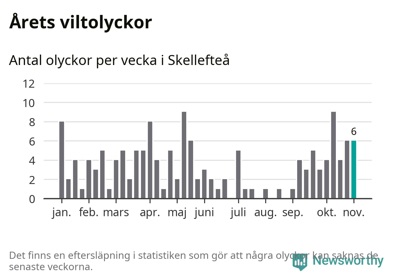 Hittills har sex viltolyckor rapporterats in i Skellefteå kommun från vecka 45. Se listan här.