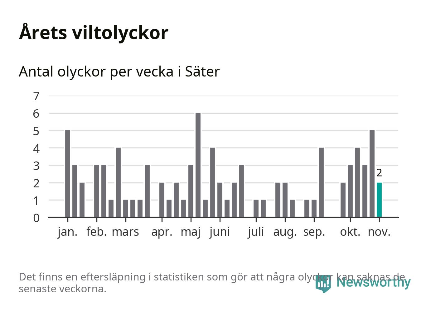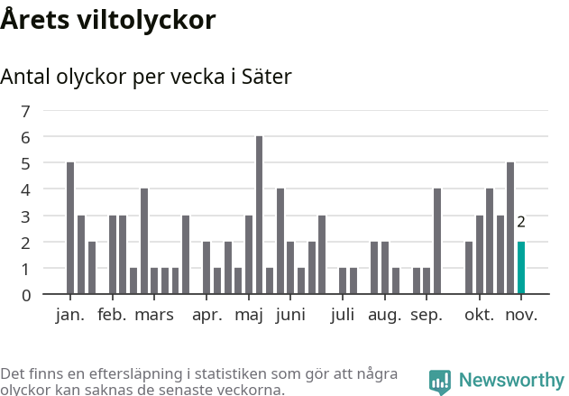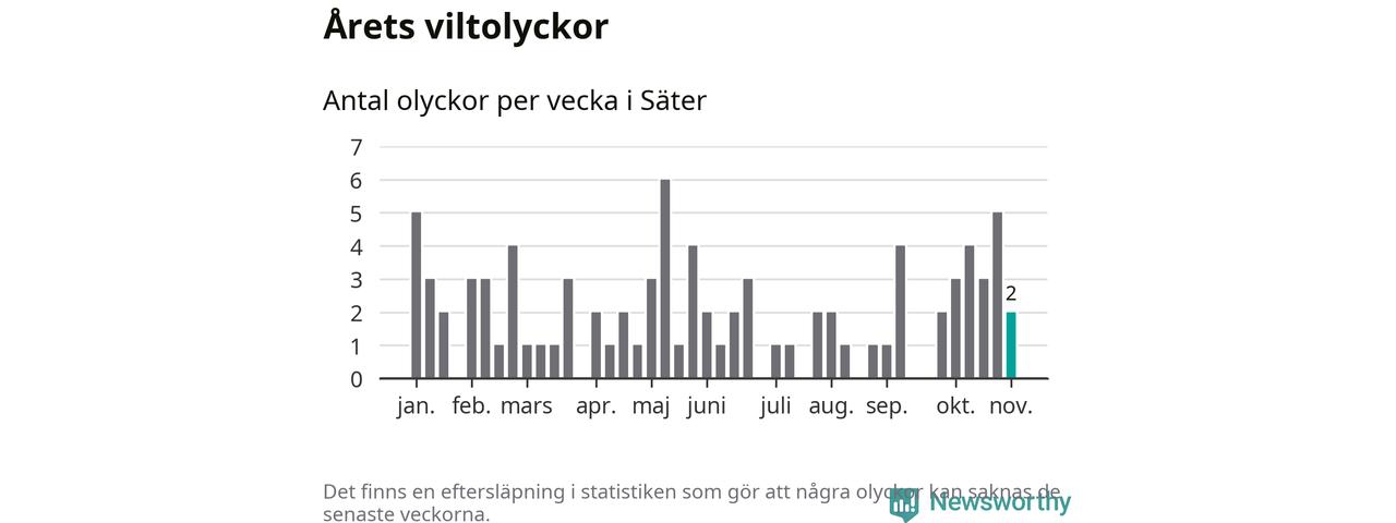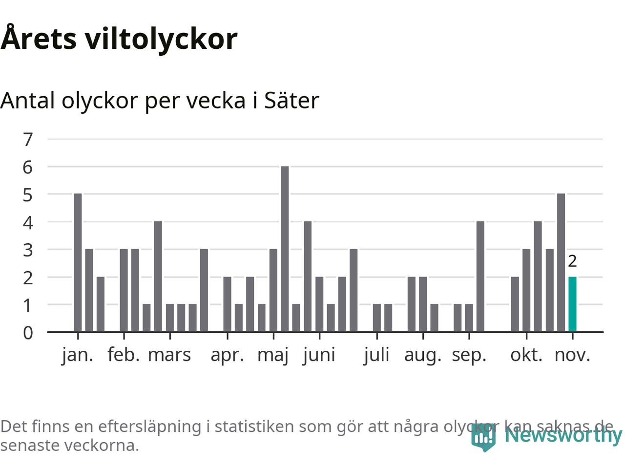 Hittills har två viltolyckor rapporterats in i Säters kommun från vecka 45. Se listan här.