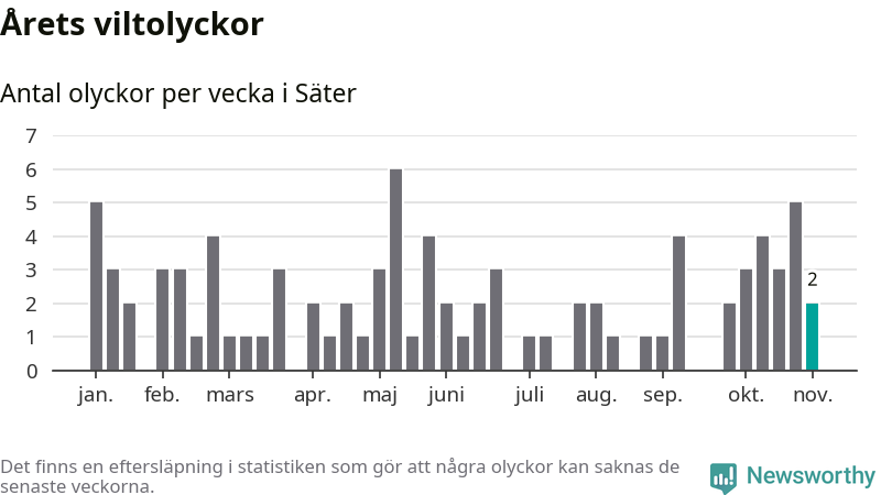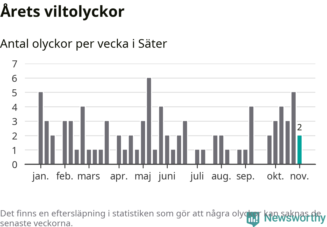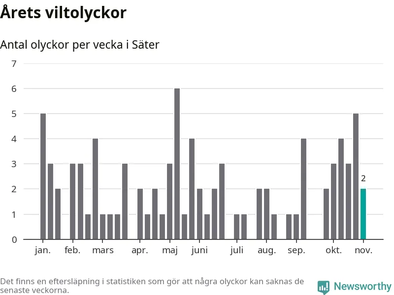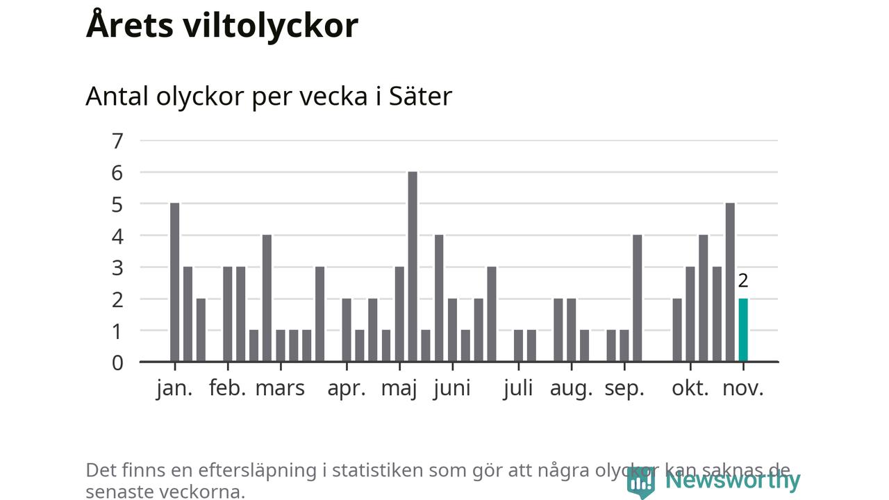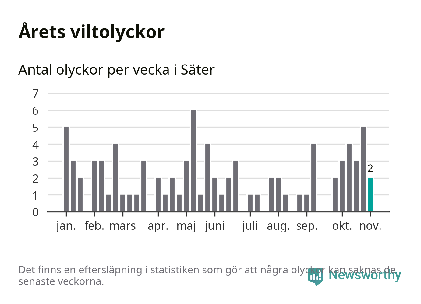 Hittills har två viltolyckor rapporterats in i Säters kommun från vecka 45. Se listan här.