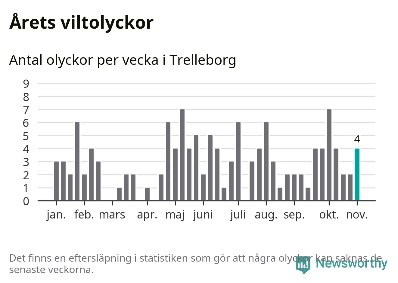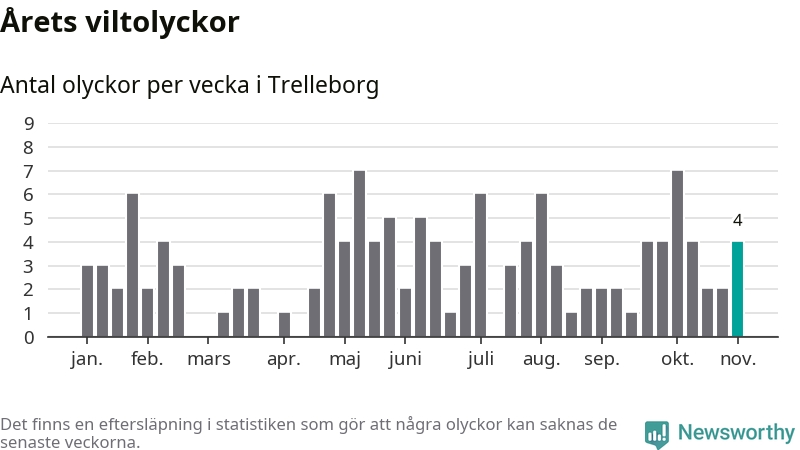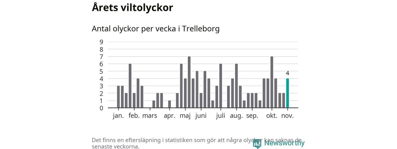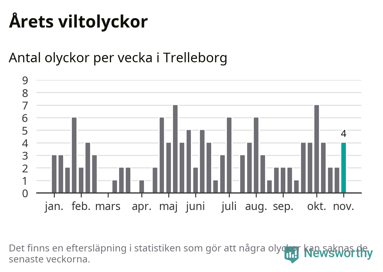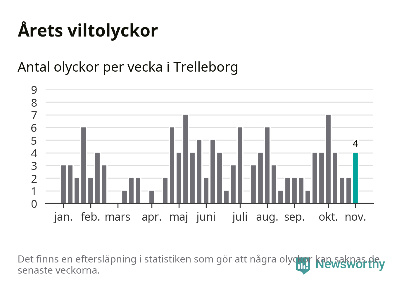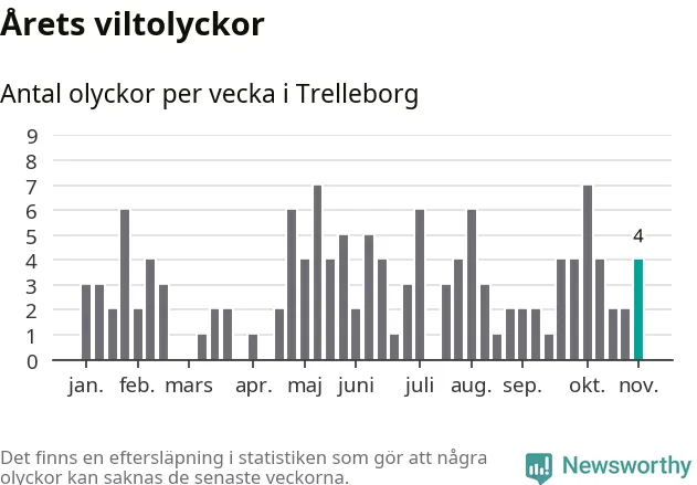 Hittills har fyra viltolyckor rapporterats in i Trelleborgs kommun från vecka 45. Se listan här.