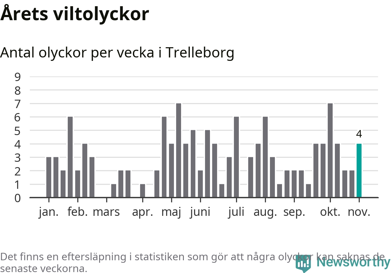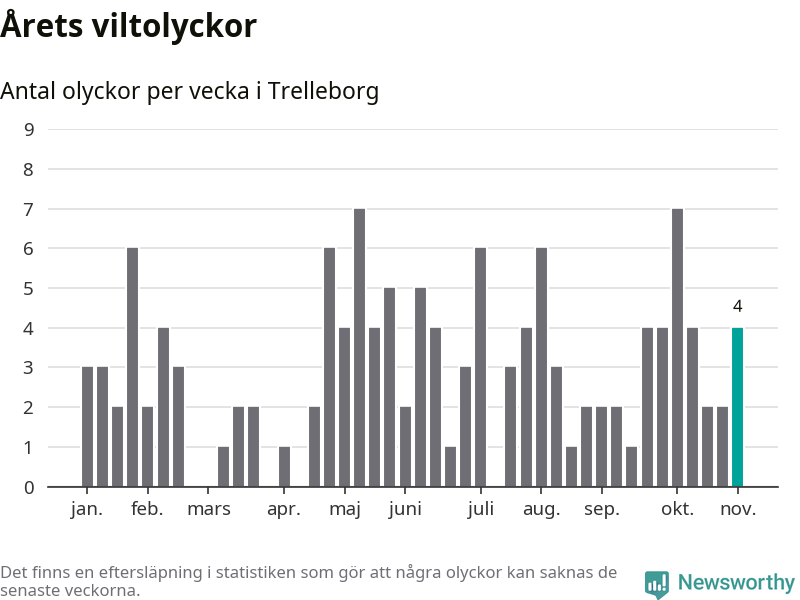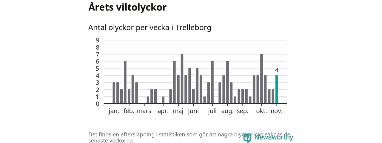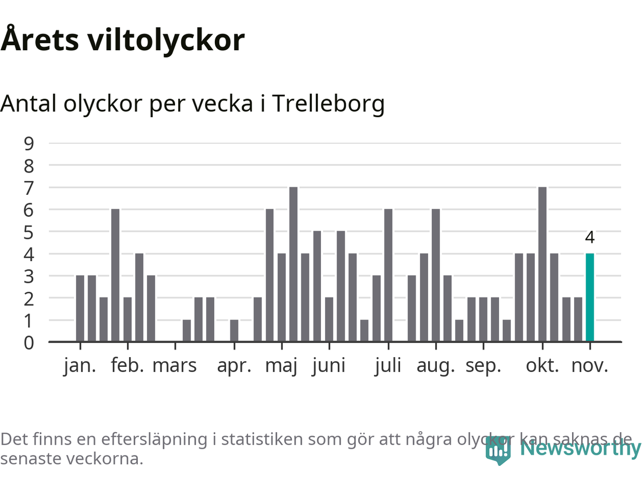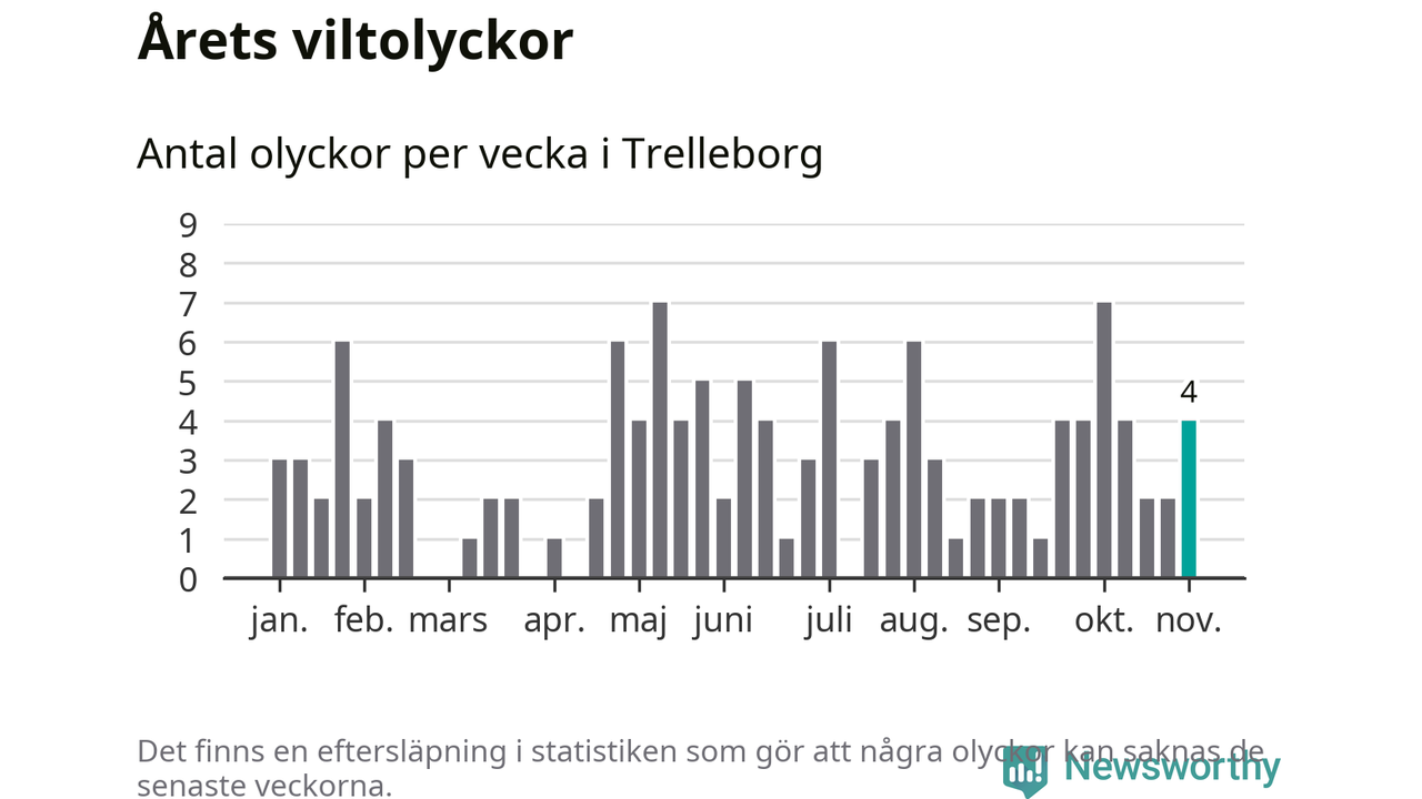 Hittills har fyra viltolyckor rapporterats in i Trelleborgs kommun från vecka 45. Se listan här.