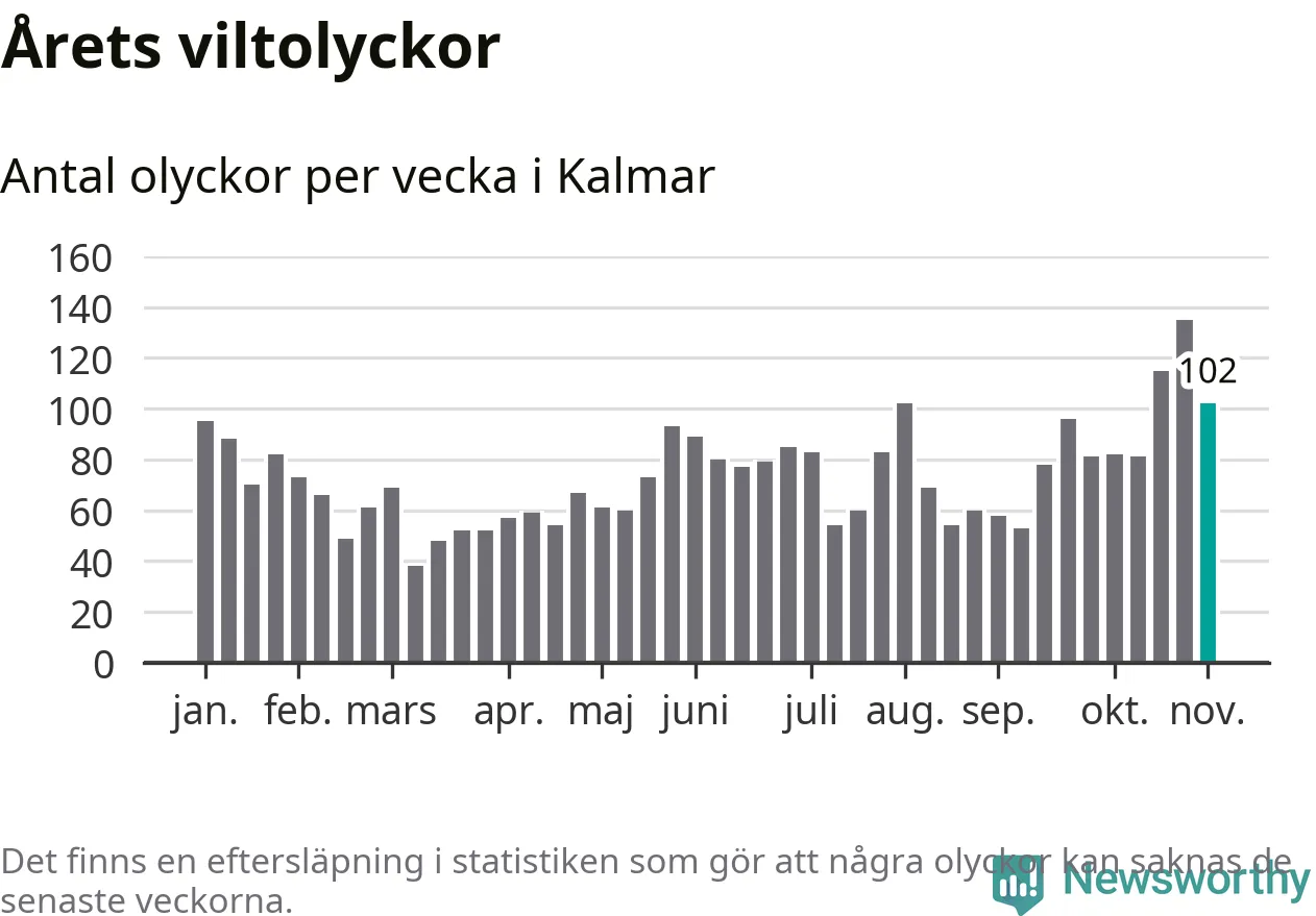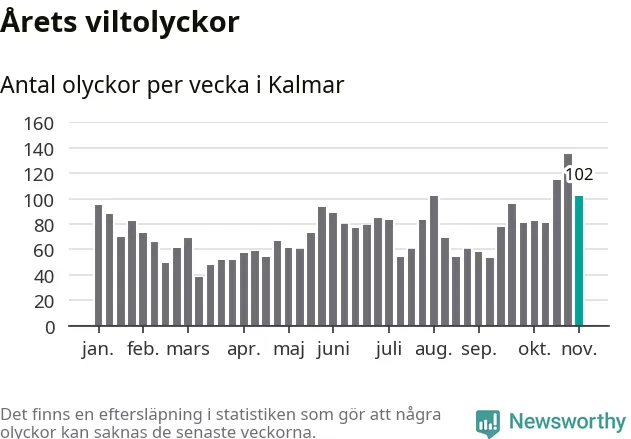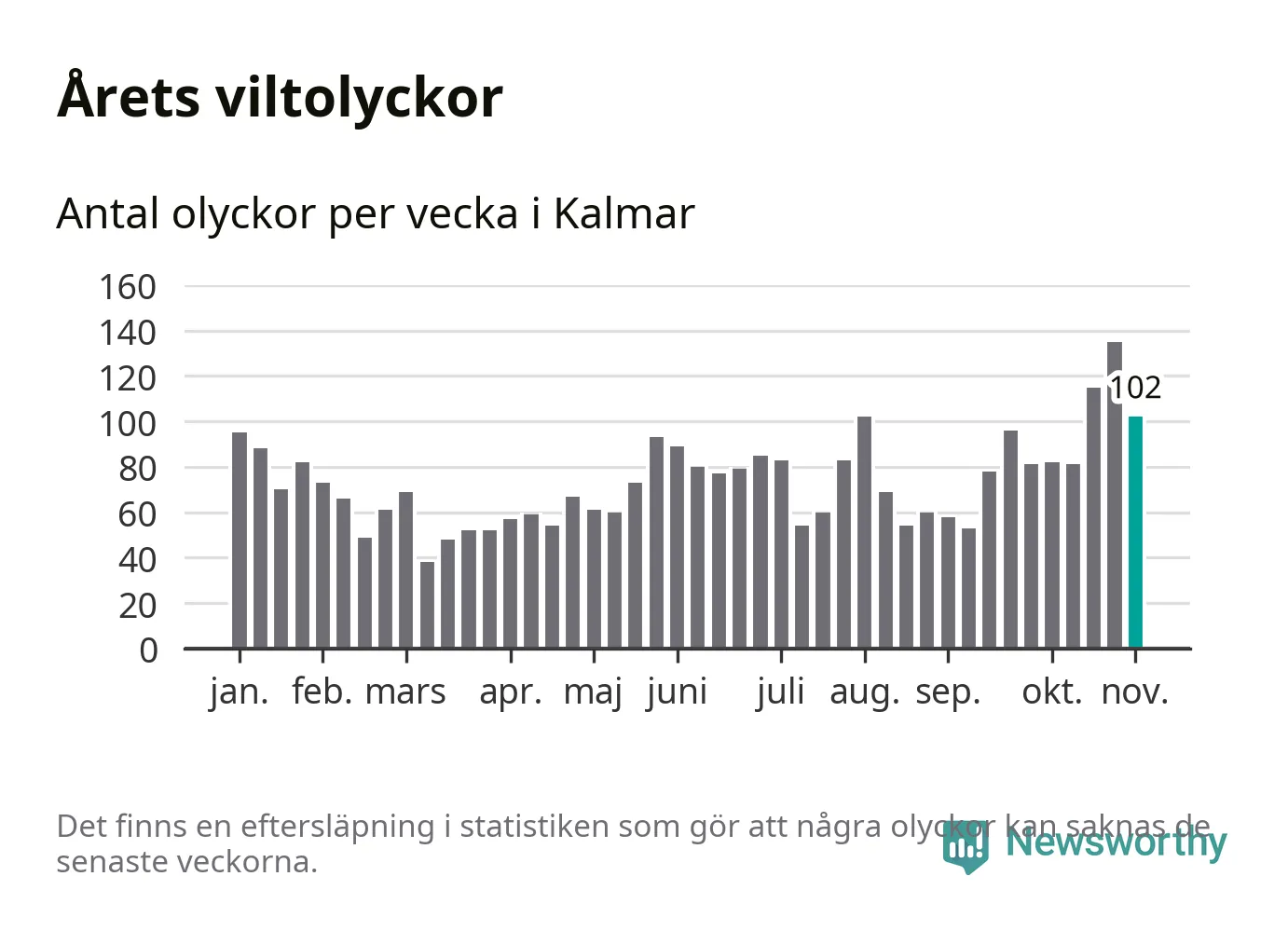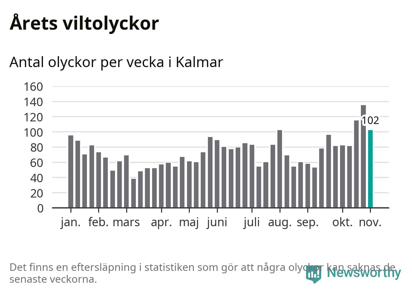 Hittills har 102 viltolyckor rapporterats in i Kalmar län från vecka 45. Se listan här.