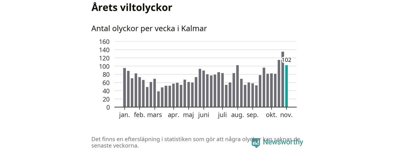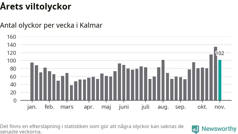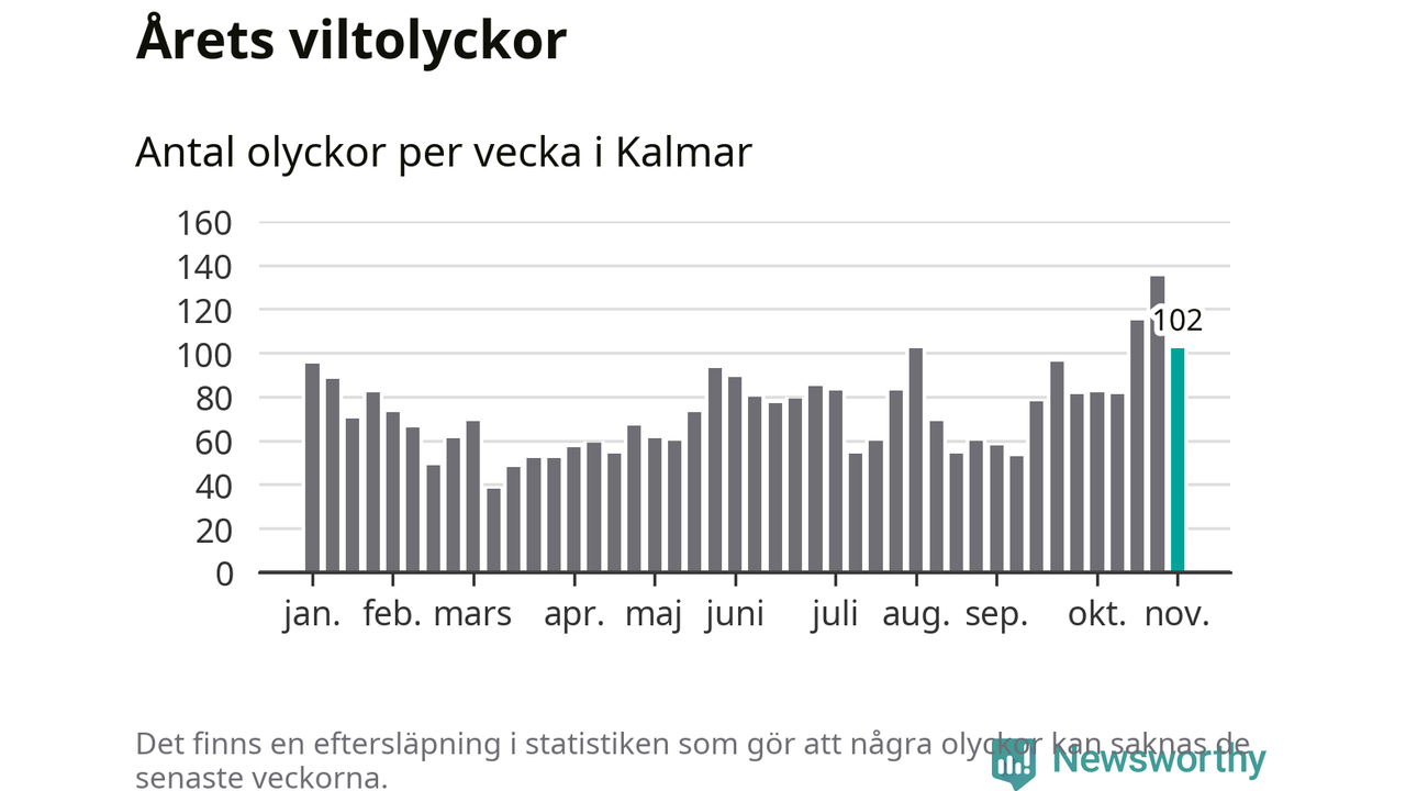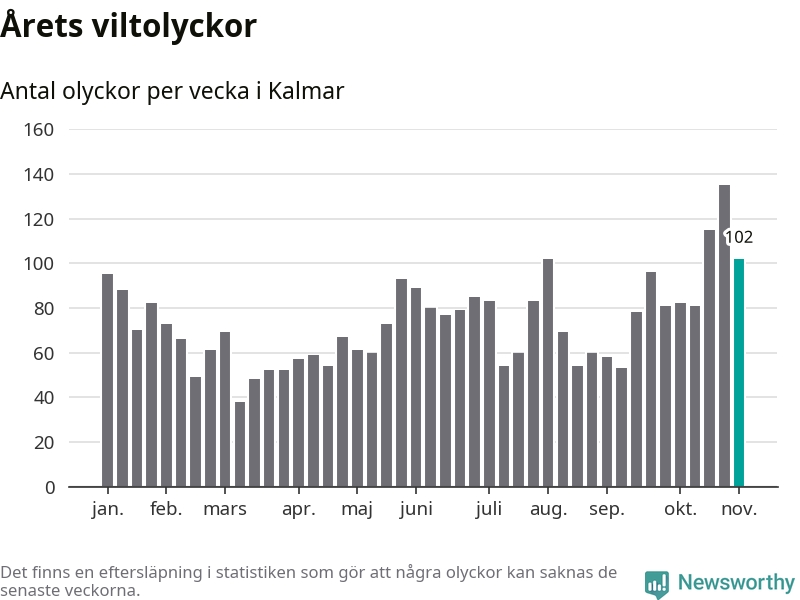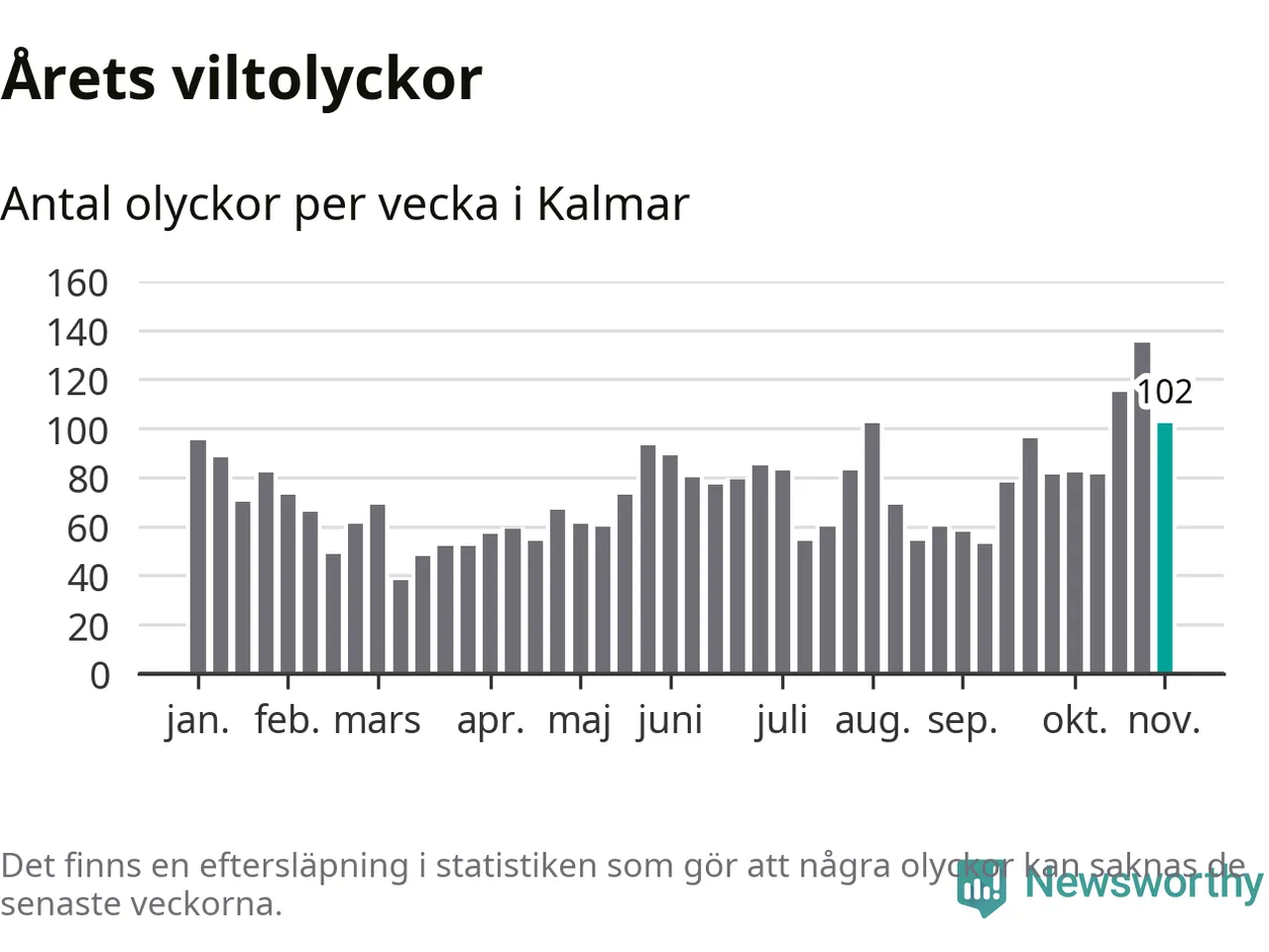 Hittills har 102 viltolyckor rapporterats in i Kalmar län från vecka 45. Se listan här.