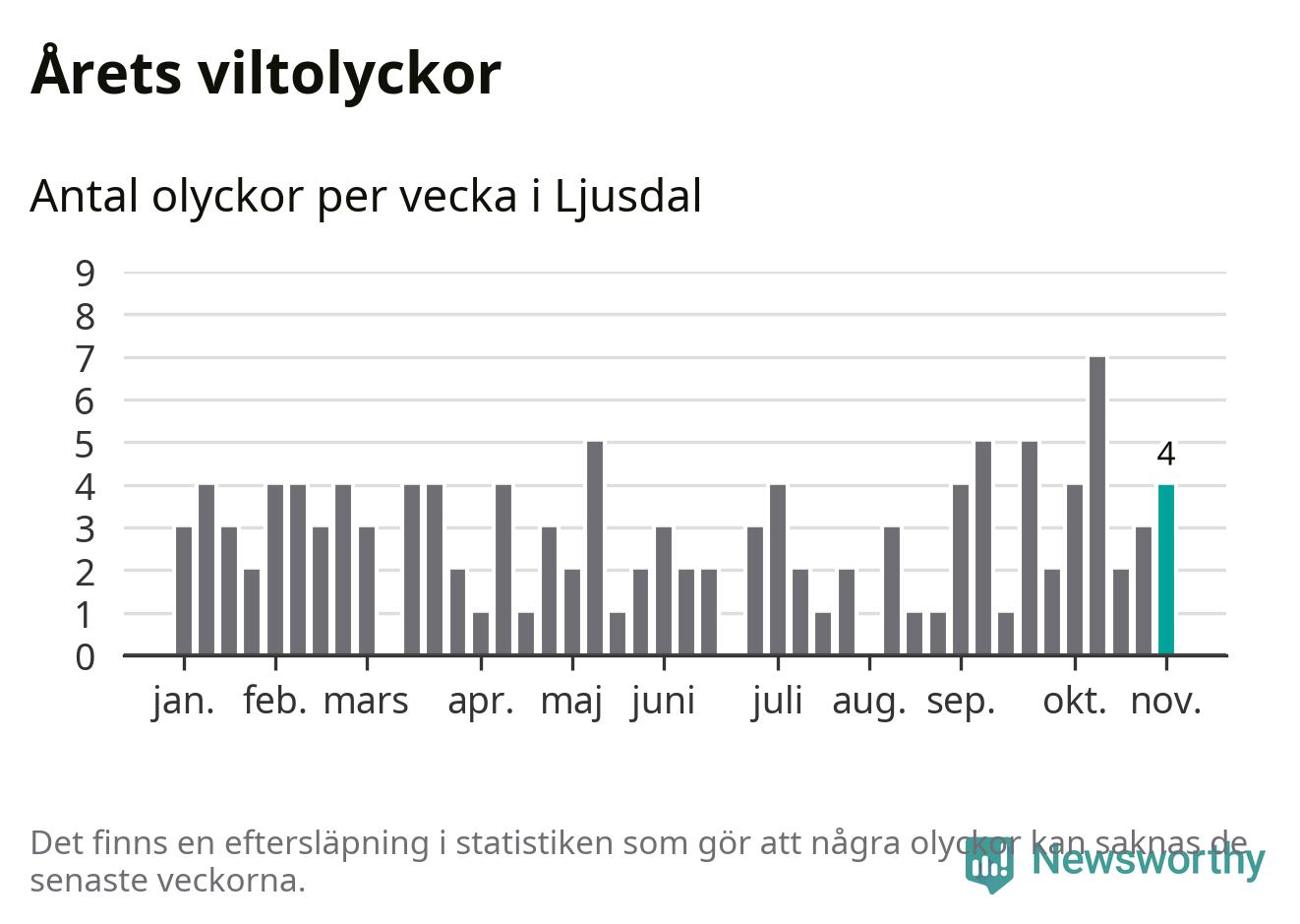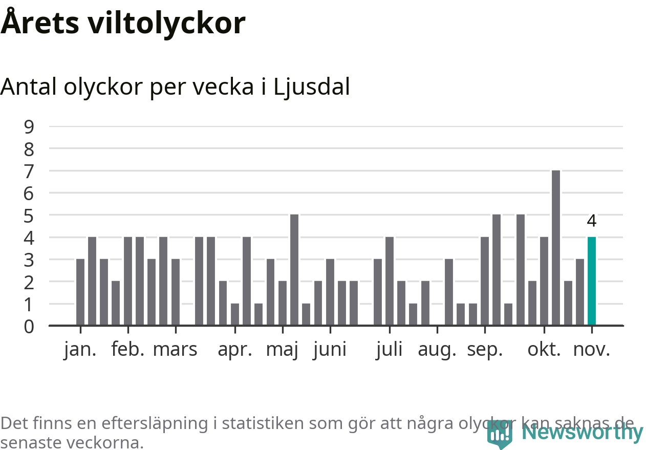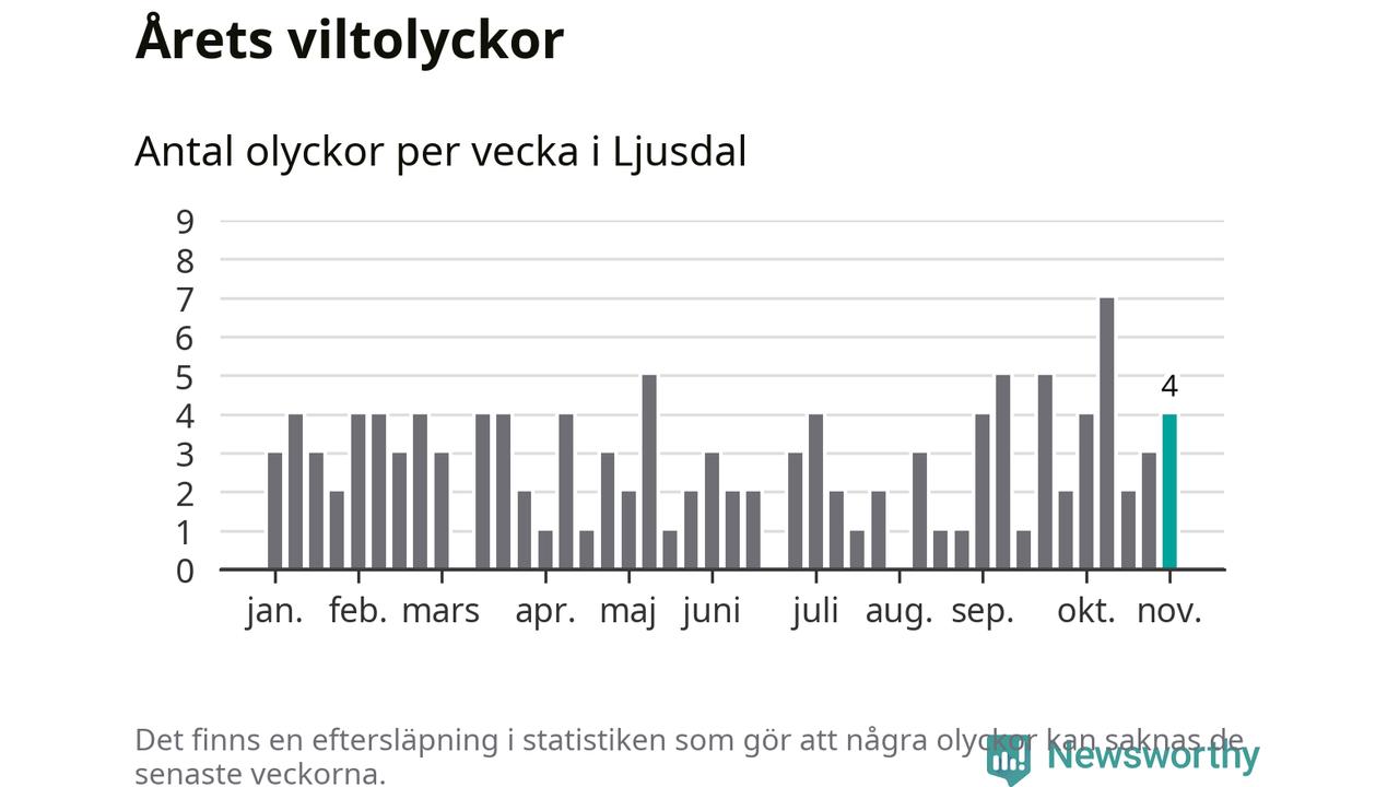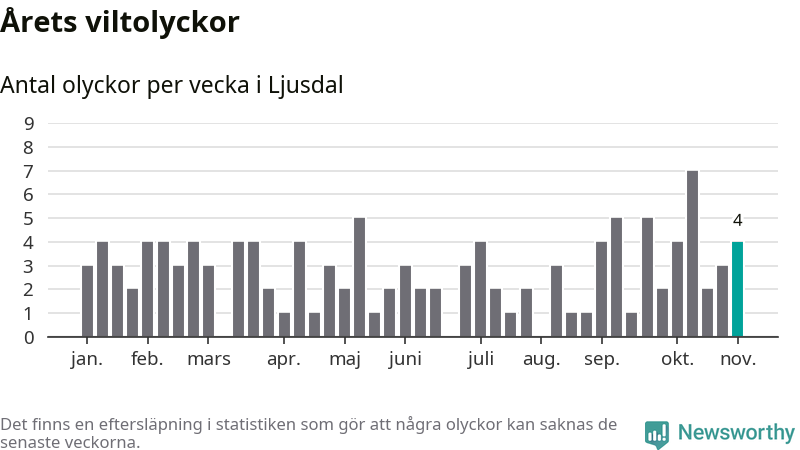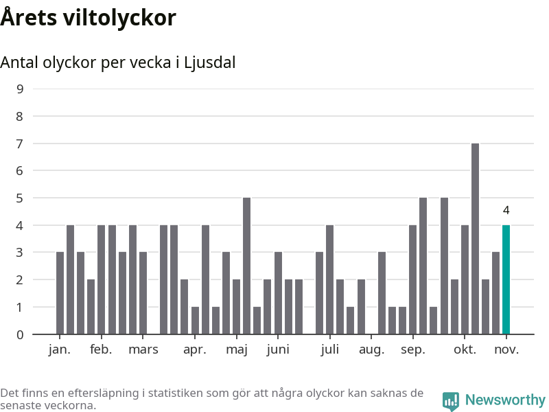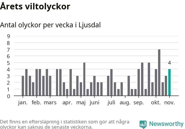 Hittills har fyra viltolyckor rapporterats in i Ljusdals kommun från vecka 45. Se listan här.