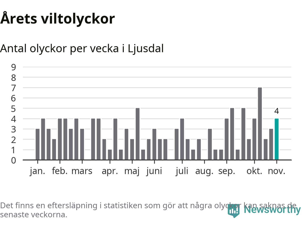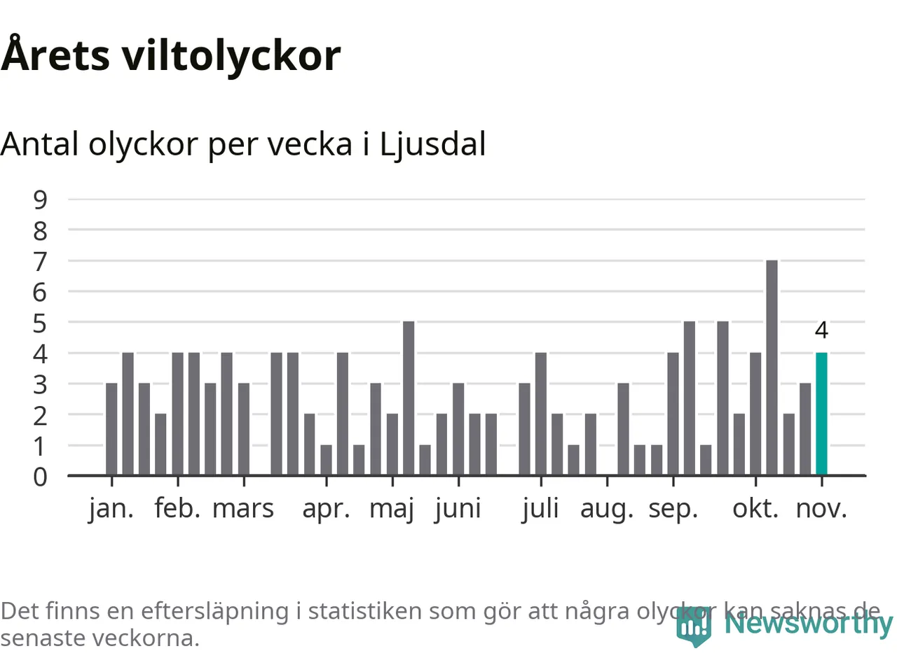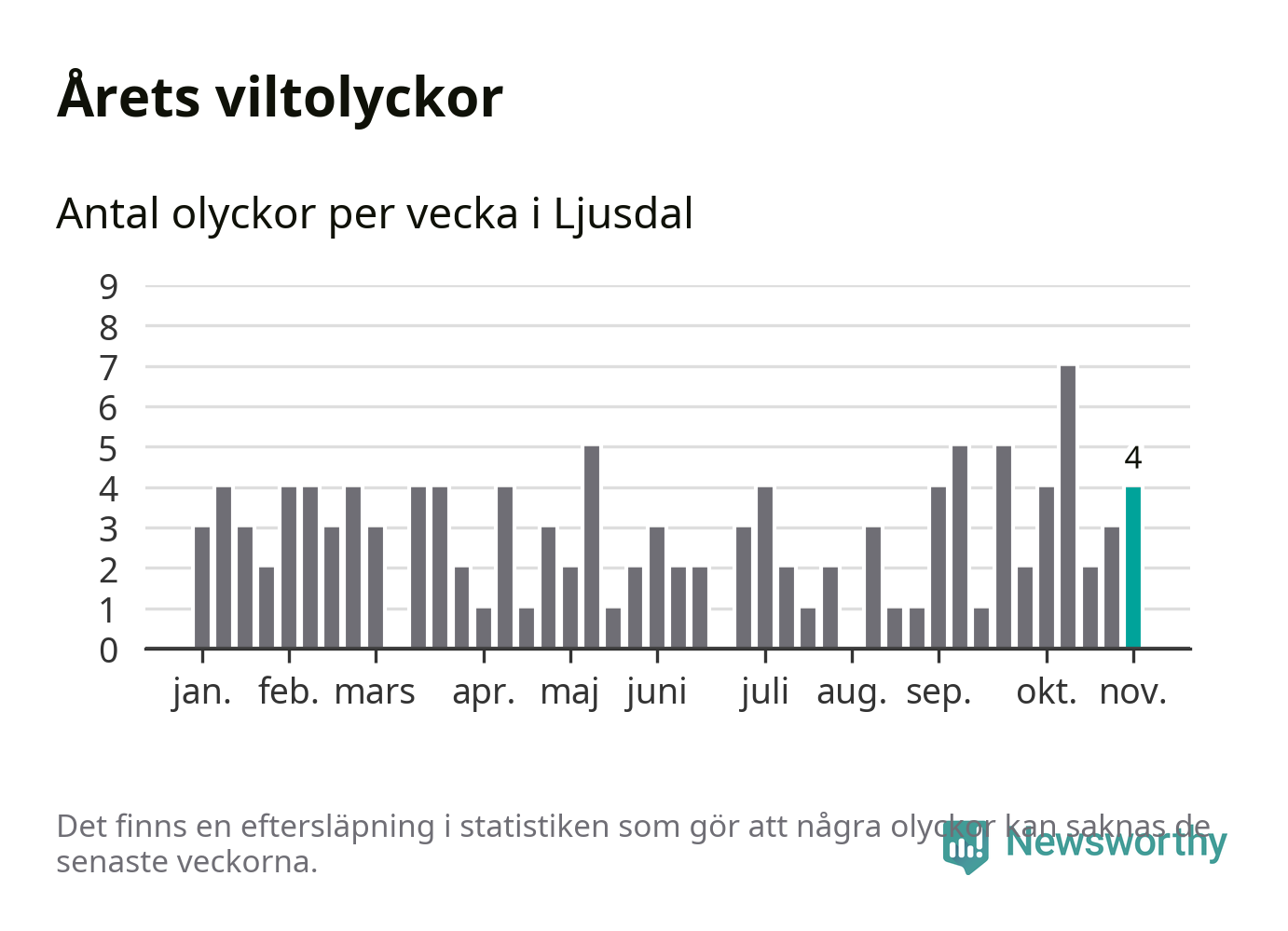 Hittills har fyra viltolyckor rapporterats in i Ljusdals kommun från vecka 45. Se listan här.