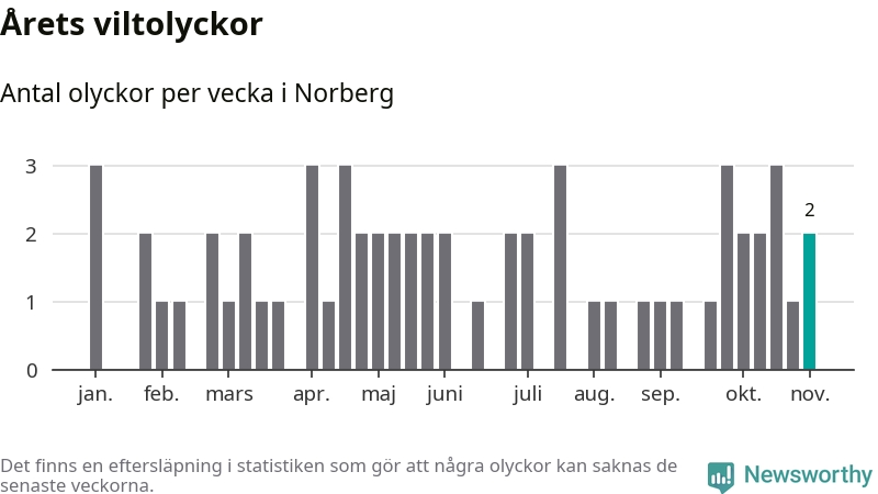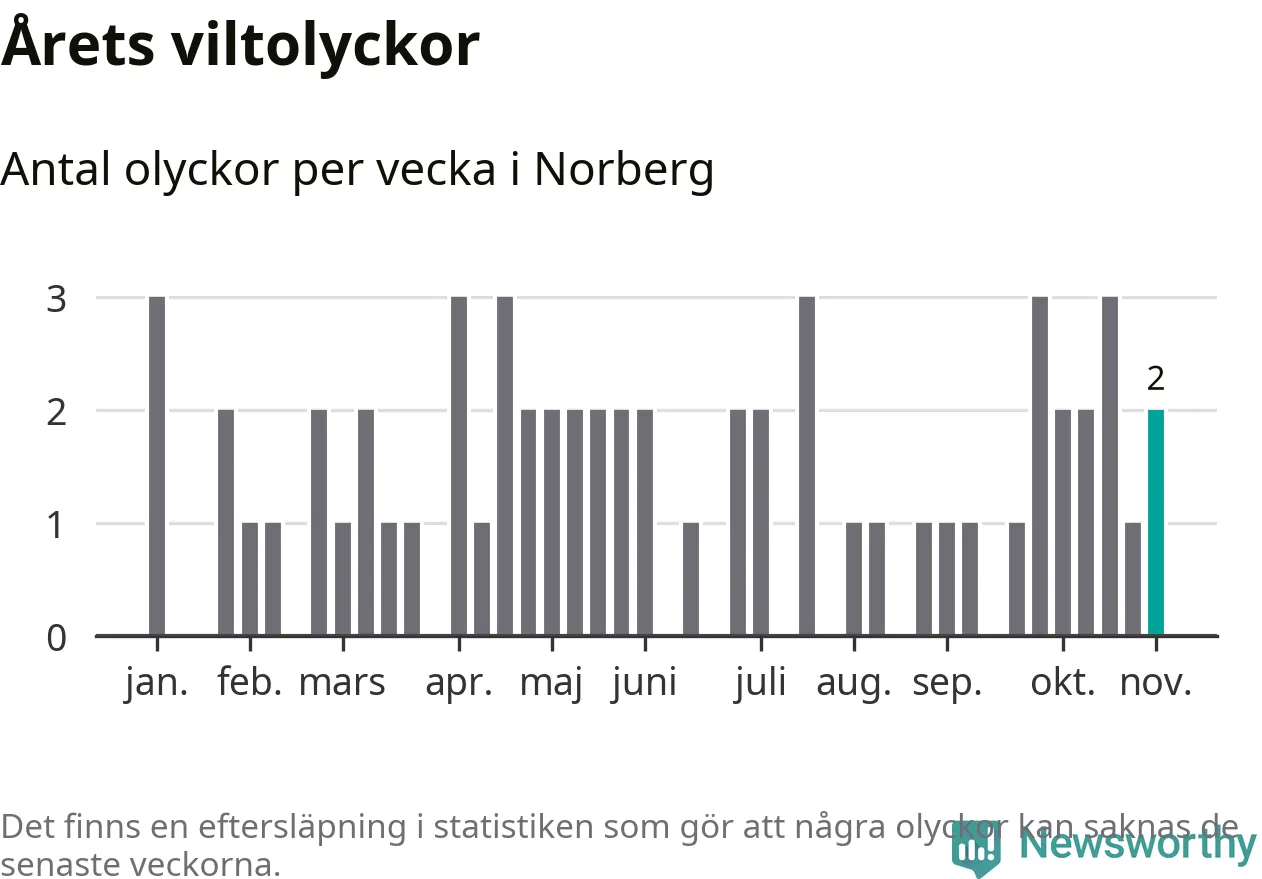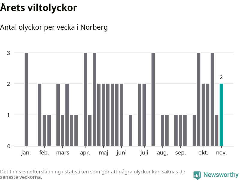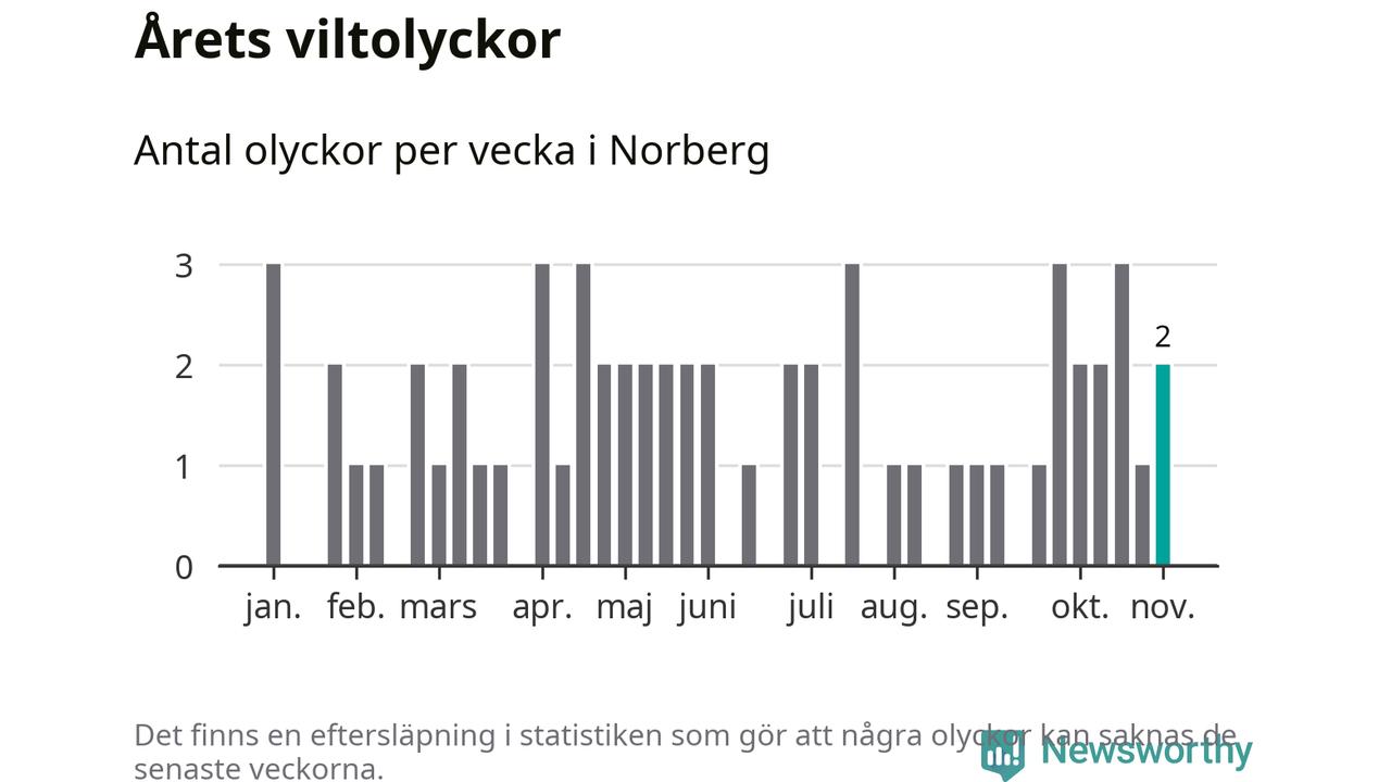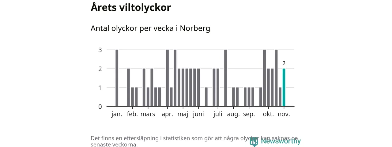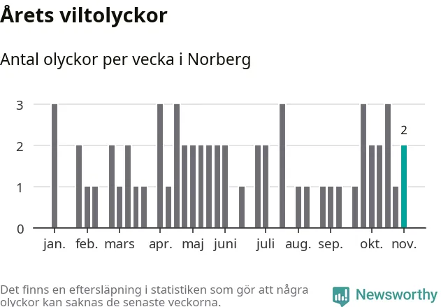 Hittills har två viltolyckor rapporterats in i Norbergs kommun från vecka 45. Se listan här.