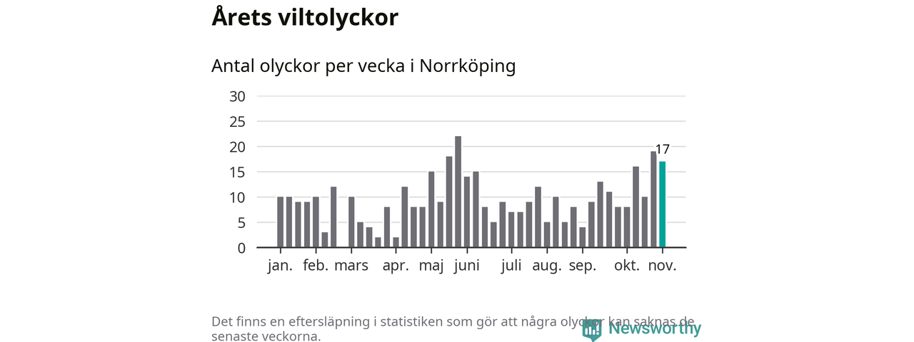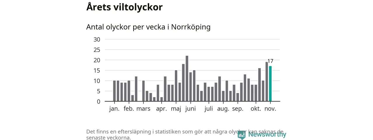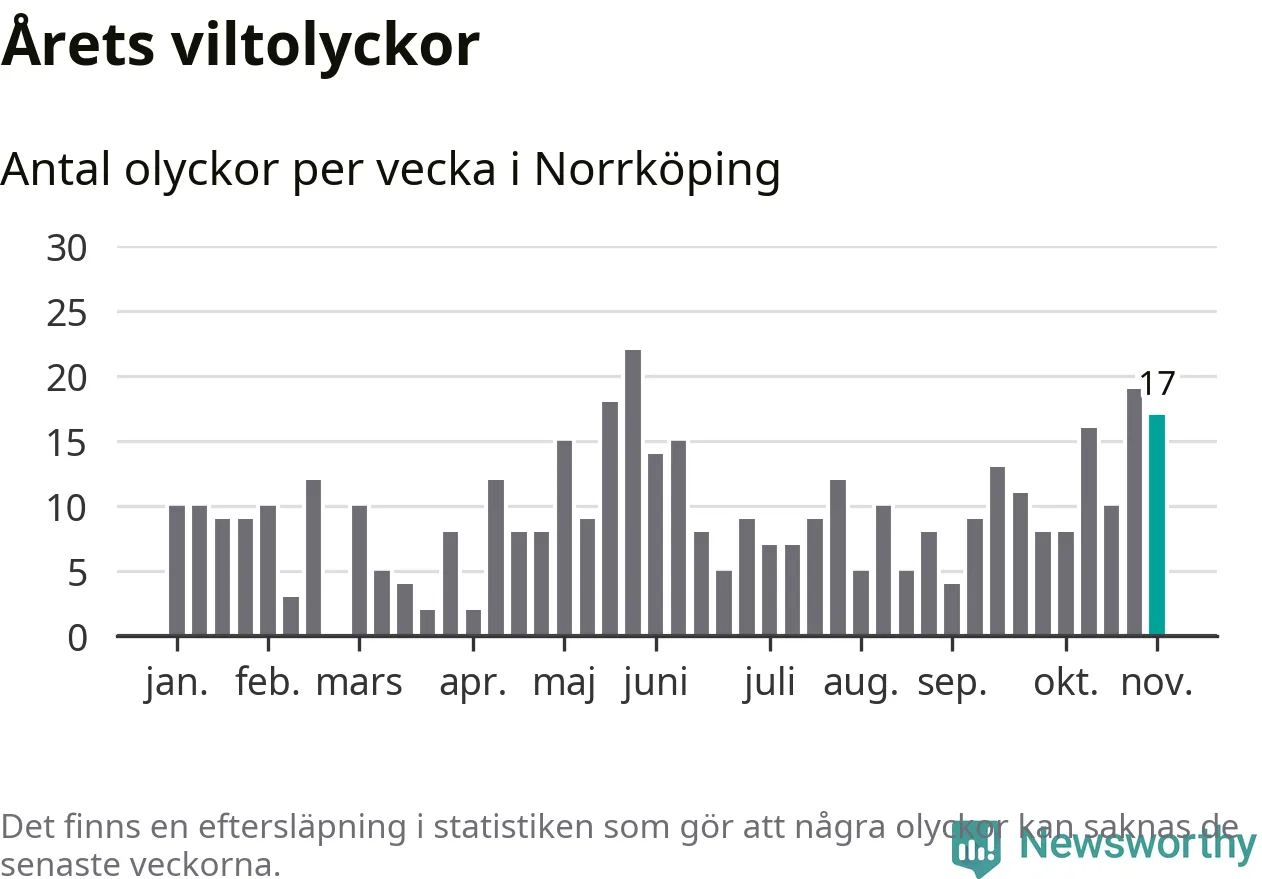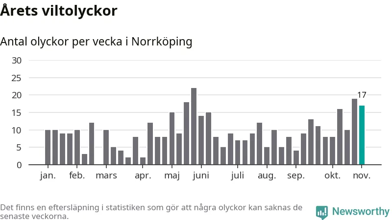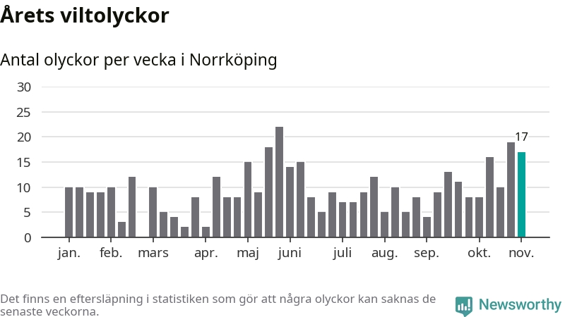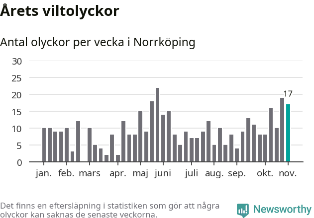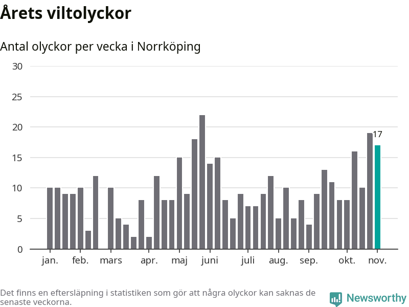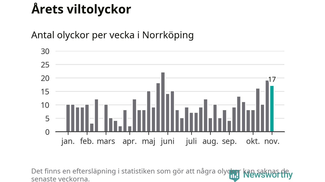 Hittills har 17 viltolyckor rapporterats in i Norrköpings kommun från vecka 45. Se listan här.
