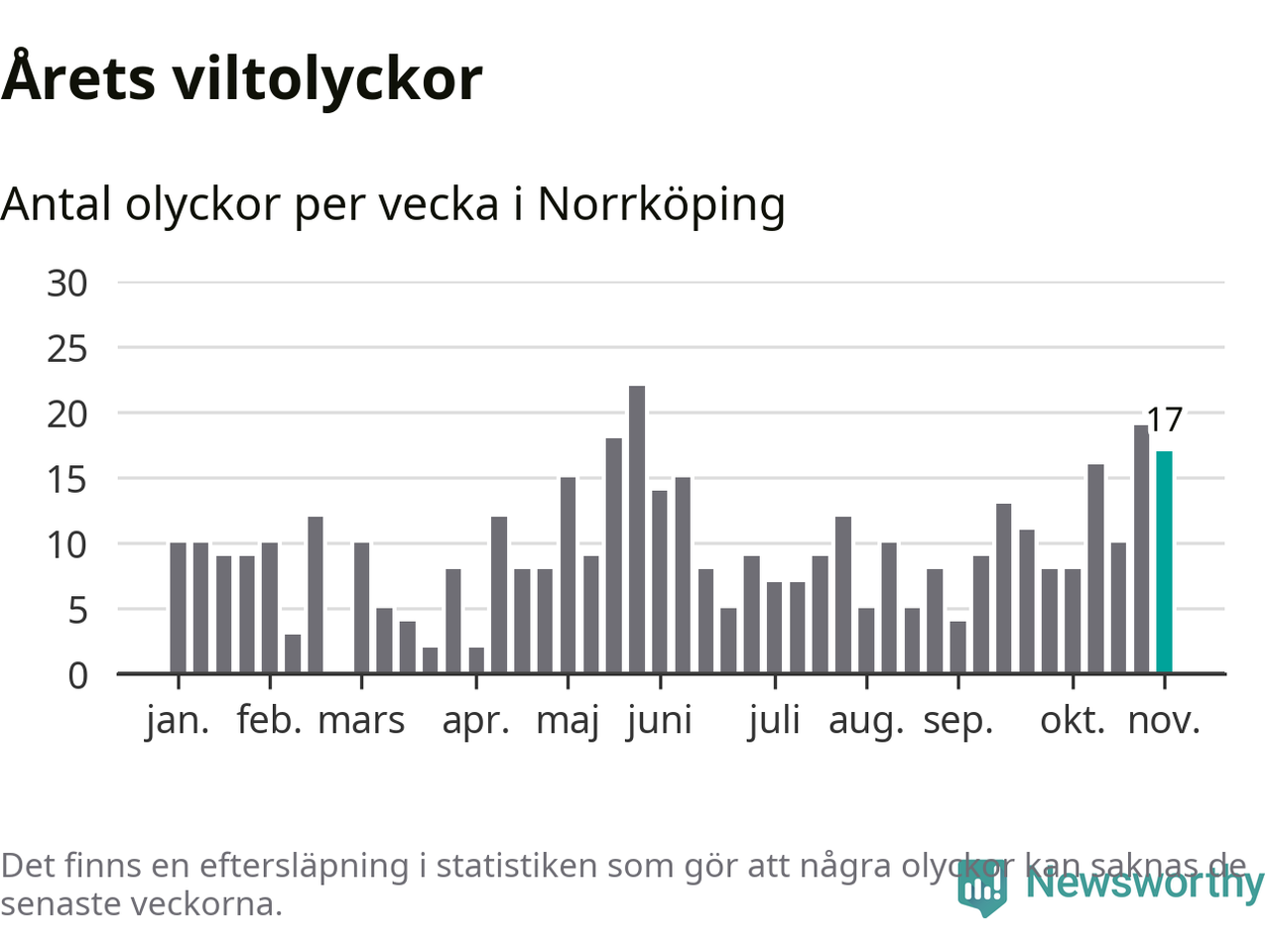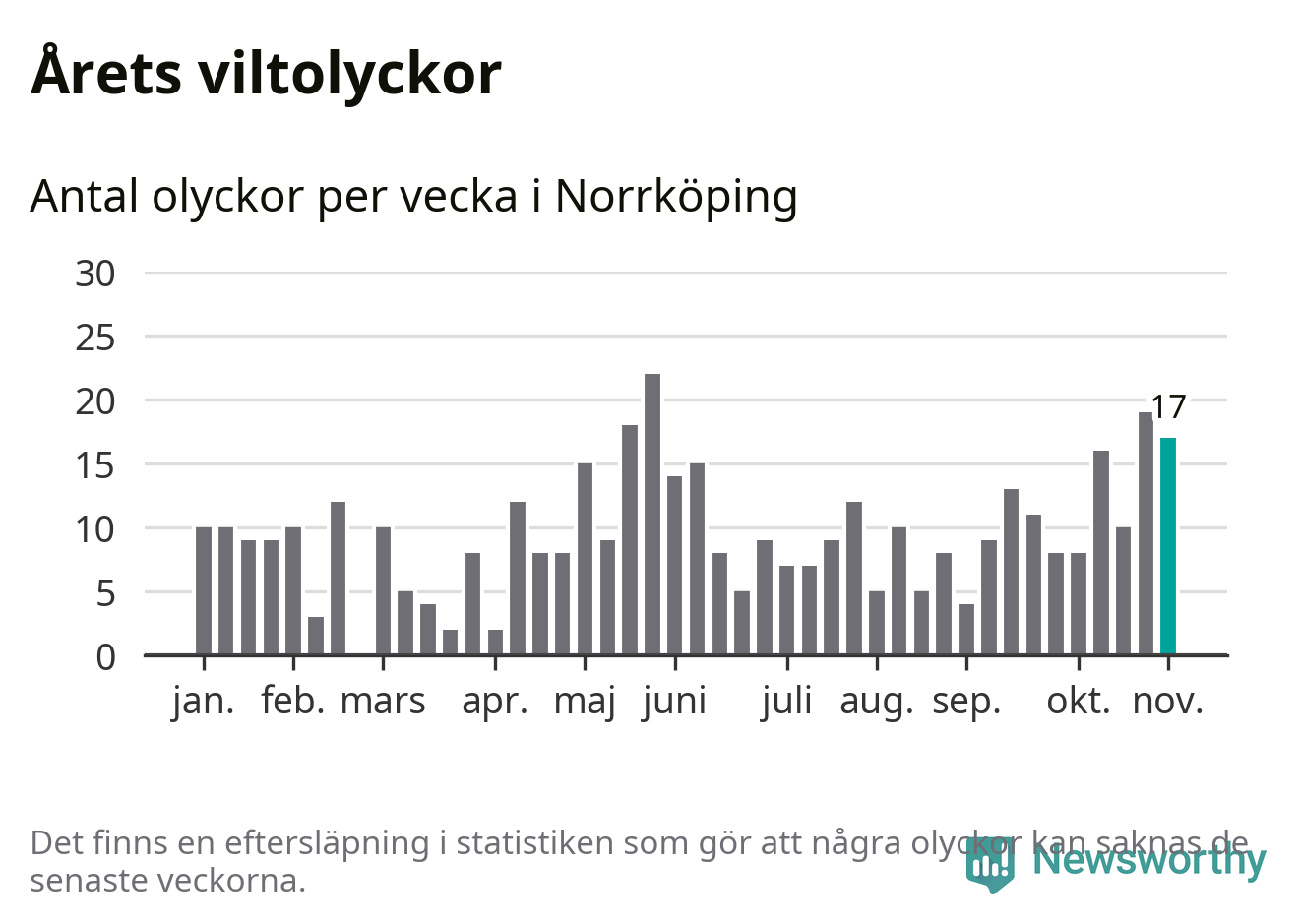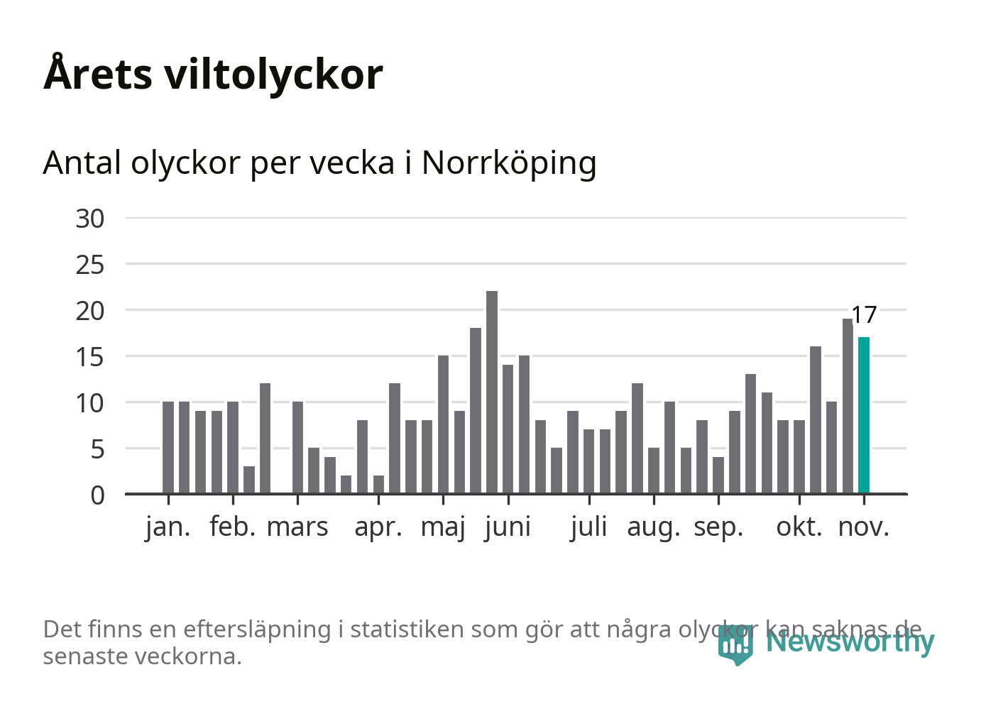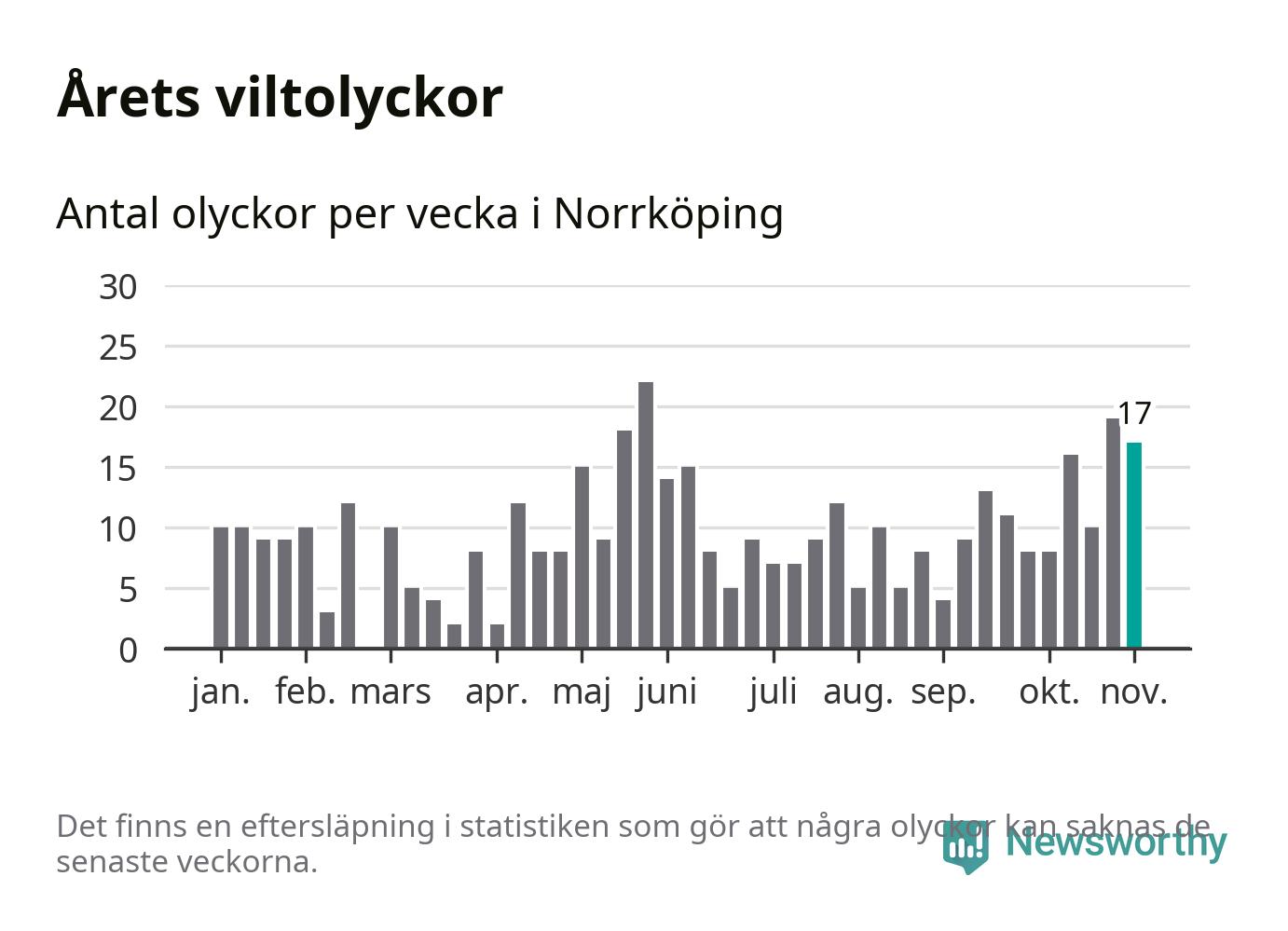 Hittills har 17 viltolyckor rapporterats in i Norrköpings kommun från vecka 45. Se listan här.