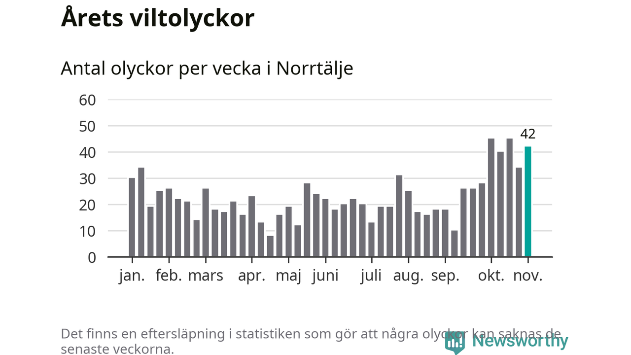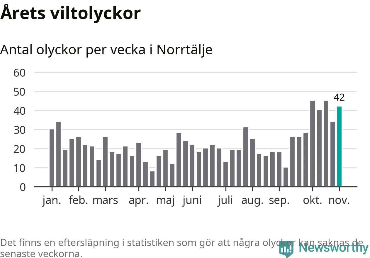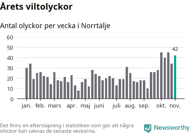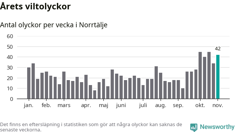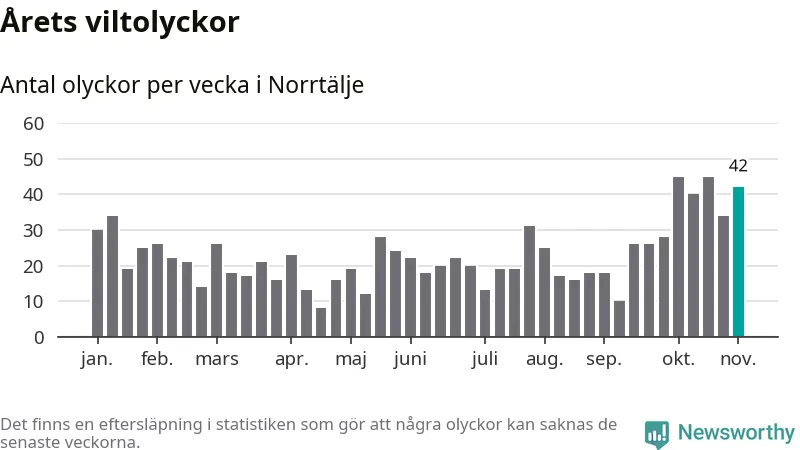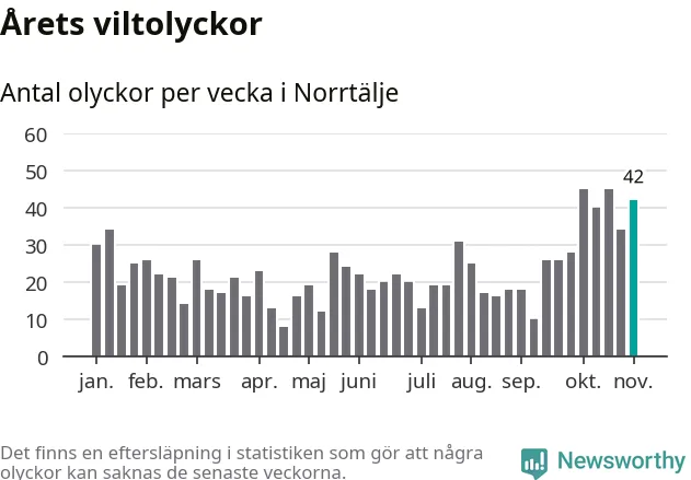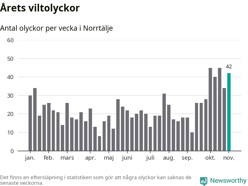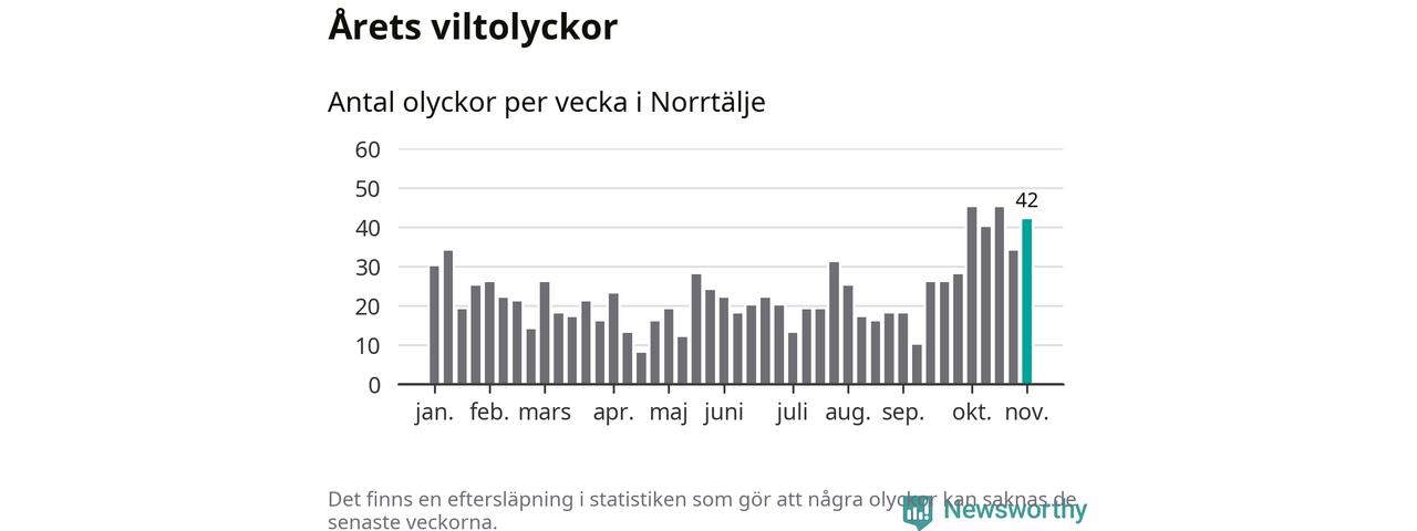 Hittills har 42 viltolyckor rapporterats in i Norrtälje kommun från vecka 45. Det är en av de högsta siffrorna för en enskild vecka på över tio år.