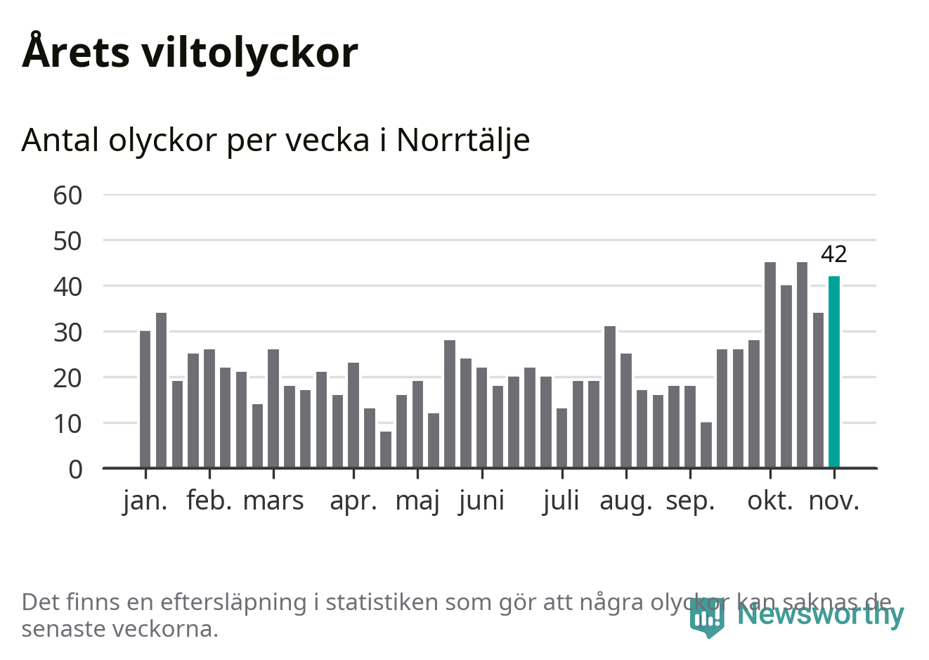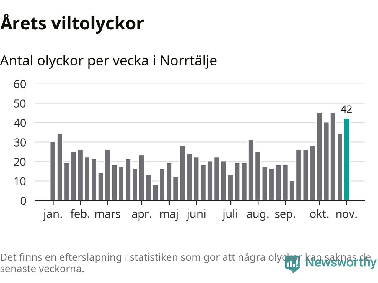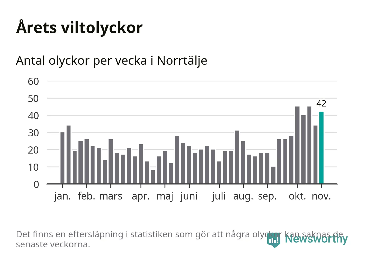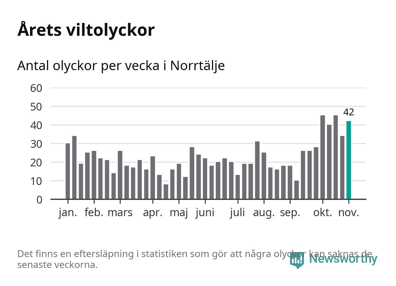 Hittills har 42 viltolyckor rapporterats in i Norrtälje kommun från vecka 45. Det är en av de högsta siffrorna för en enskild vecka på över tio år.