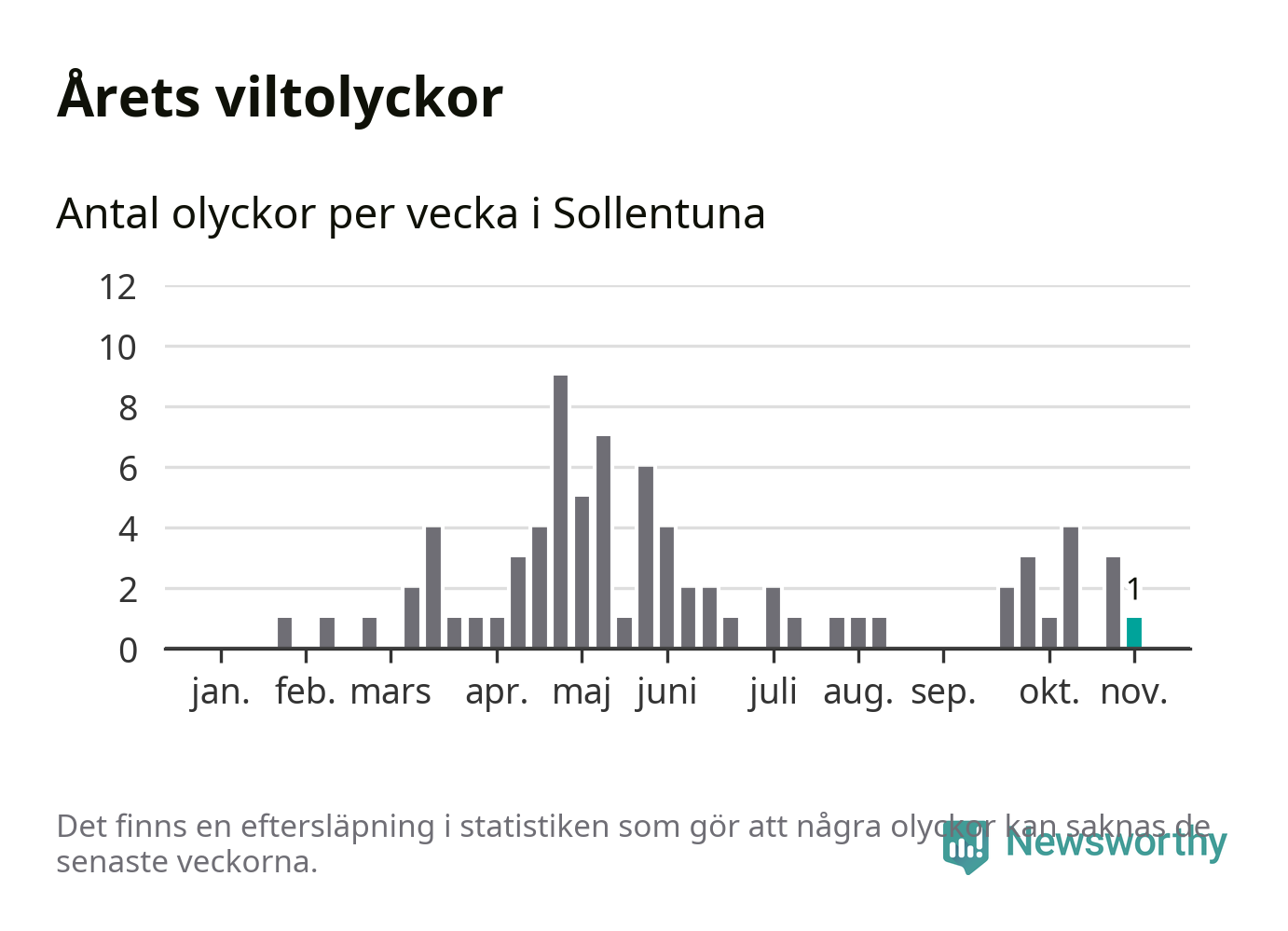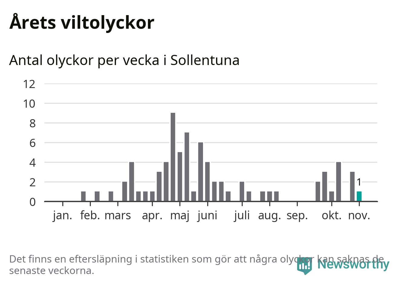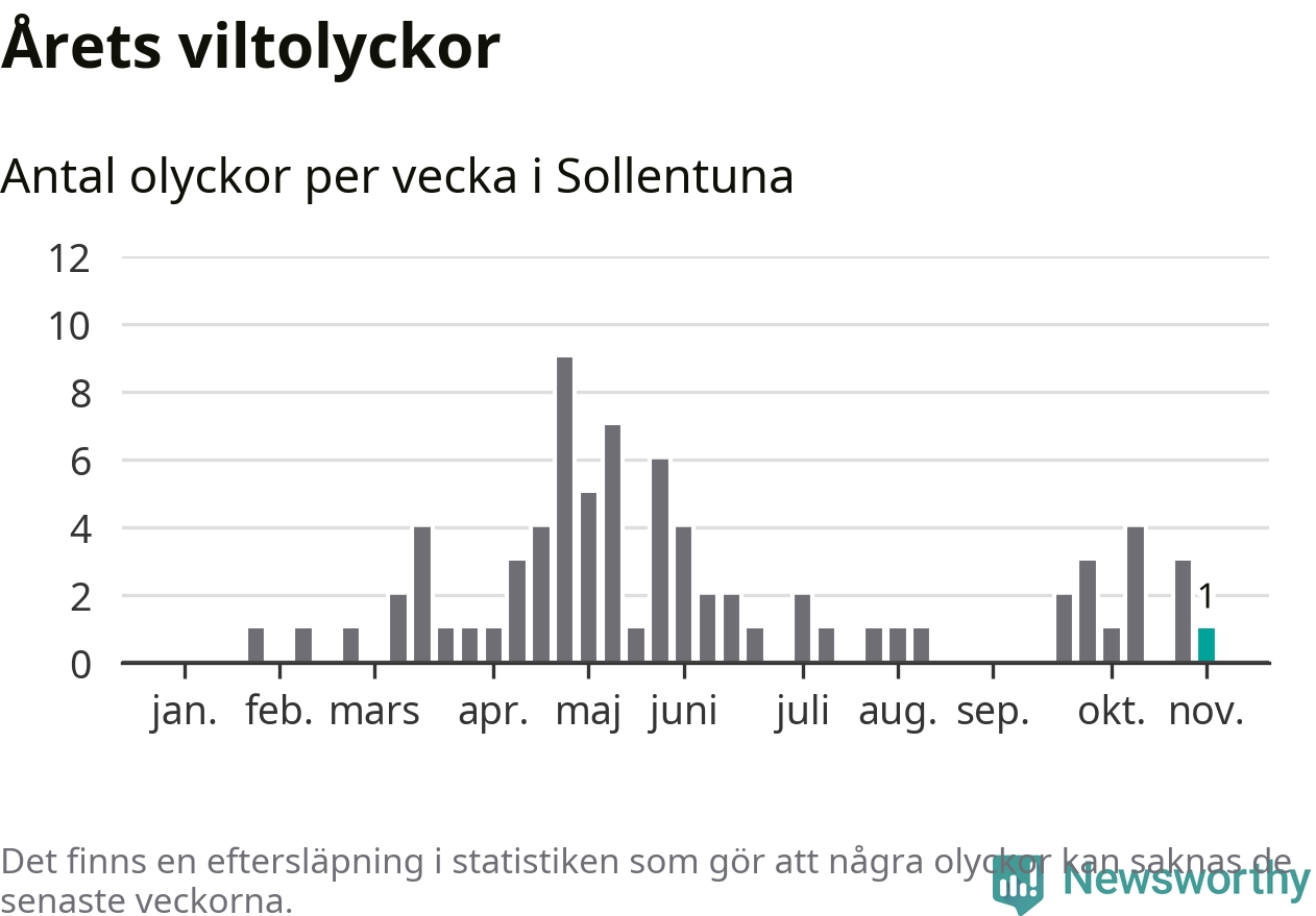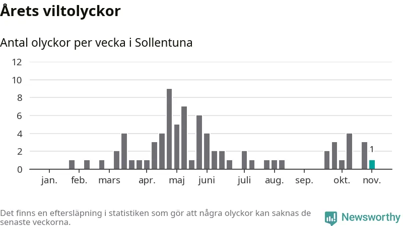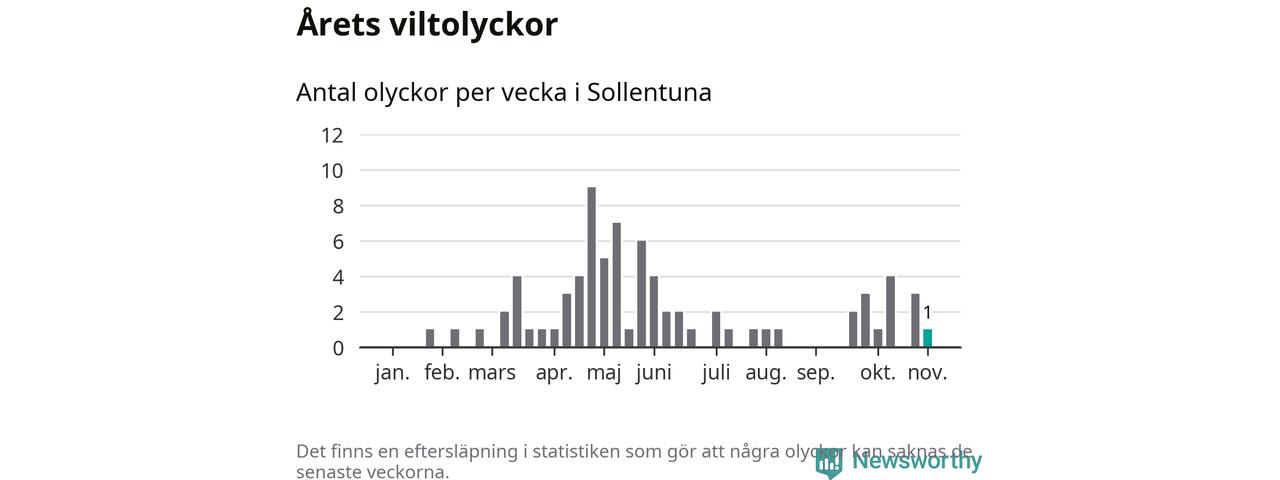 Från förra veckan (vecka 45) har hittills en viltolycka rapporterats in i Sollentuna kommun.