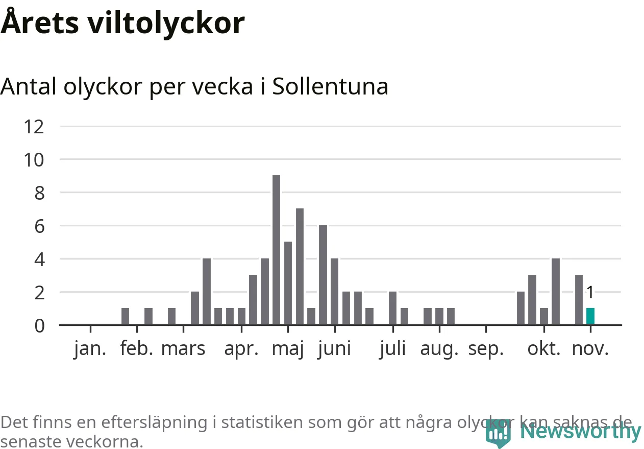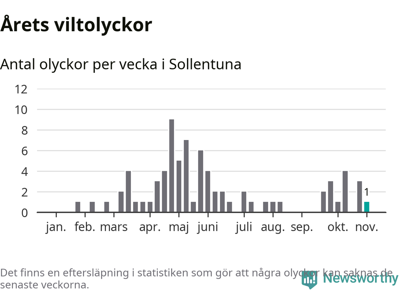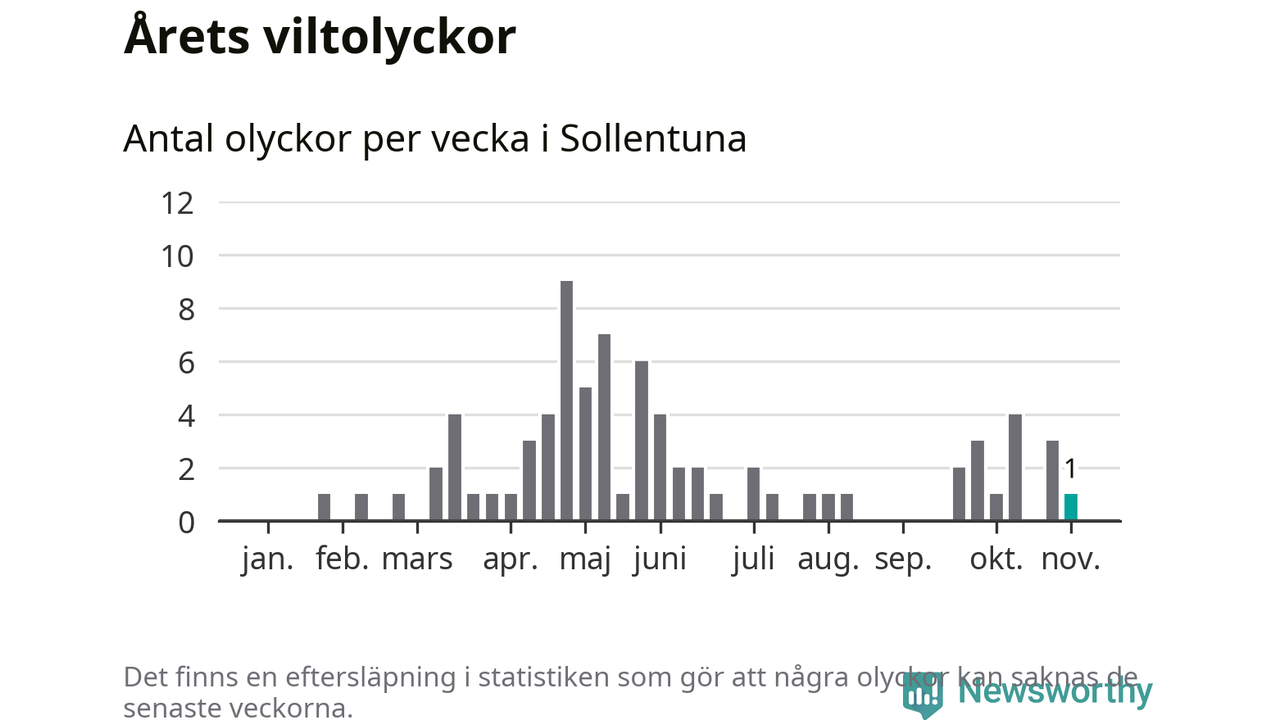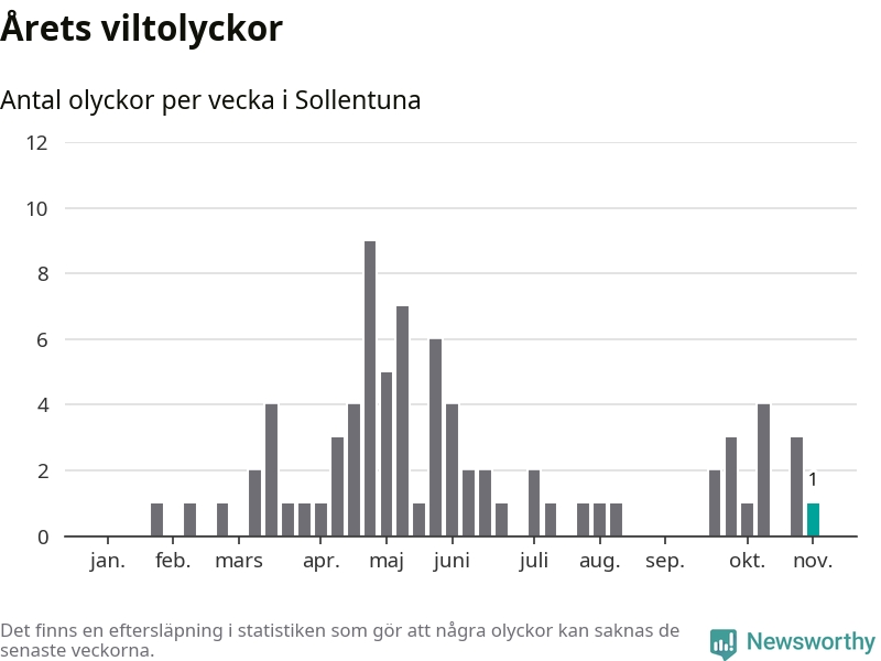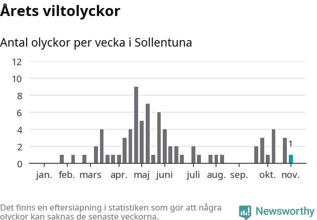 Från förra veckan (vecka 45) har hittills en viltolycka rapporterats in i Sollentuna kommun.