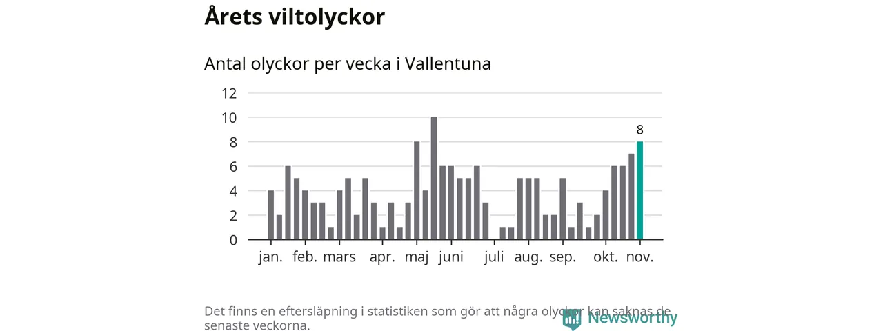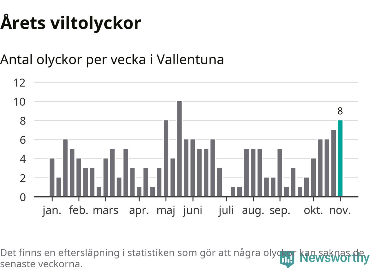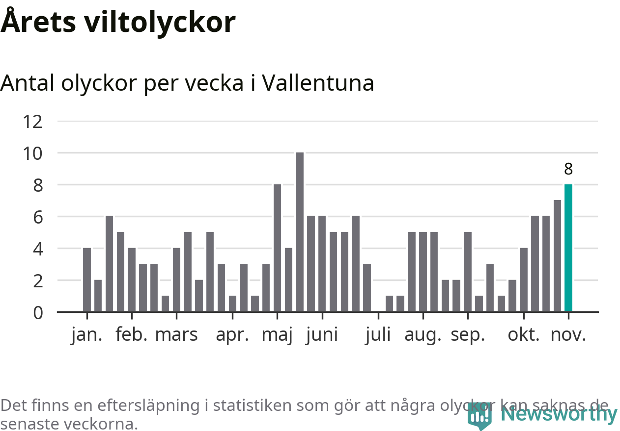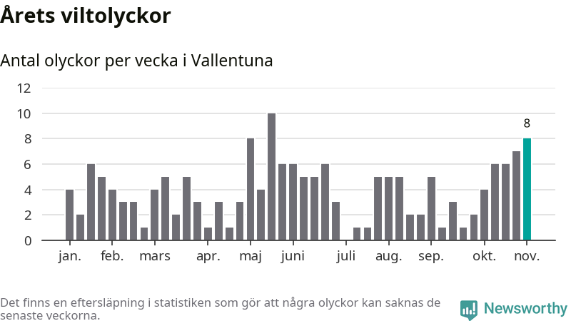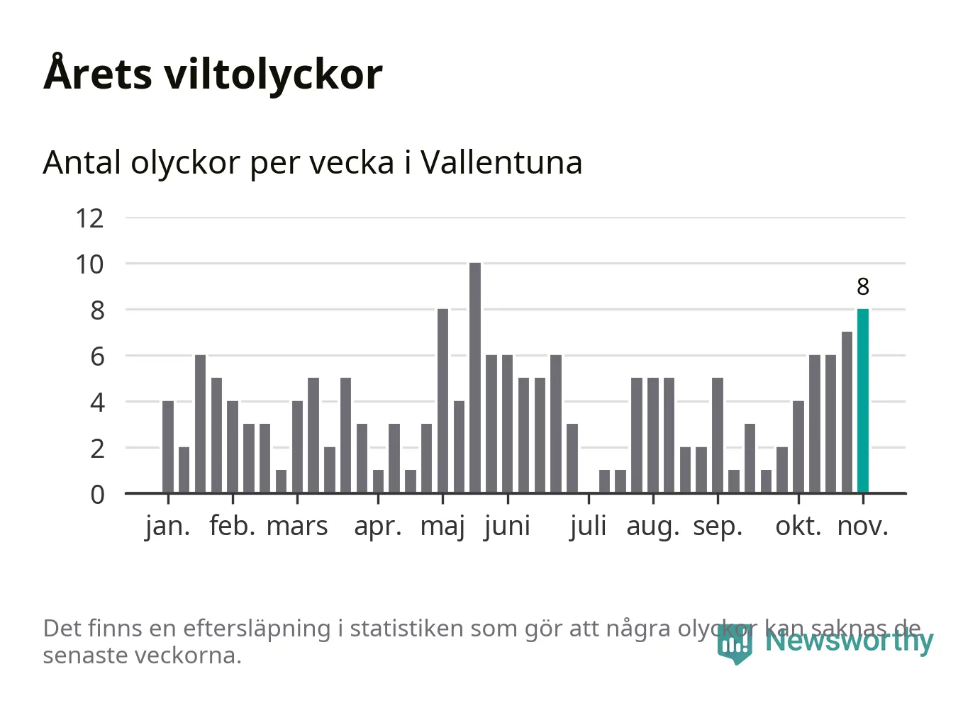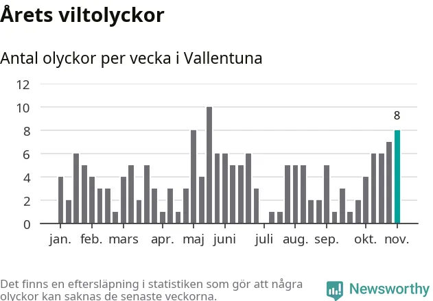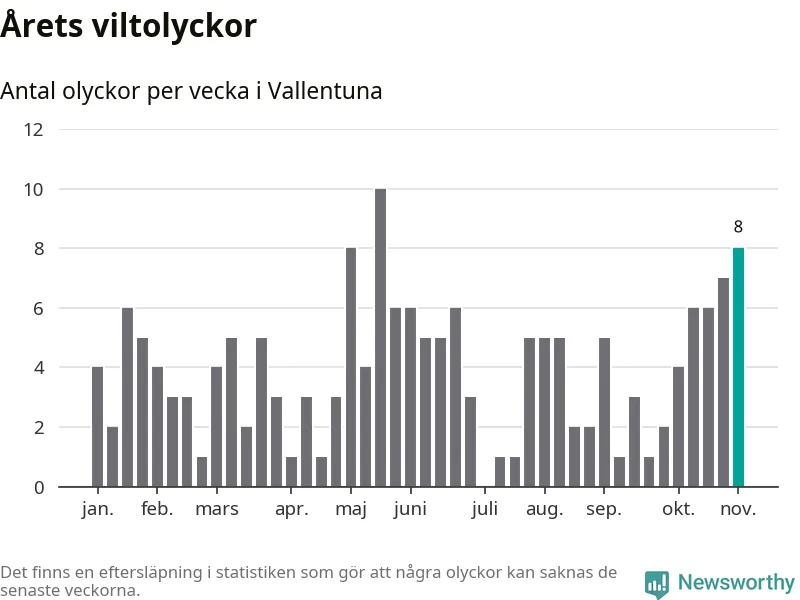Åtta olyckor på en enda vecka är också ovanligt många. Bara sju gånger tidigare sedan 2015 har det skett