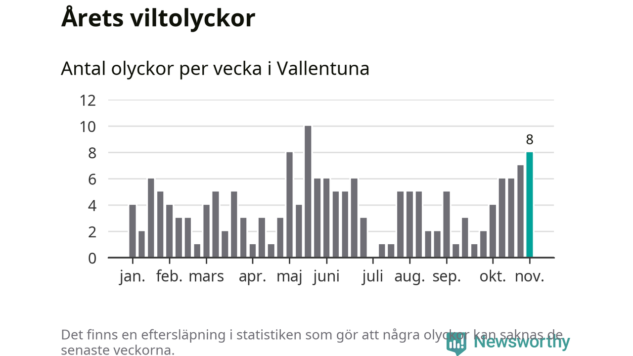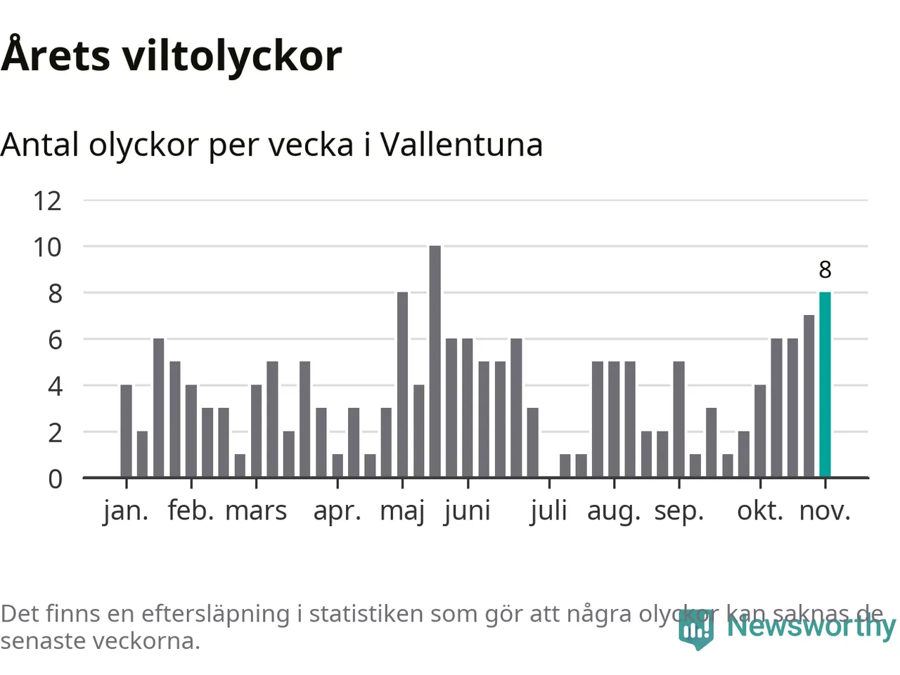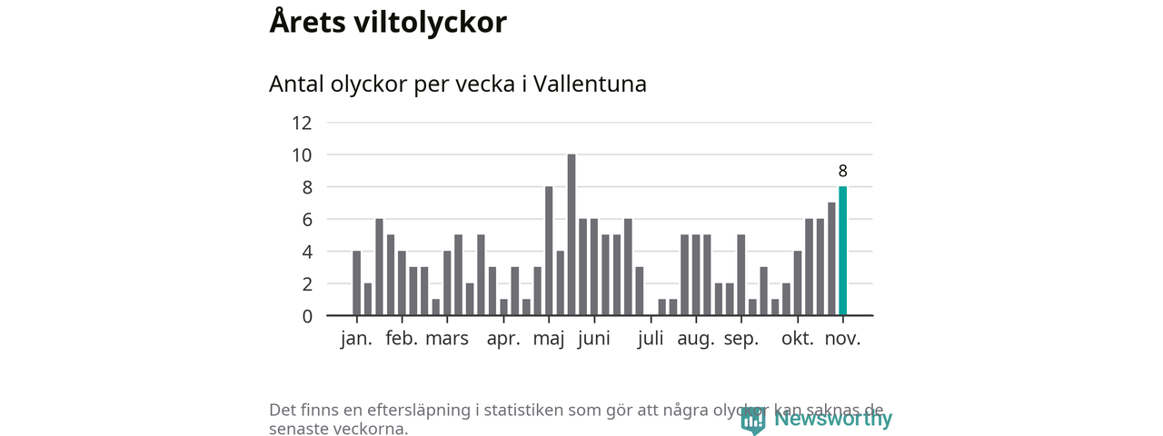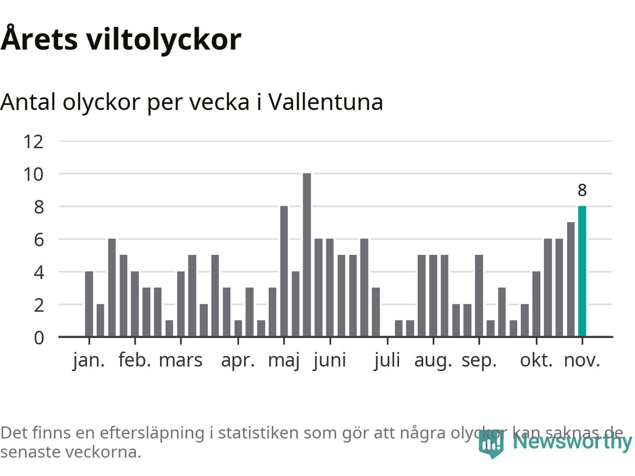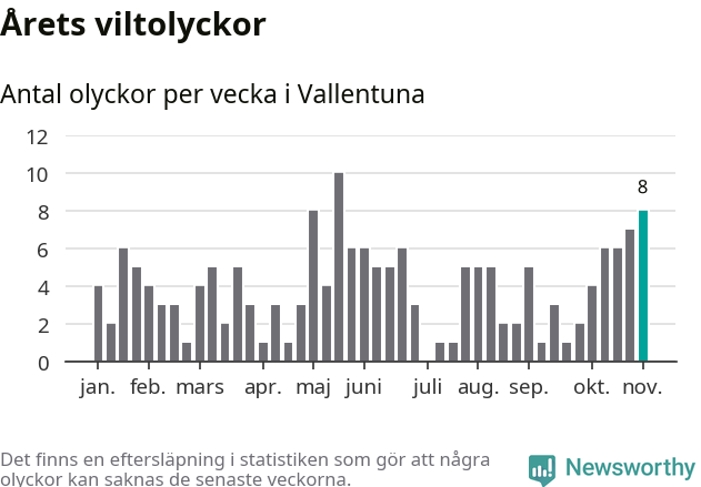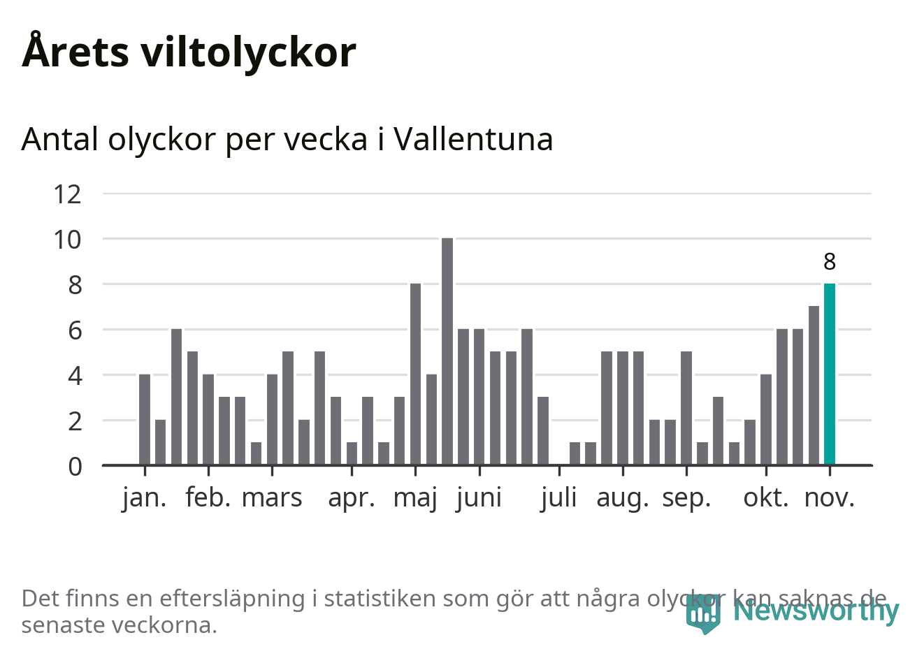 178 viltolyckor i kommunen. Det är mer än genomsnittet för motsvarande period (omkring 124) de senaste tio åren.
