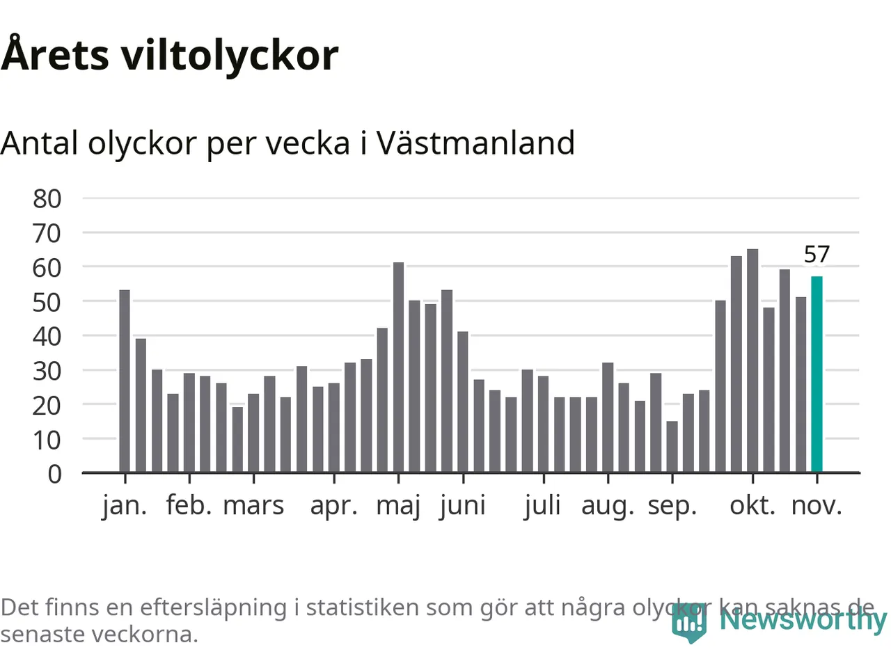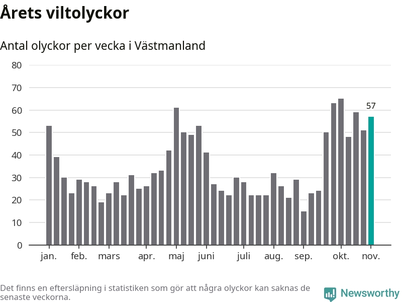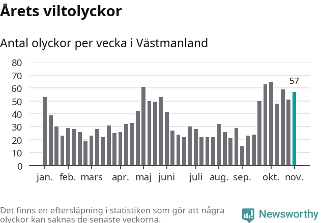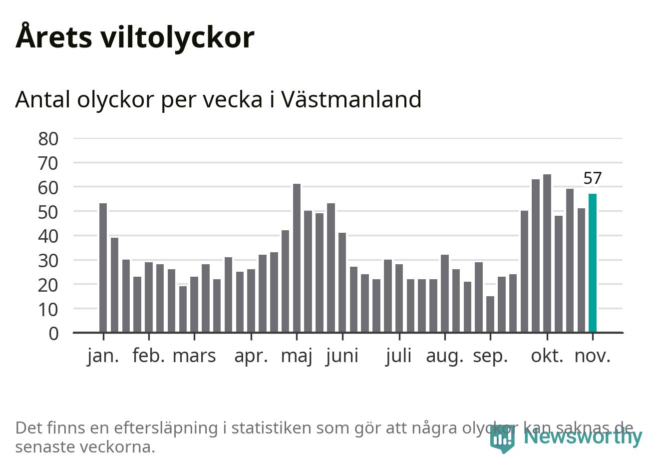 Hittills har 57 viltolyckor rapporterats in i Västmanlands län från vecka 45. Se listan här.