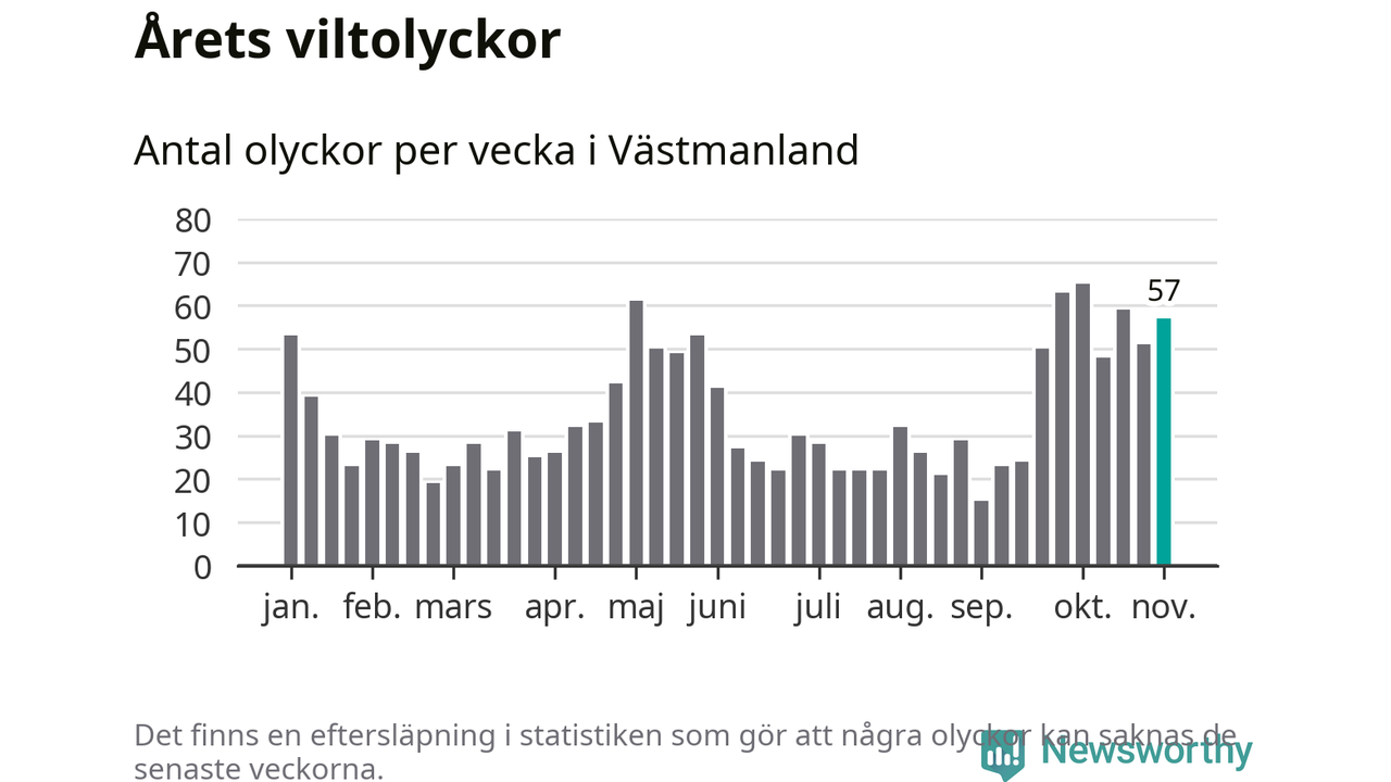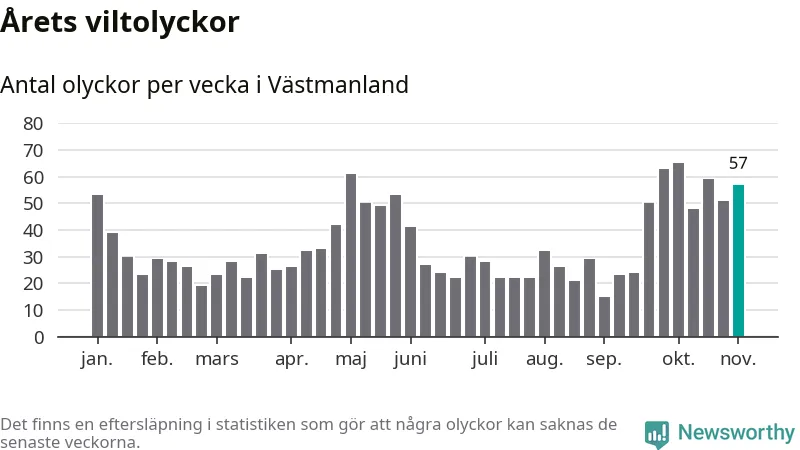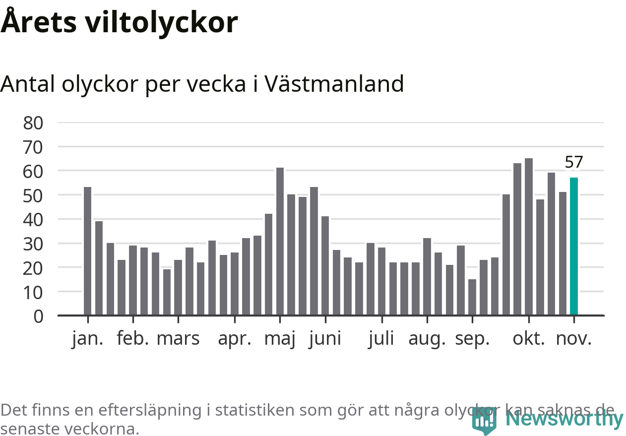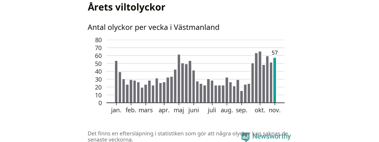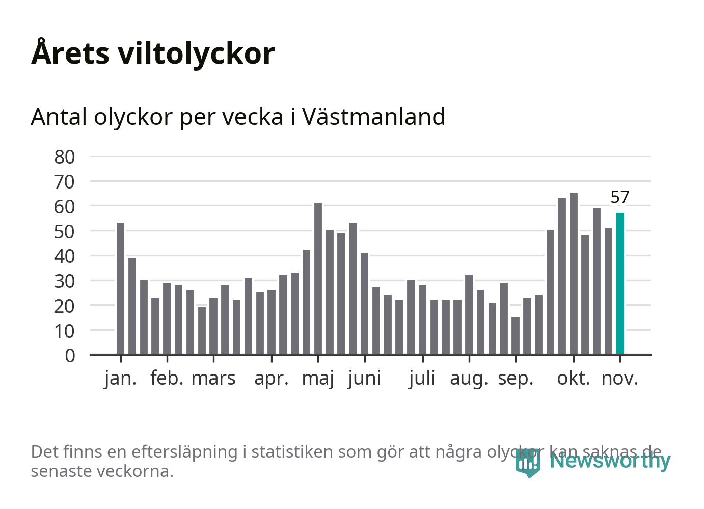 Hittills har 57 viltolyckor rapporterats in i Västmanlands län från vecka 45. Se listan här.