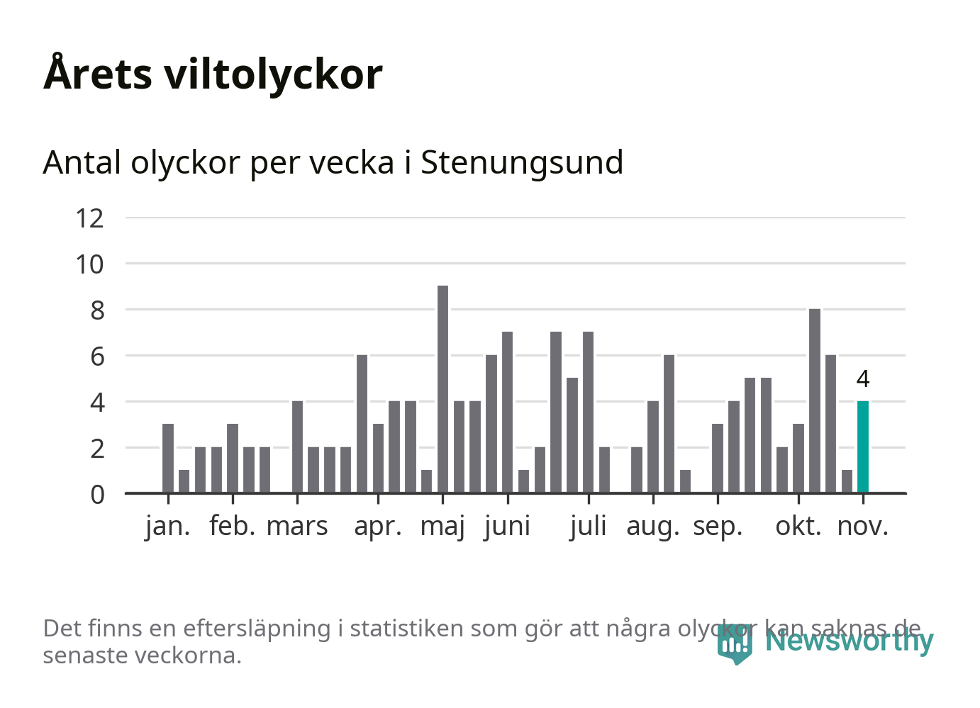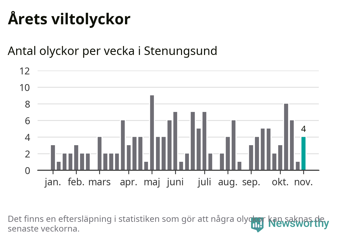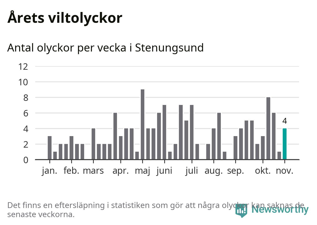 Hittills har fyra viltolyckor rapporterats in i Stenungsunds kommun från vecka 45. Se listan här.