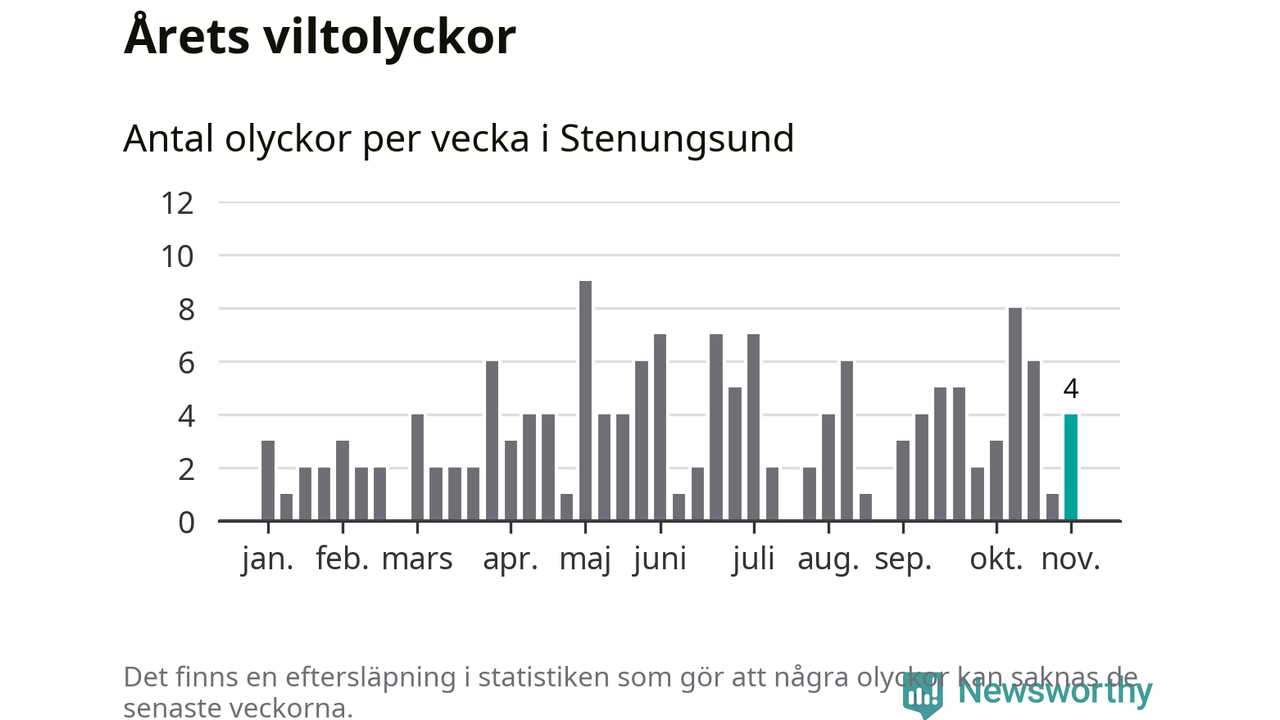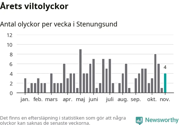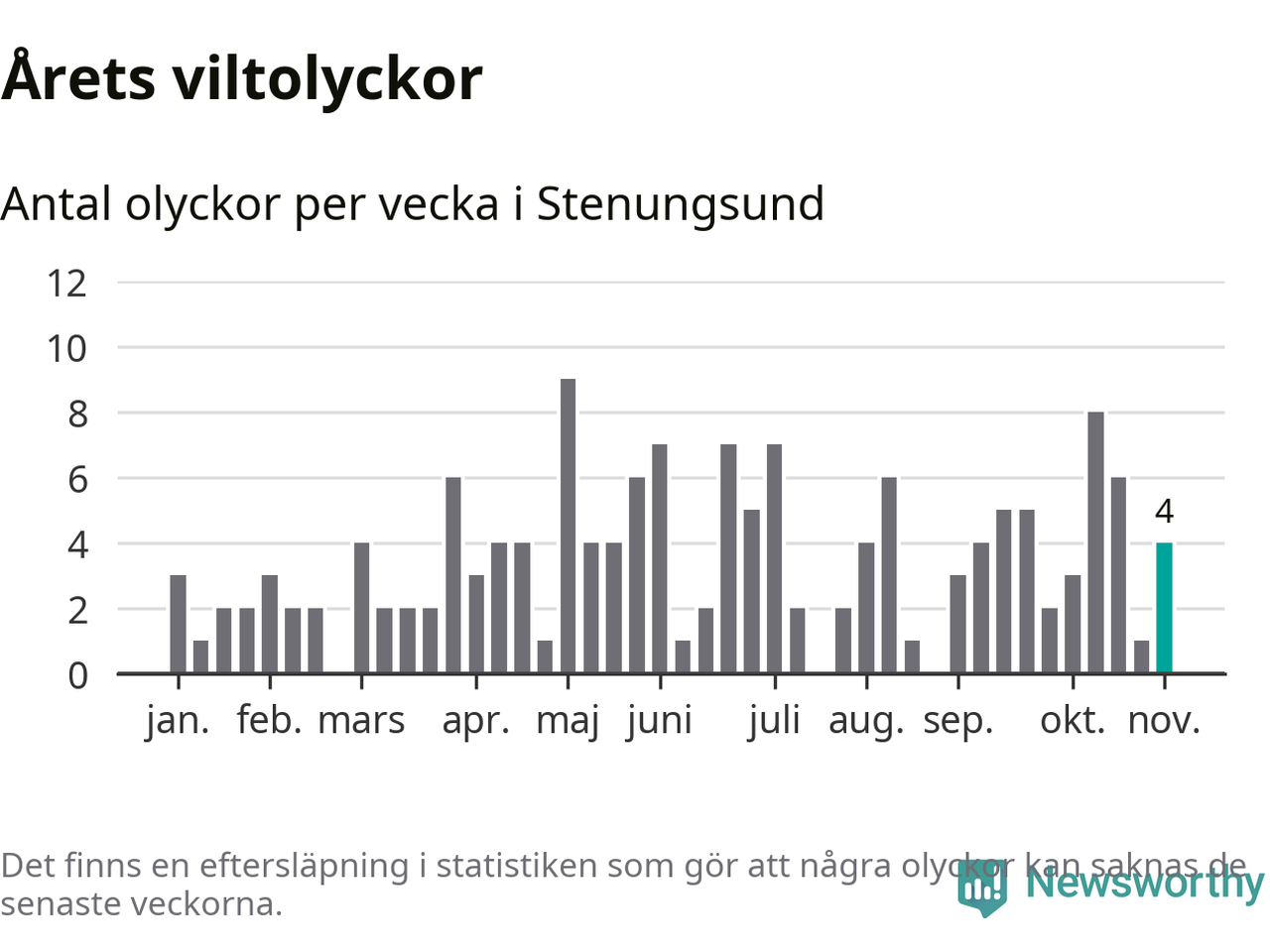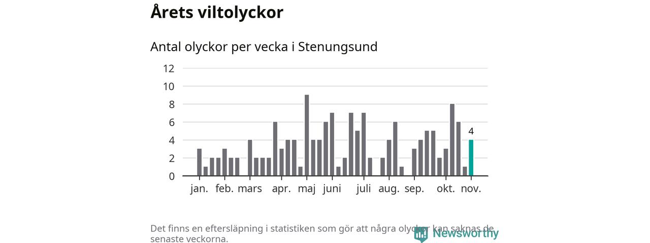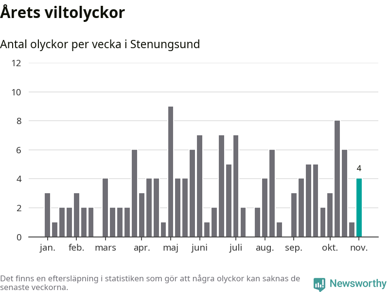 Hittills har fyra viltolyckor rapporterats in i Stenungsunds kommun från vecka 45. Se listan här.