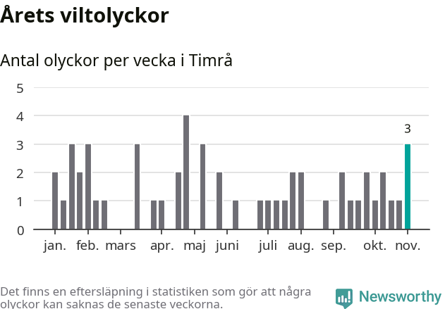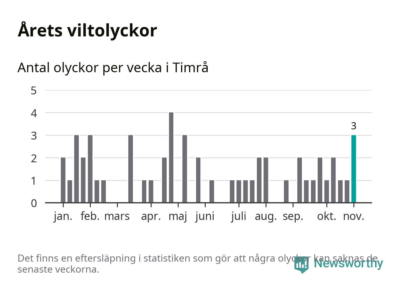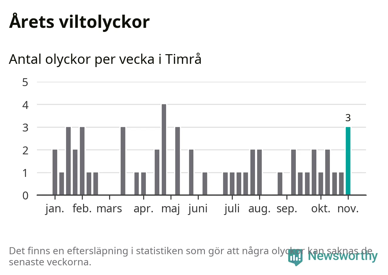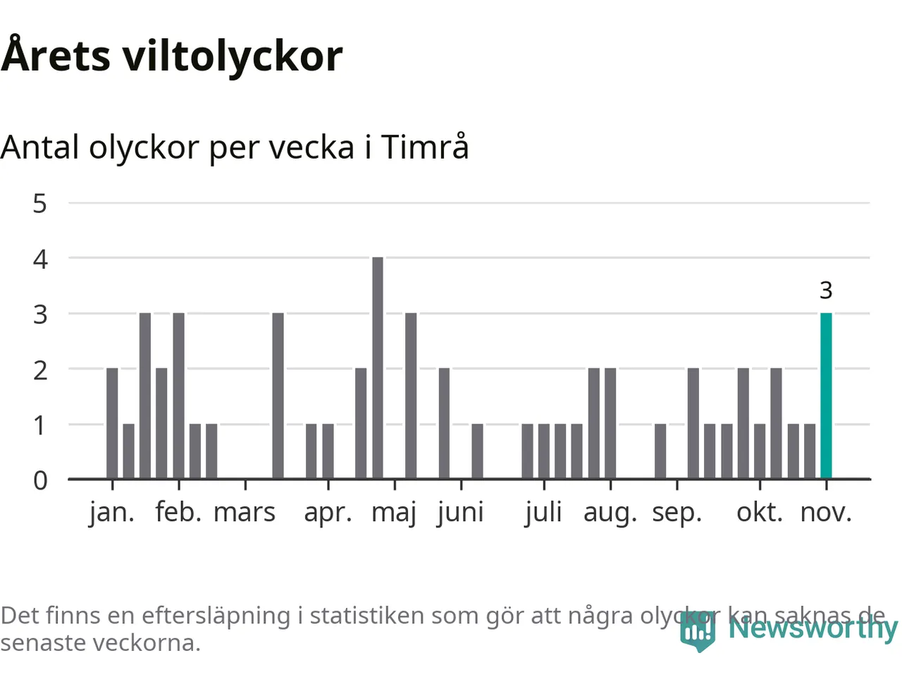 Hittills har tre viltolyckor rapporterats in i Timrå kommun från vecka 45. Se listan här.