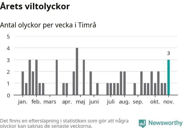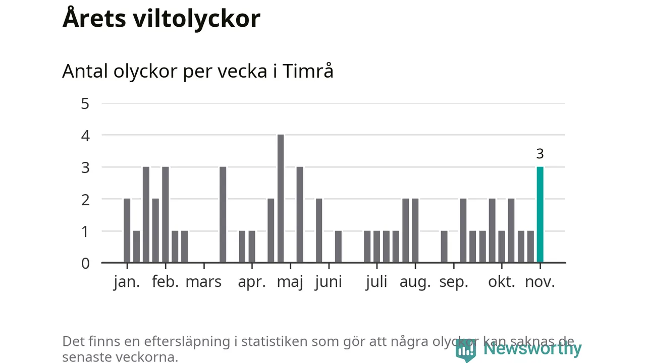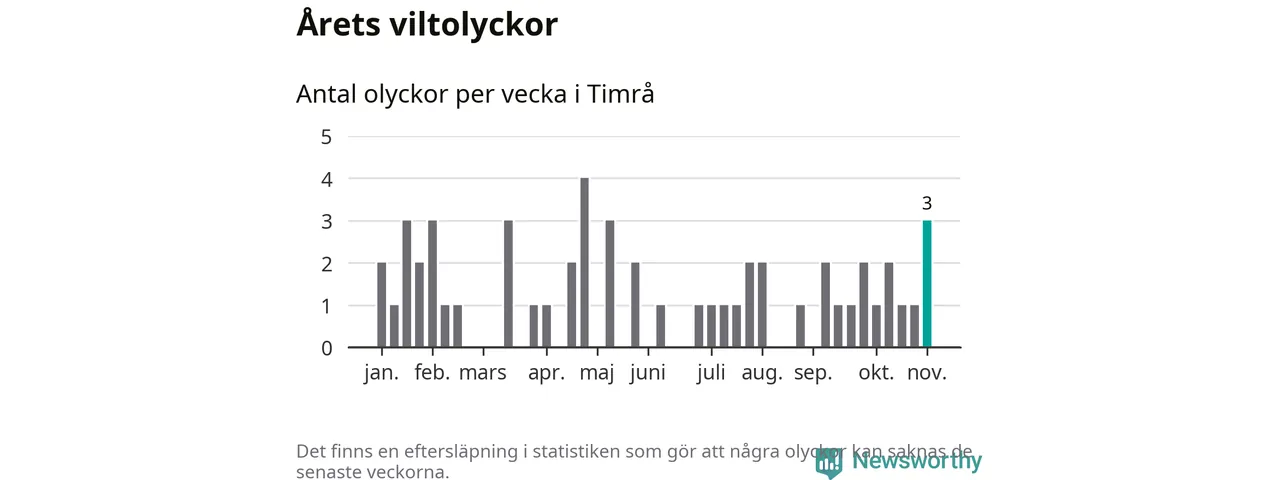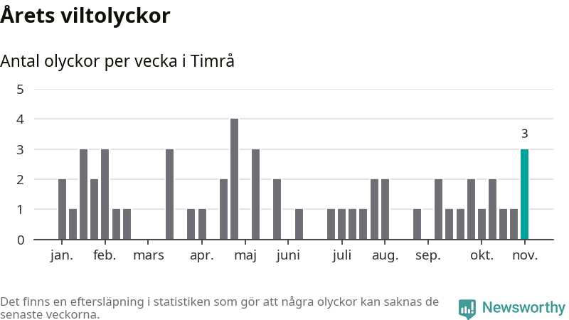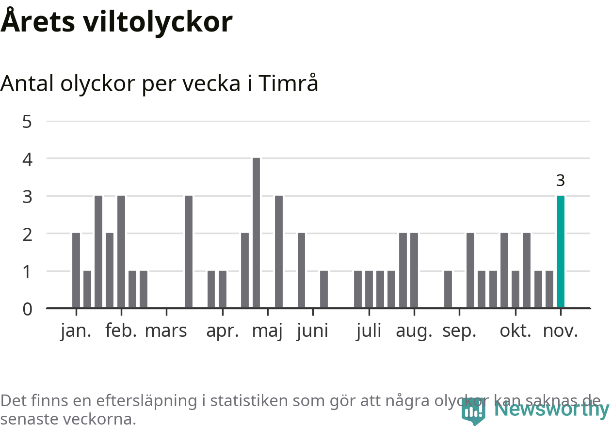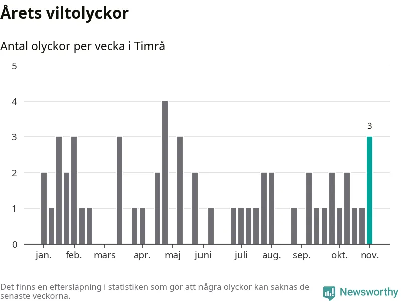 Hittills har tre viltolyckor rapporterats in i Timrå kommun från vecka 45. Se listan här.