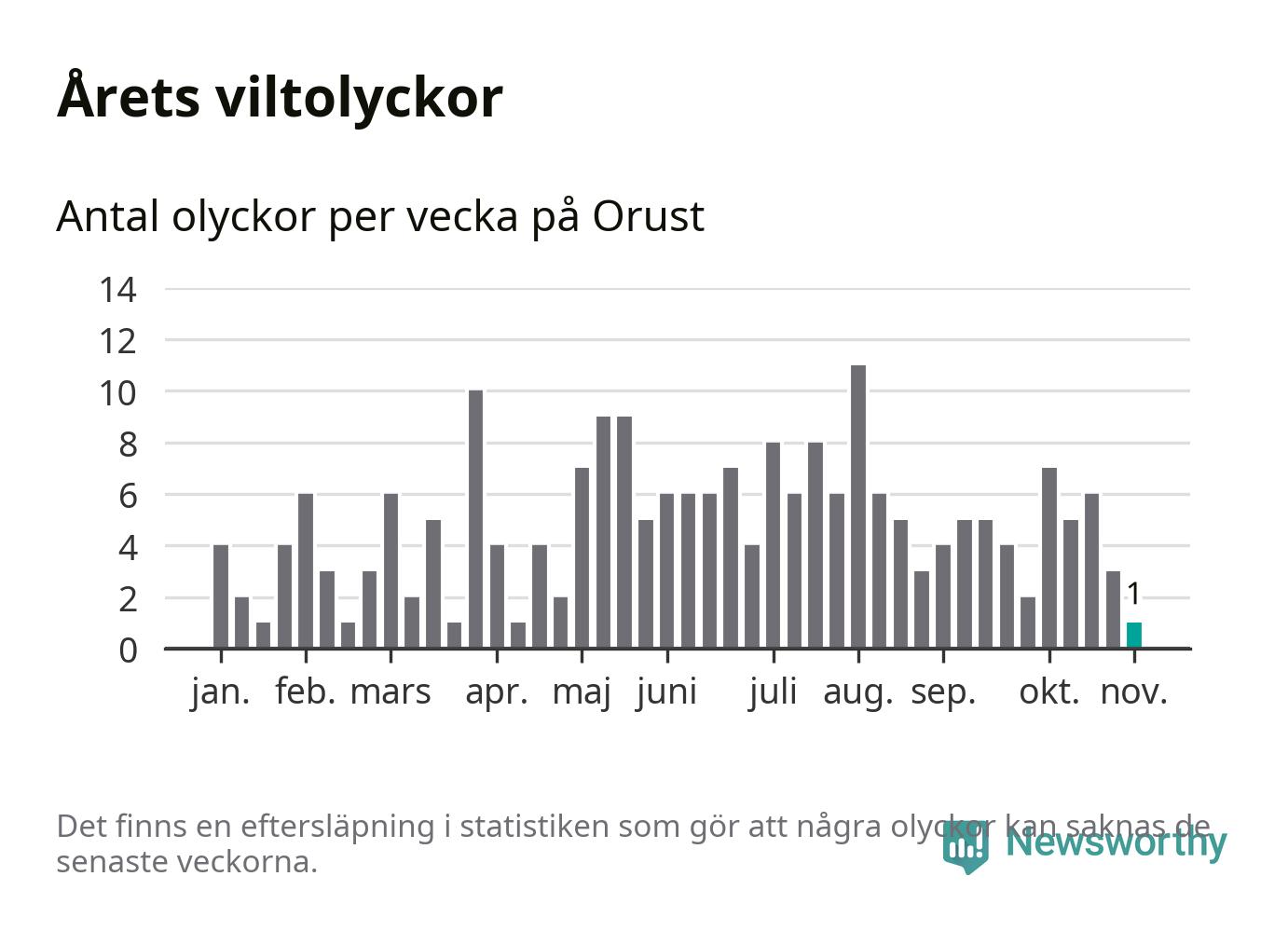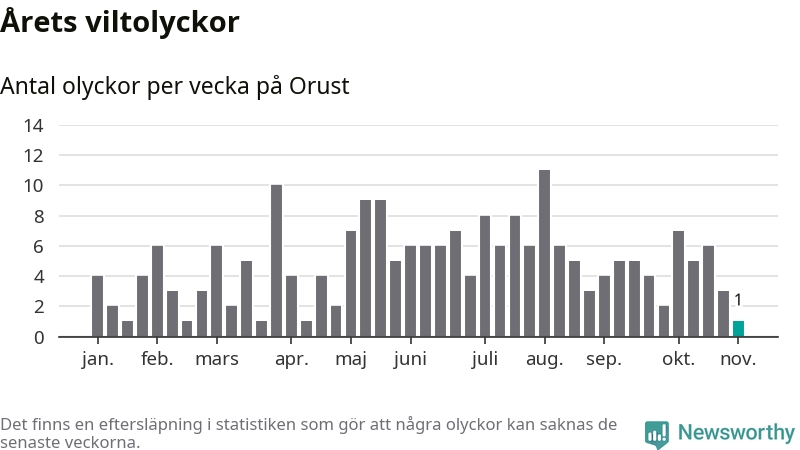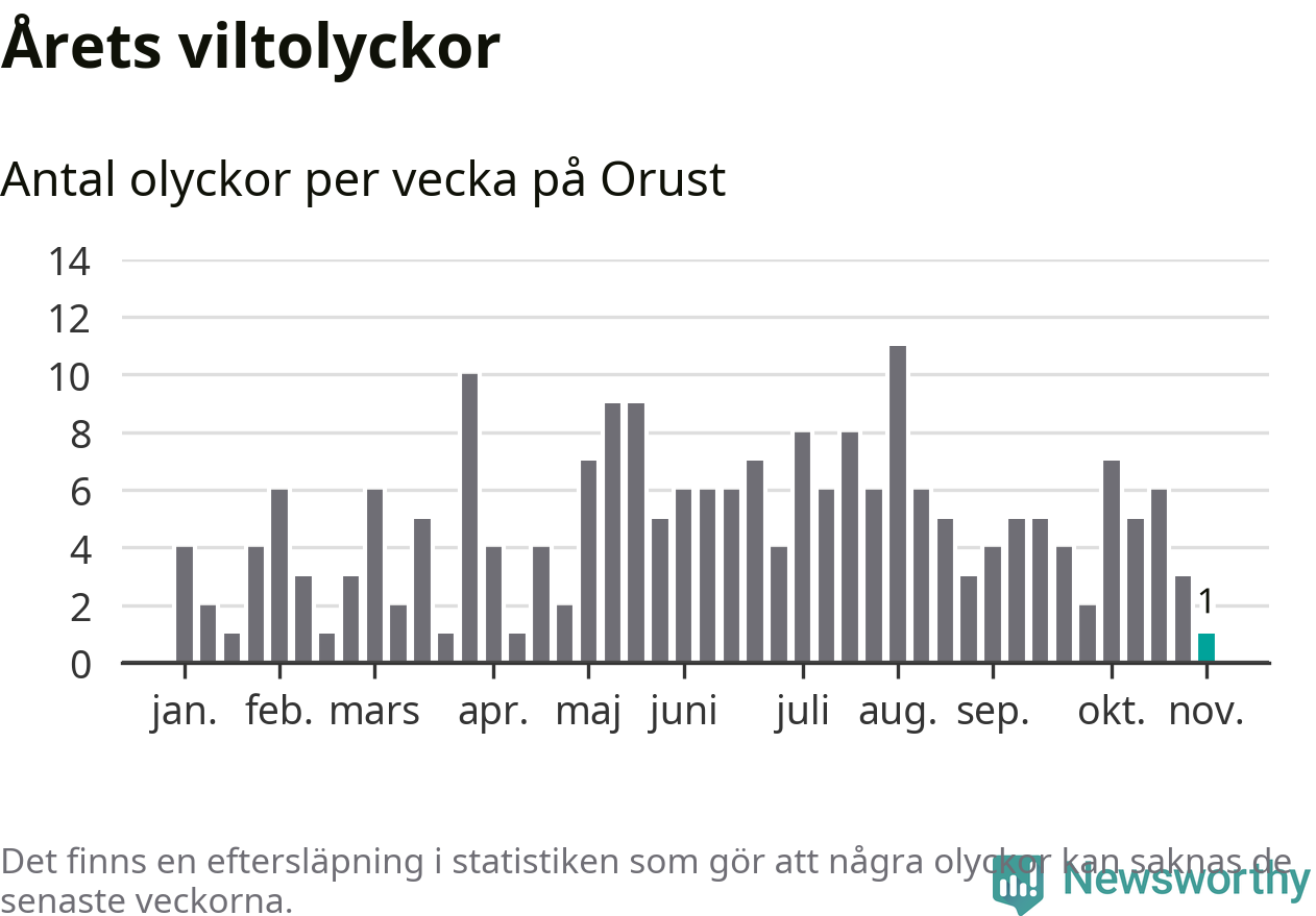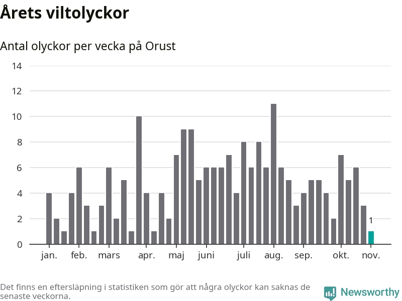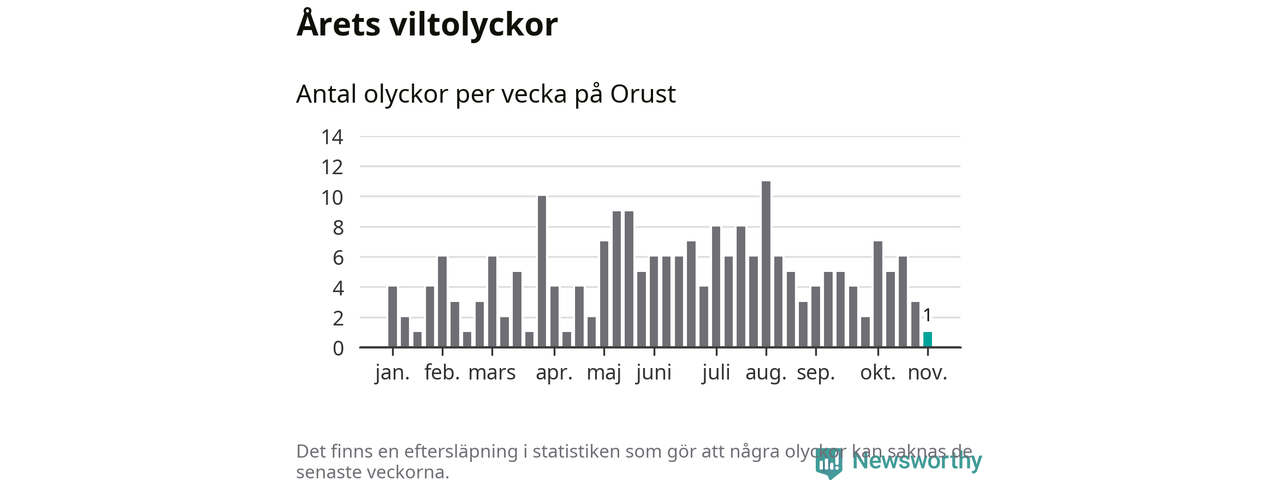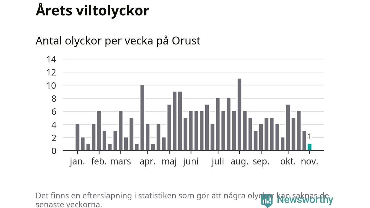 Från förra veckan (vecka 45) har hittills en viltolycka rapporterats in i Orusts kommun.