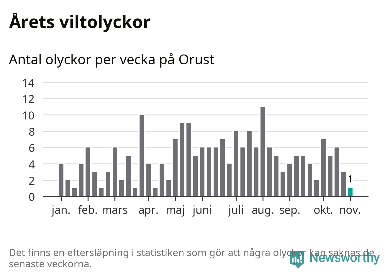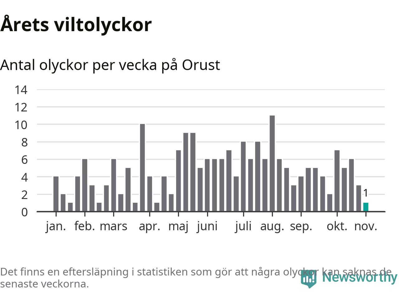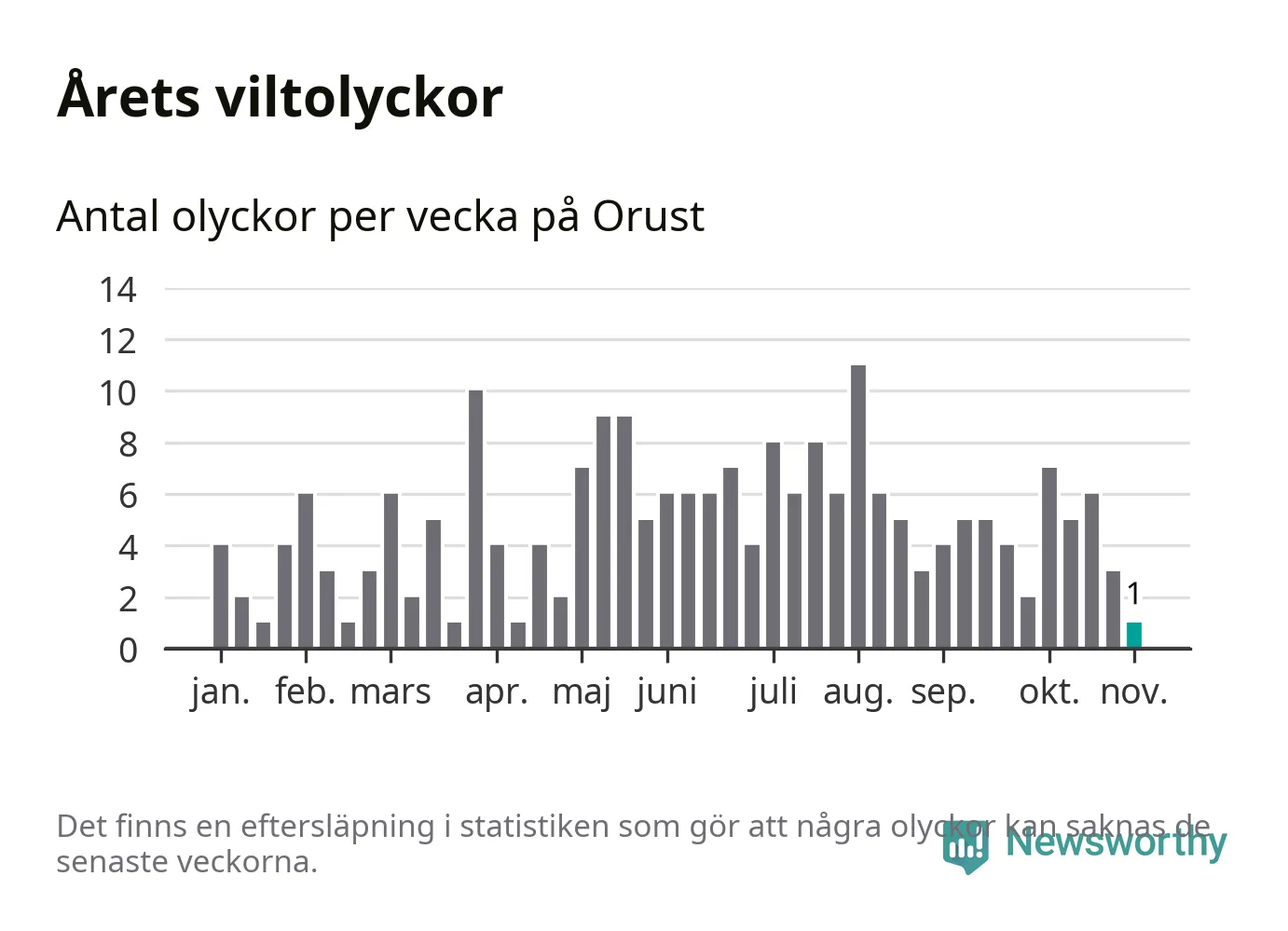 Från förra veckan (vecka 45) har hittills en viltolycka rapporterats in i Orusts kommun.