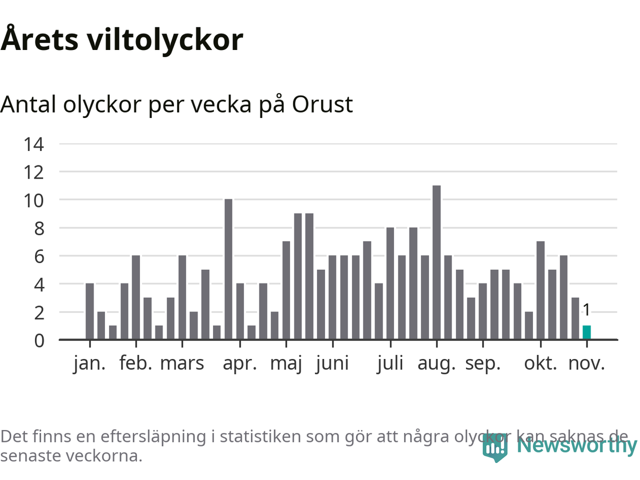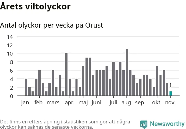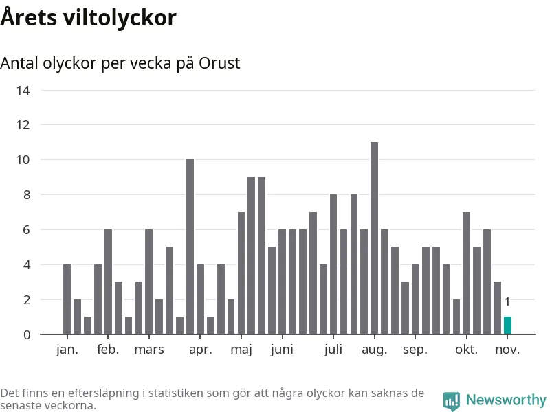 Totalt det här året har det inträffat 215 viltolyckor i kommunen. Det är mindre än genomsnittet för motsvarande period (omkring 271) de senaste tio åren.