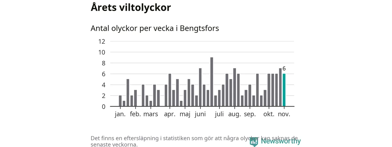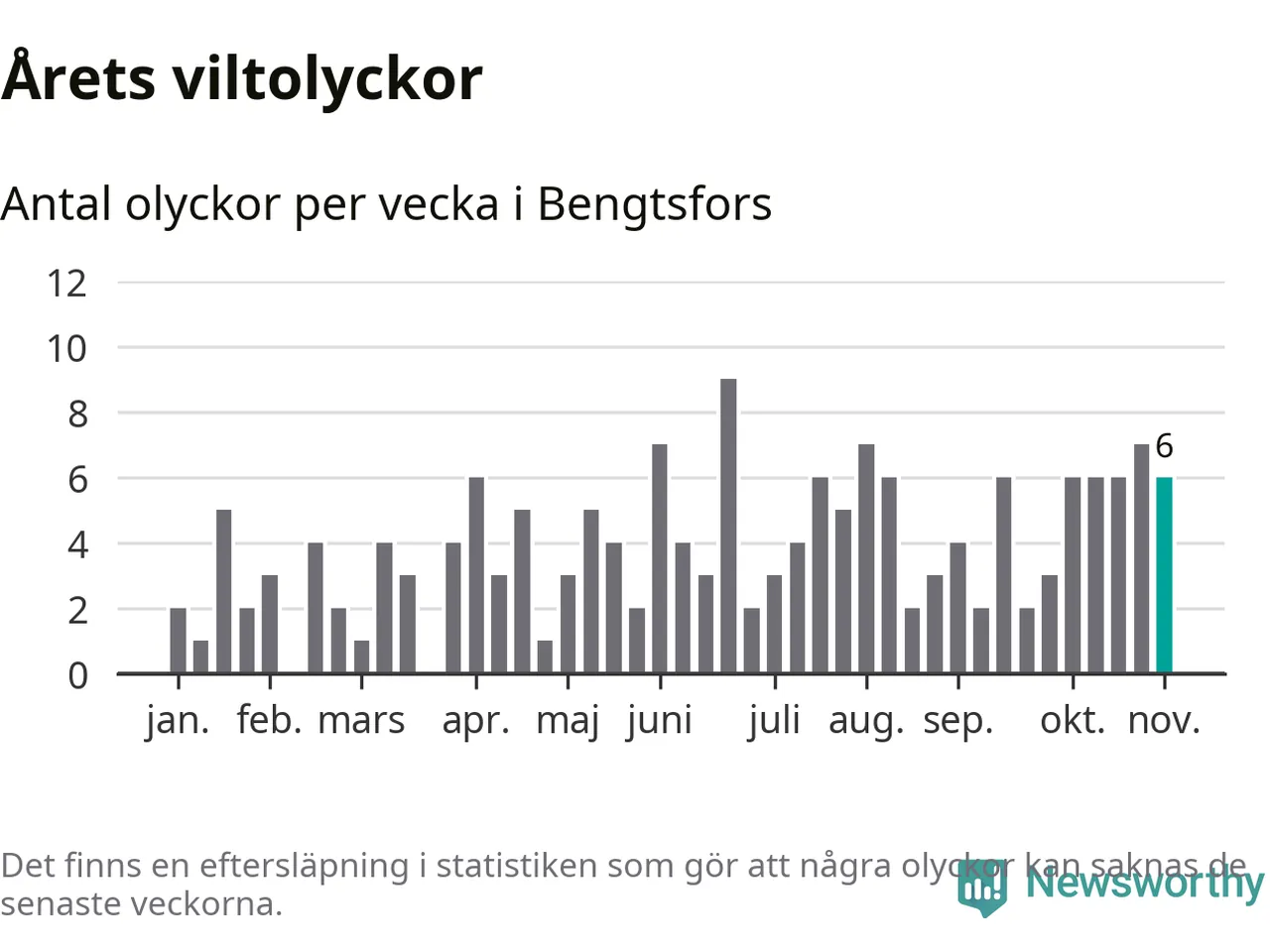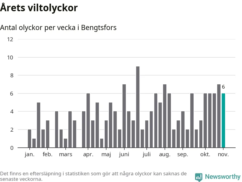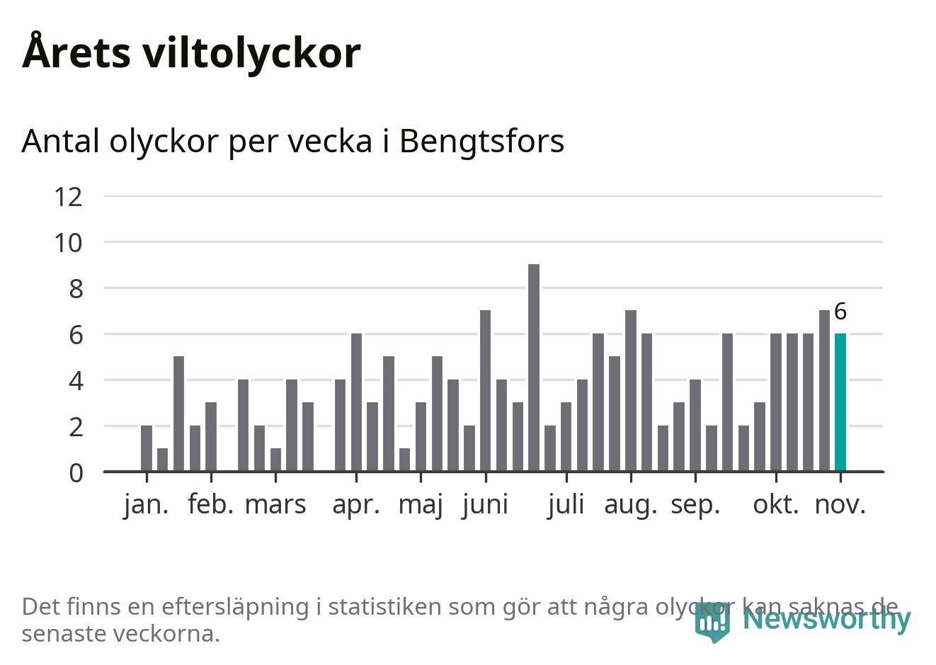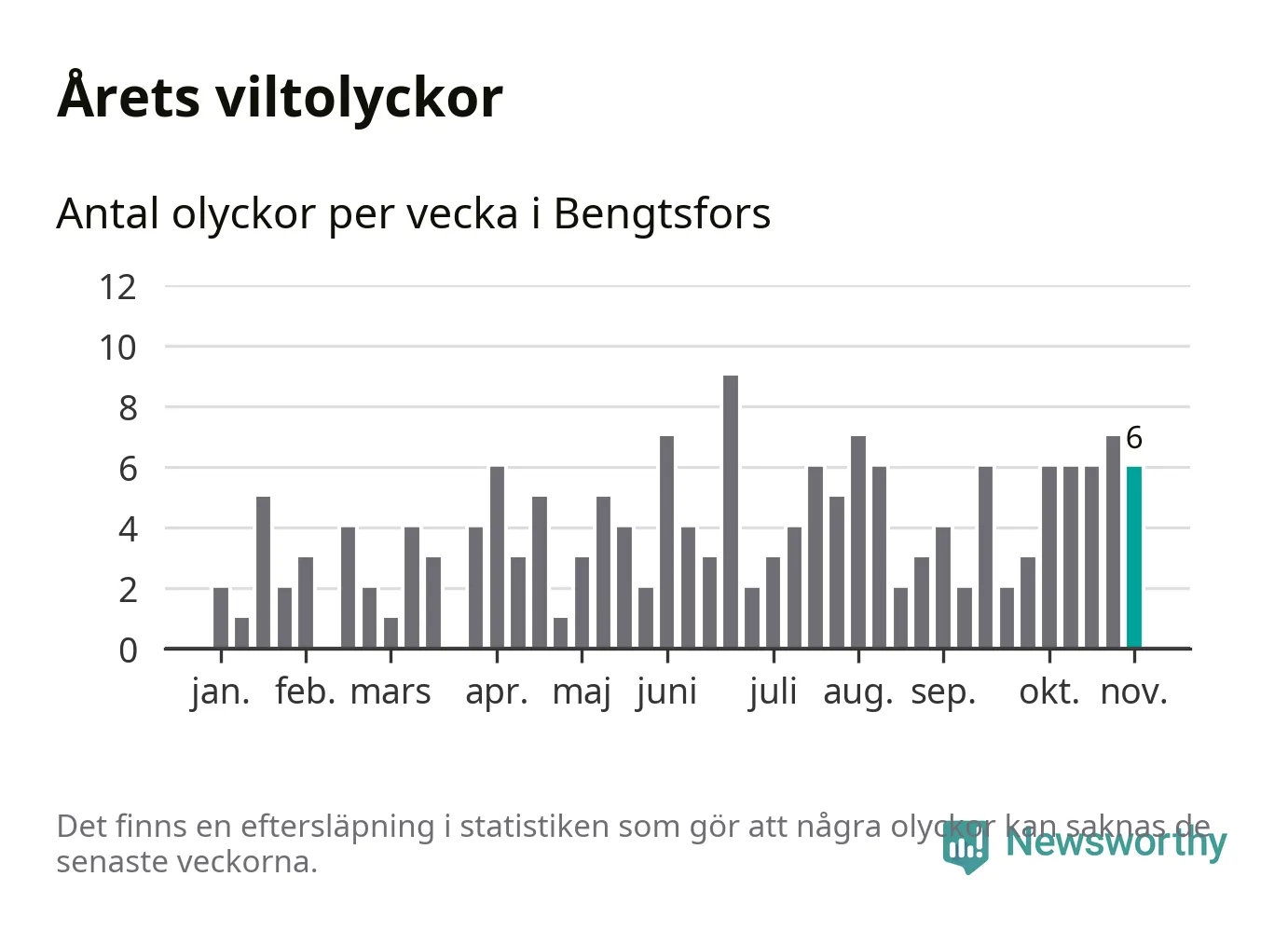 Hittills har sex viltolyckor rapporterats in i Bengtsfors kommun från vecka 45. Se listan här.