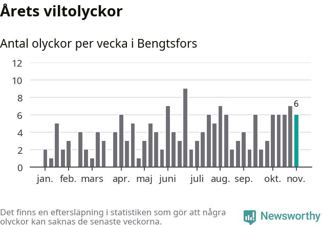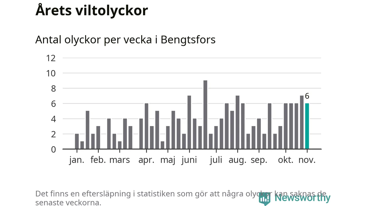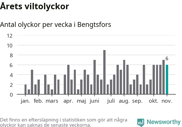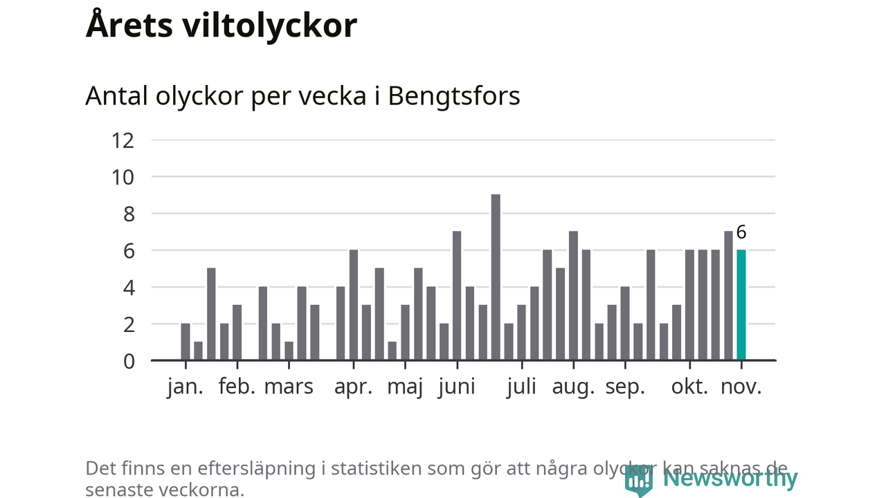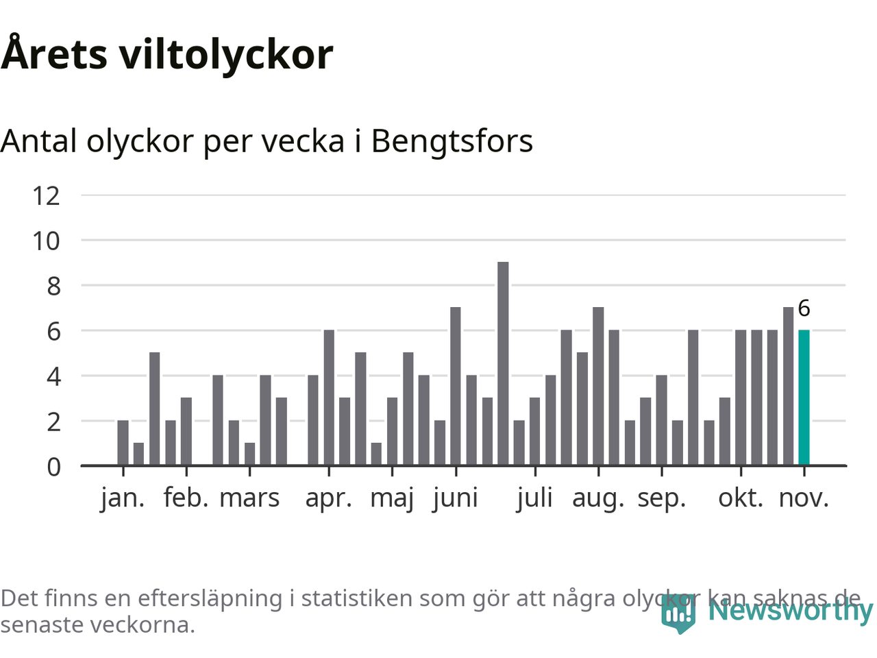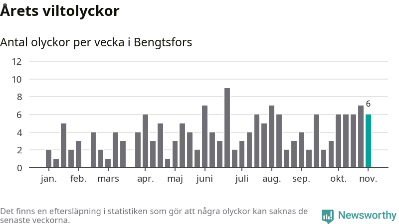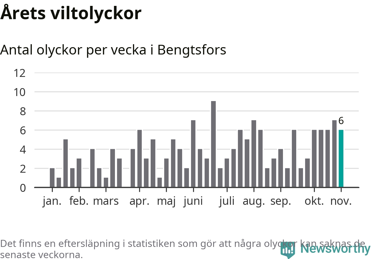 Hittills har sex viltolyckor rapporterats in i Bengtsfors kommun från vecka 45. Se listan här.