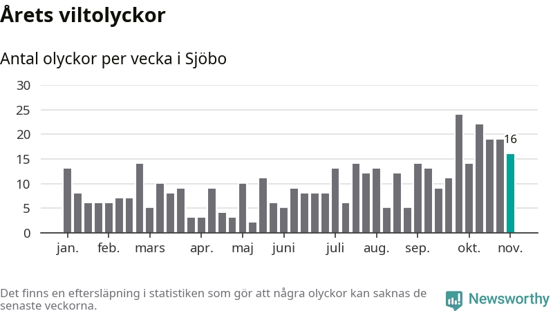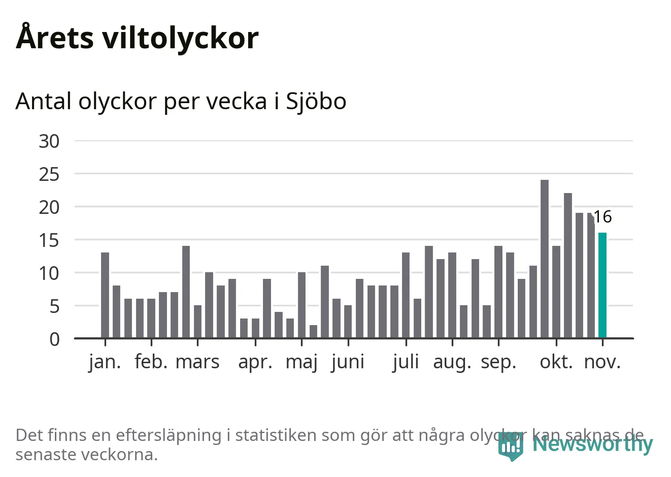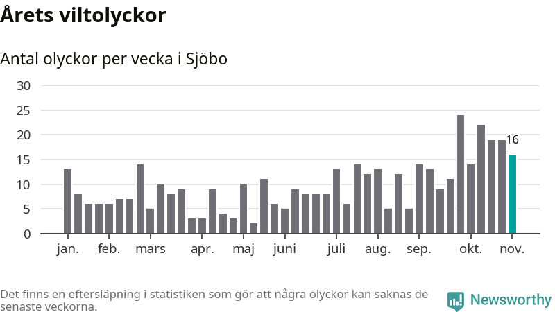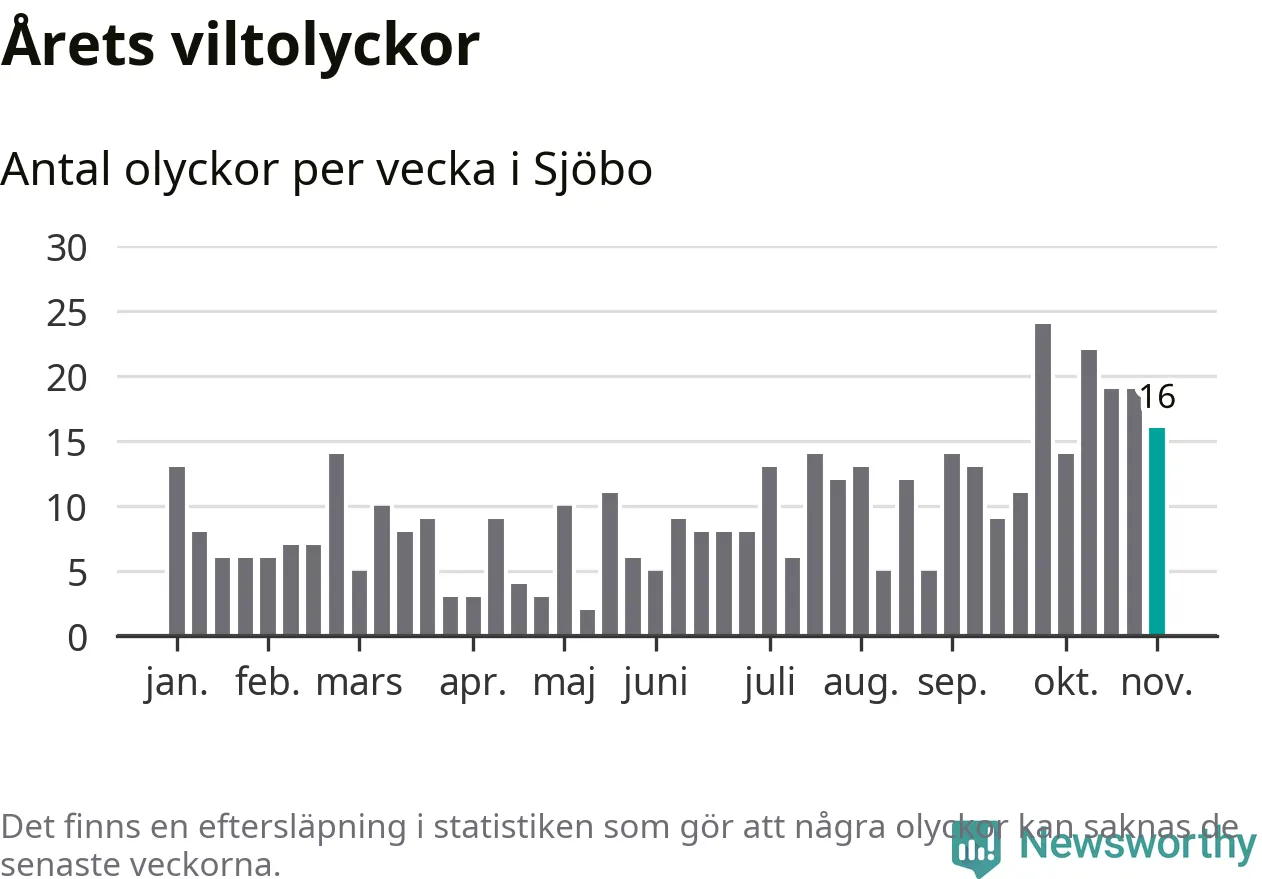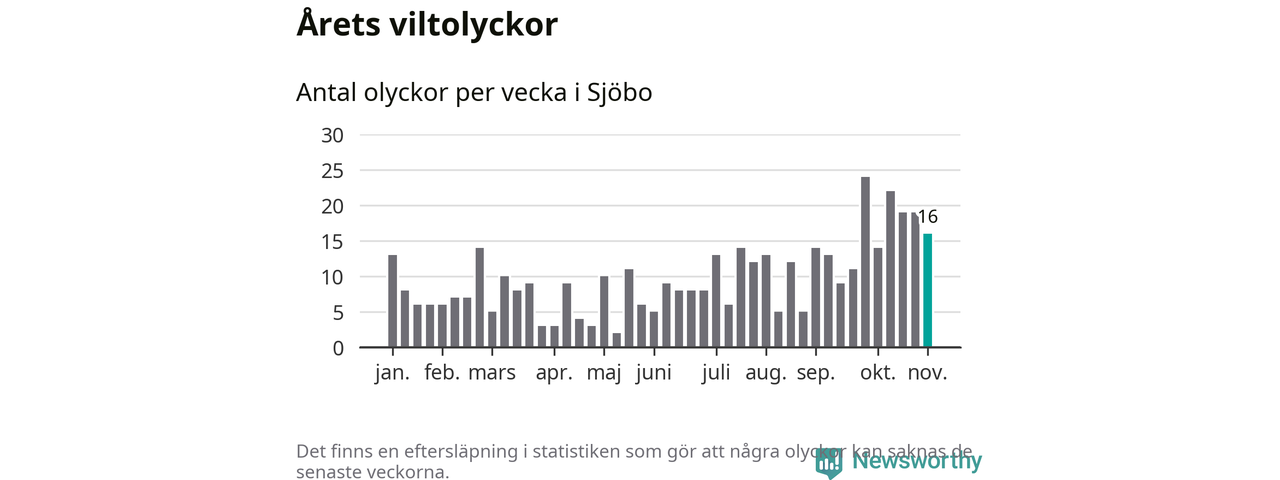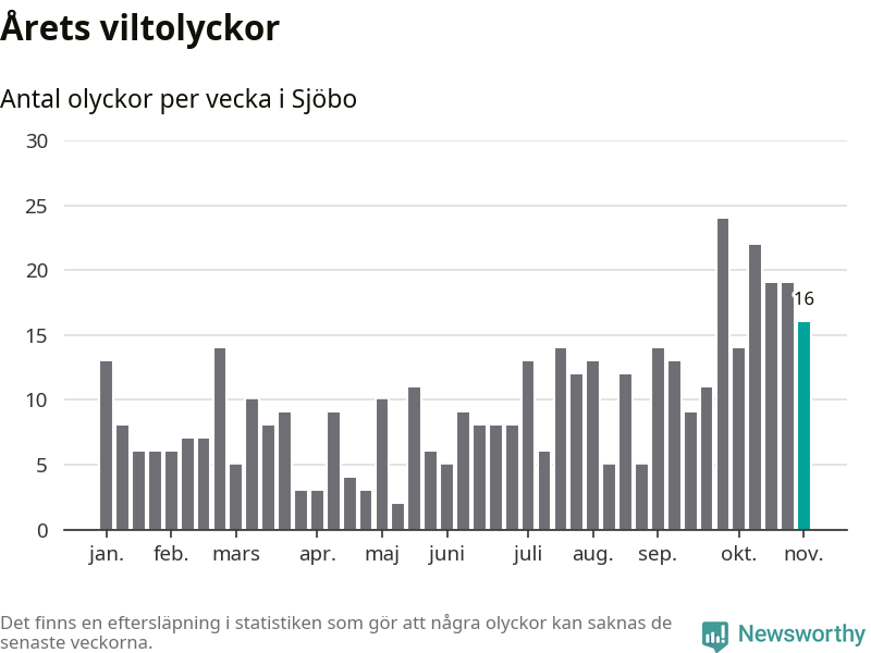 Hittills har 16 viltolyckor rapporterats in i Sjöbo kommun från vecka 45. Se listan här.