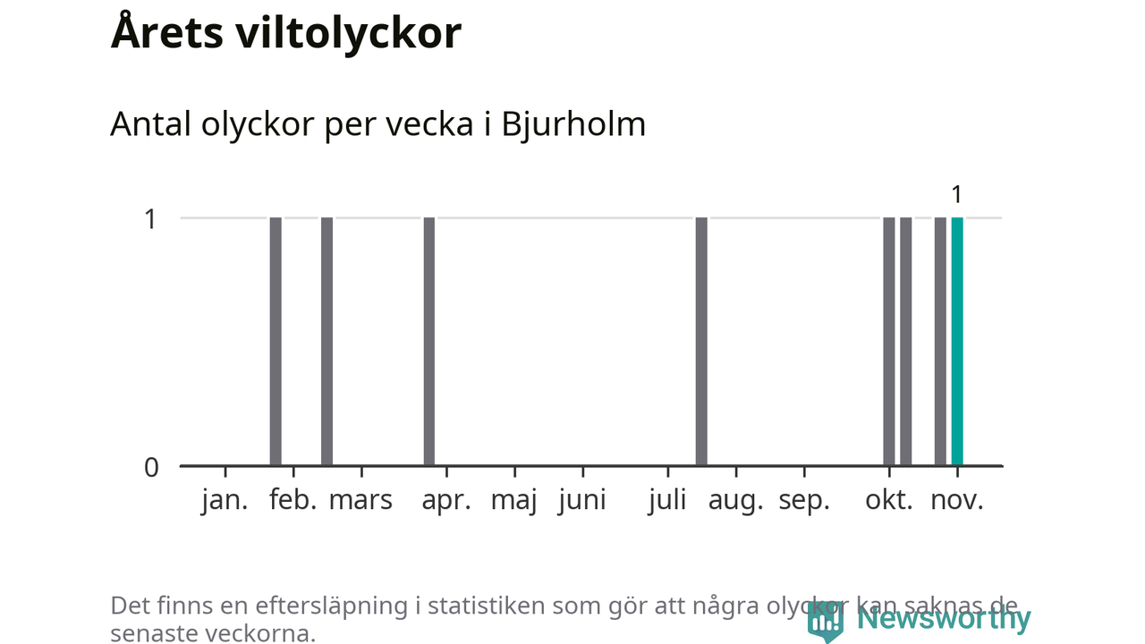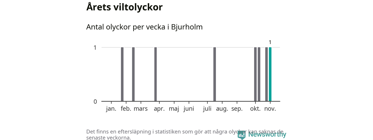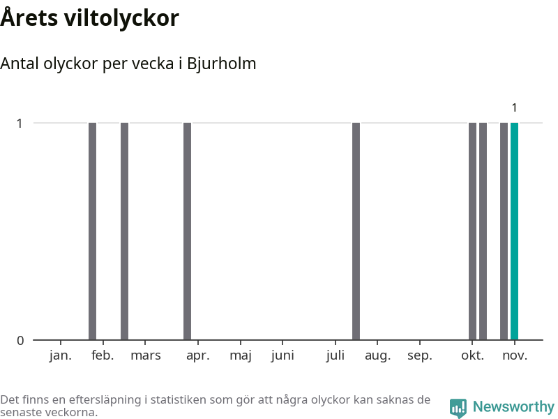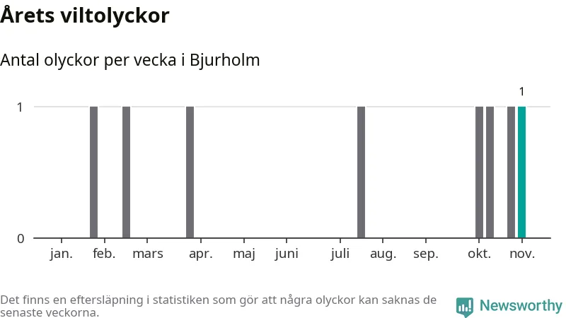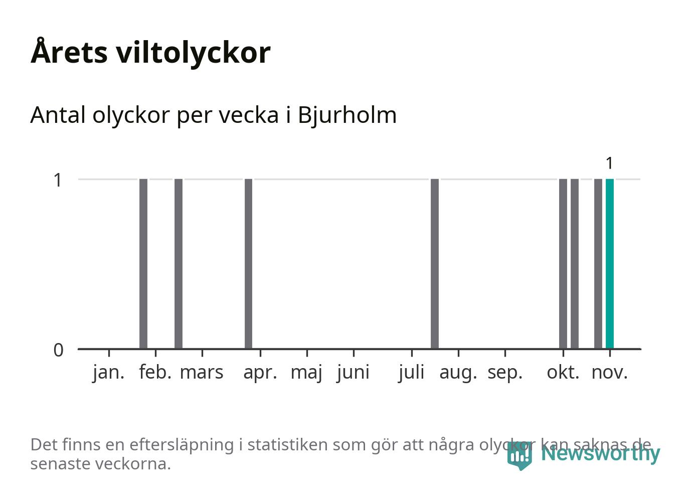 Från förra veckan (vecka 45) har hittills en viltolycka rapporterats in i Bjurholms kommun.