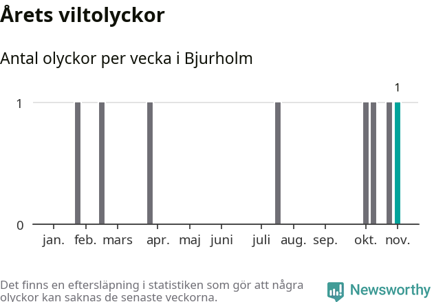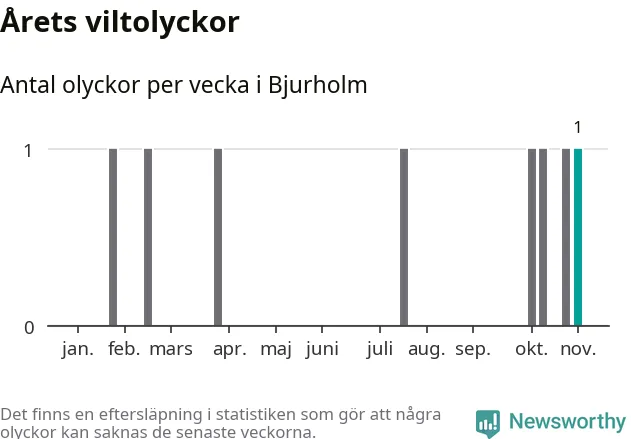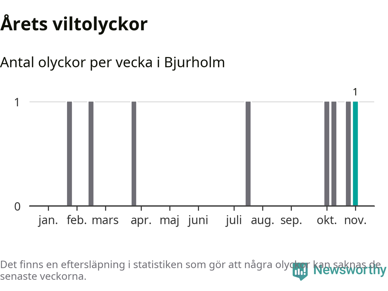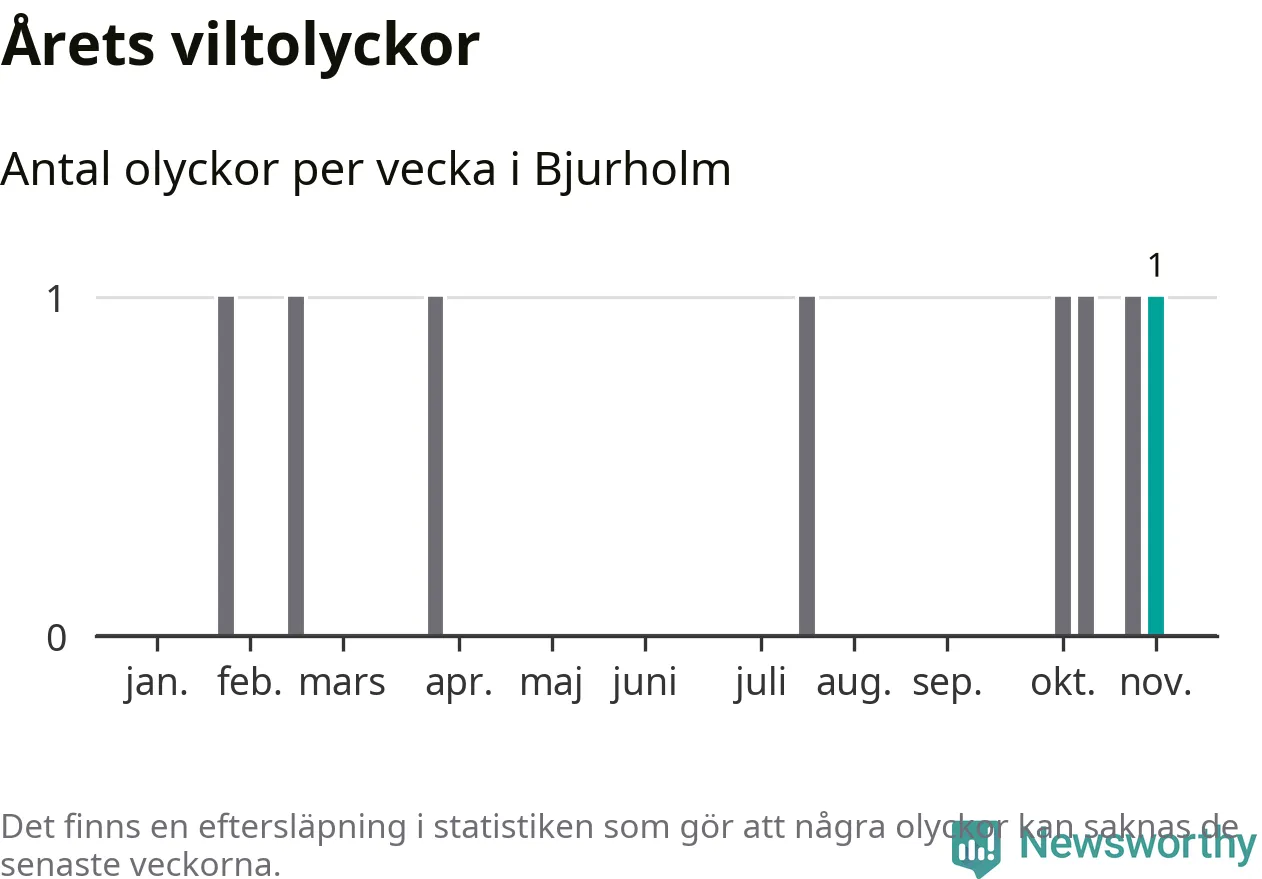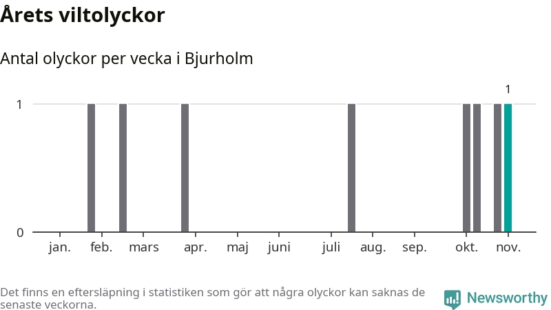 Från förra veckan (vecka 45) har hittills en viltolycka rapporterats in i Bjurholms kommun.