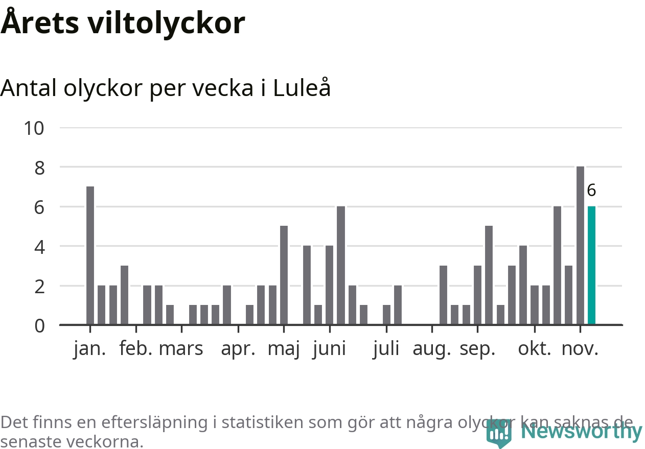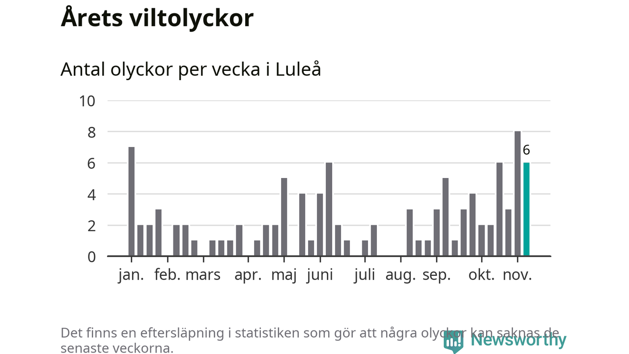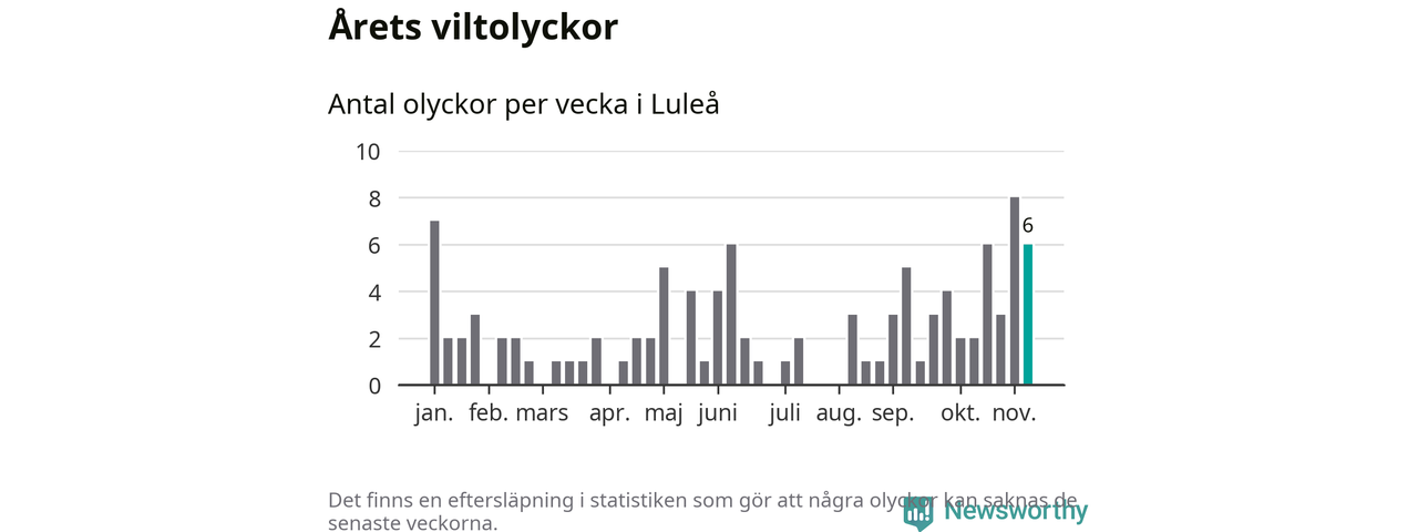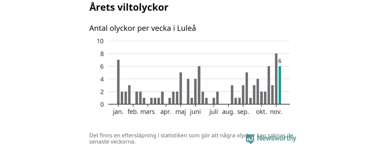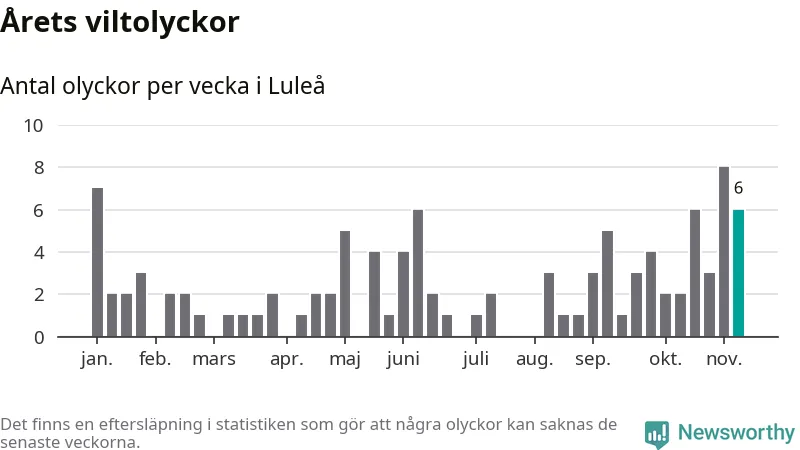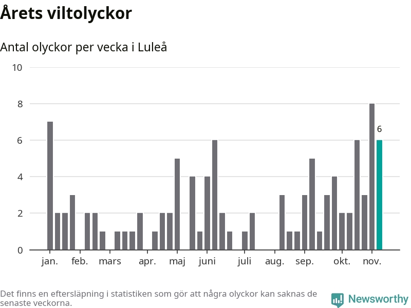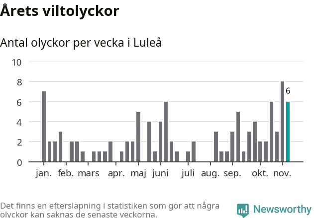 Hittills har sex viltolyckor rapporterats in i Luleå kommun från vecka 46. Se listan här.