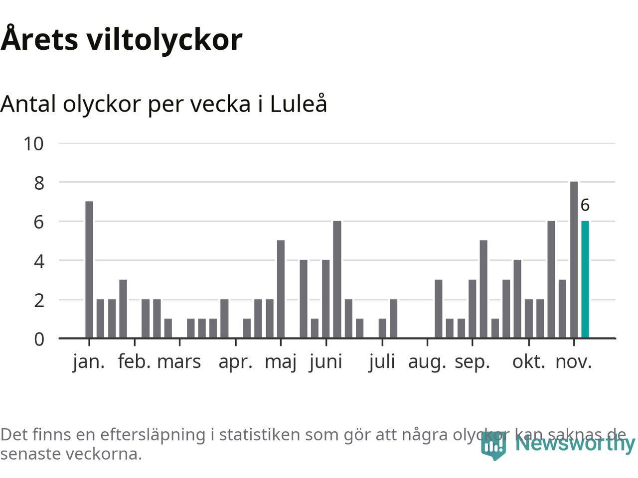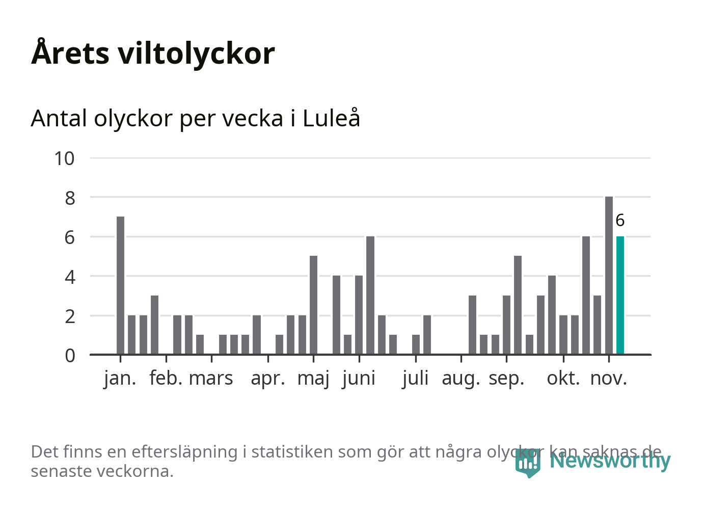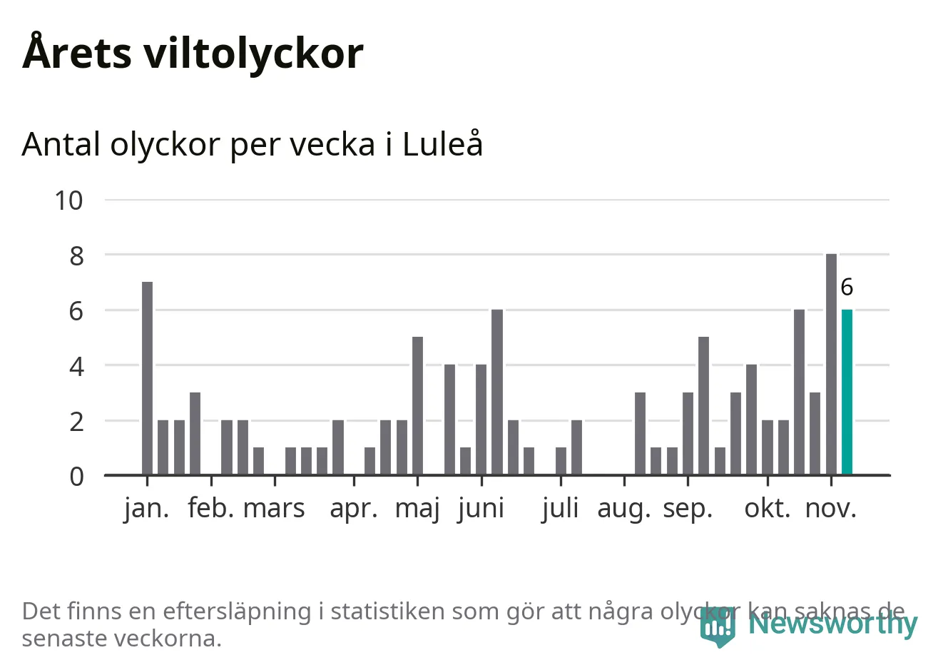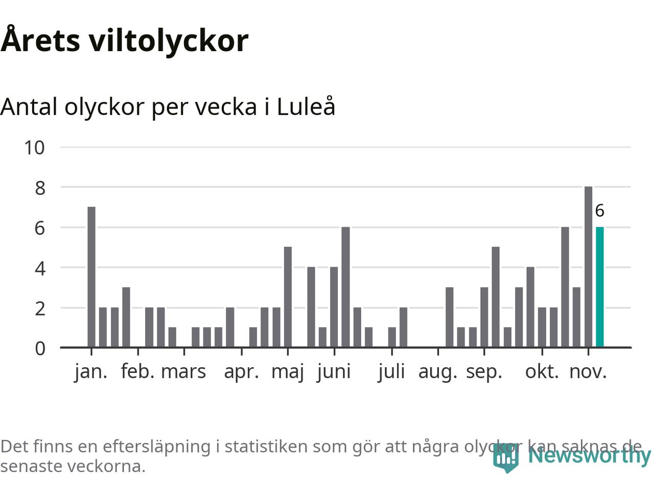 Hittills har sex viltolyckor rapporterats in i Luleå kommun från vecka 46. Se listan här.