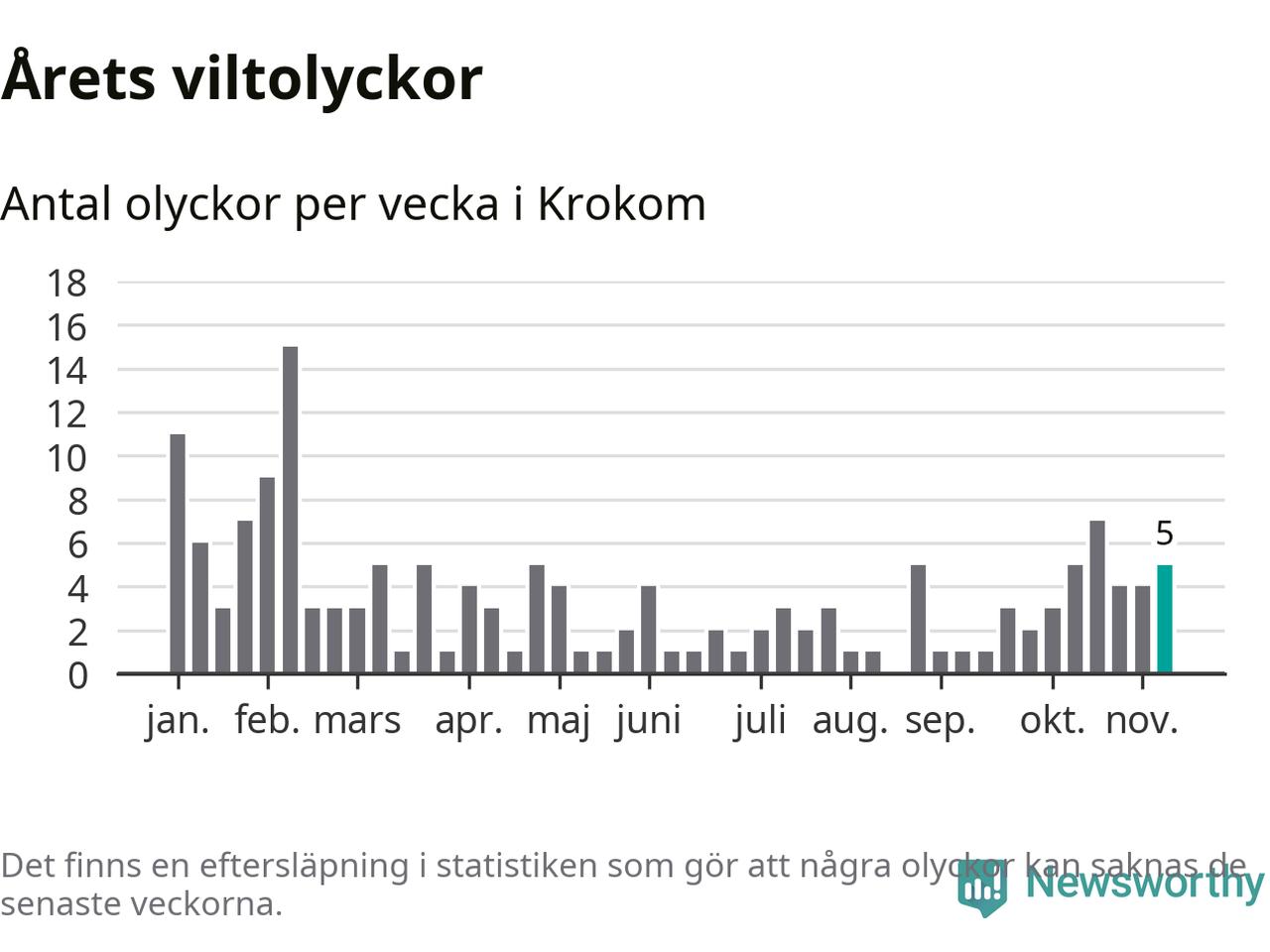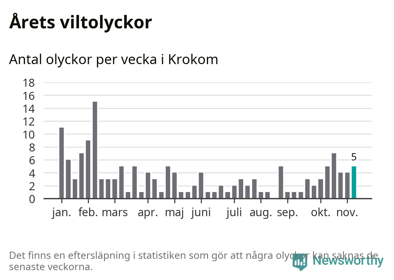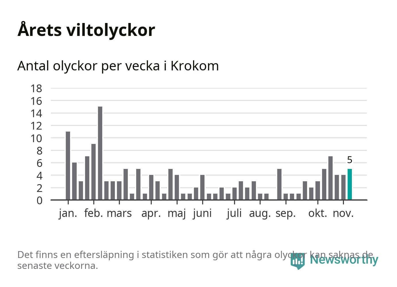 Hittills har fem viltolyckor rapporterats in i Krokoms kommun från vecka 46. Se listan här.