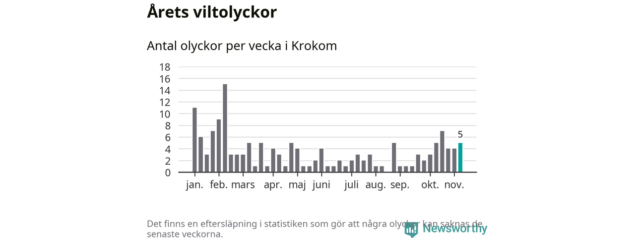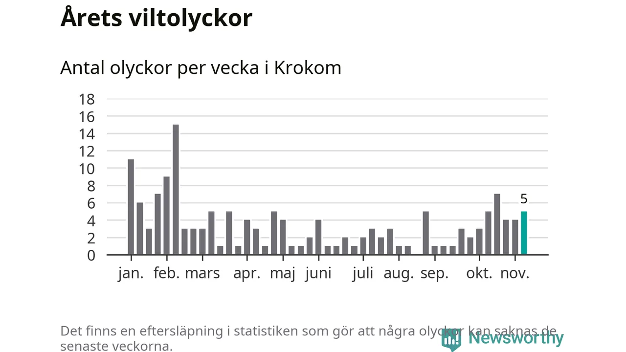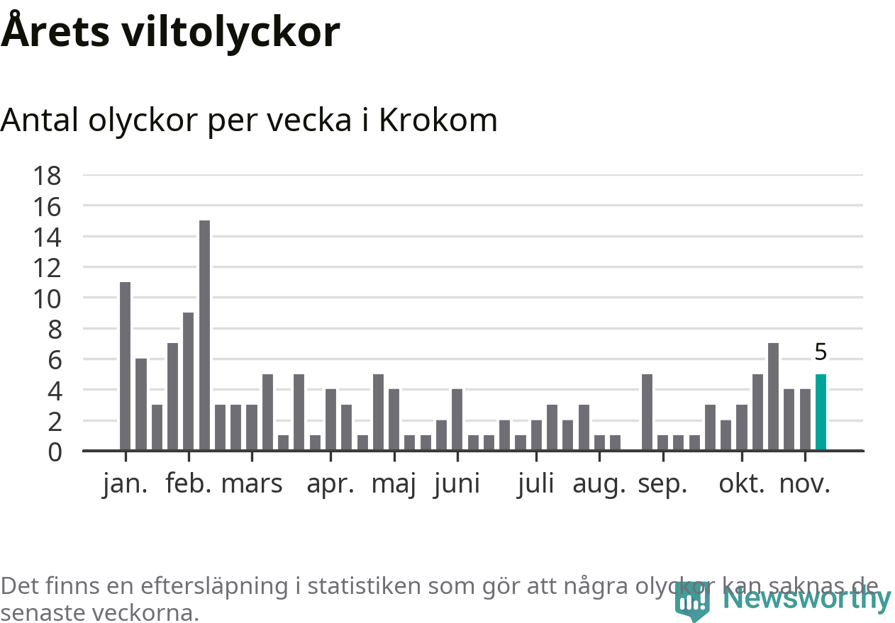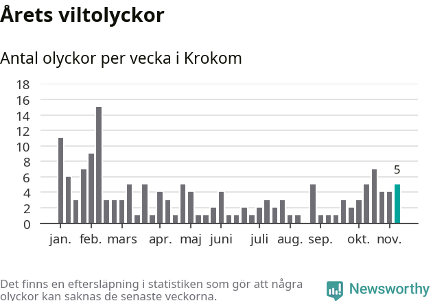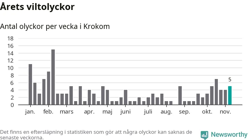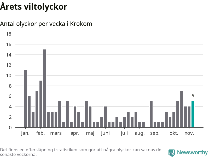Hittills har fem viltolyckor rapporterats in i Krokoms kommun från vecka 46. Se listan här.