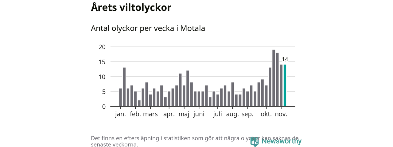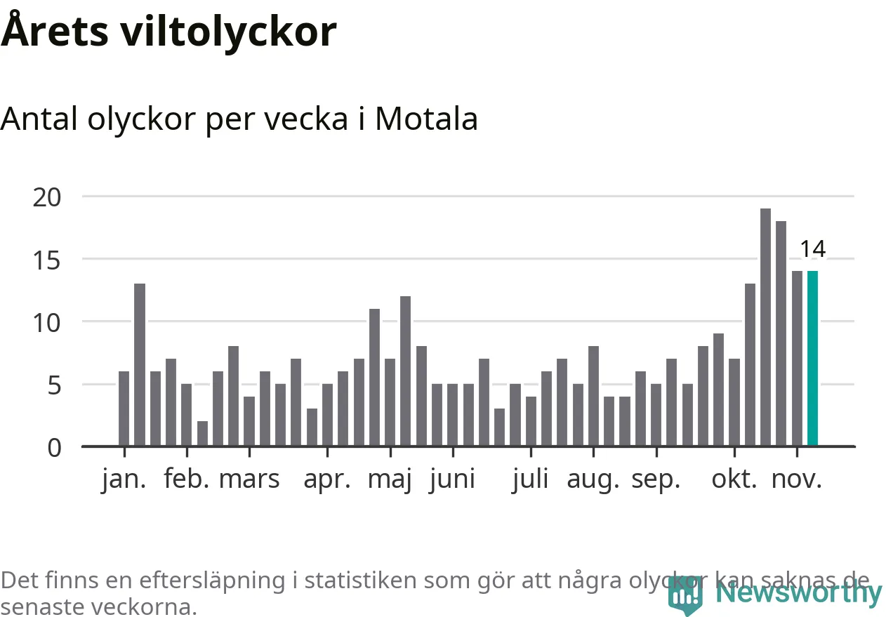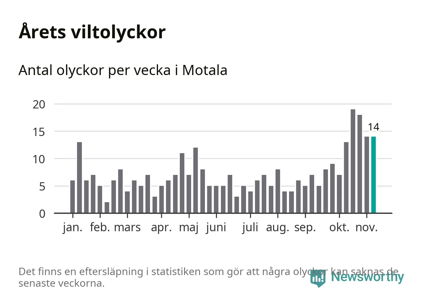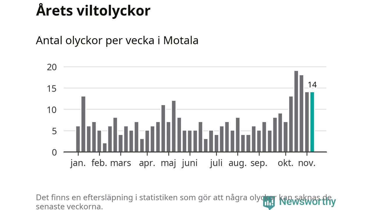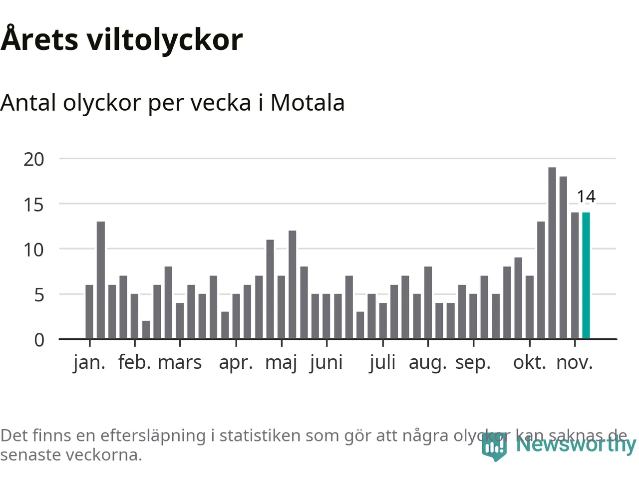 331 viltolyckor i kommunen. Det är mer än genomsnittet för motsvarande period (omkring 281) de senaste tio åren.