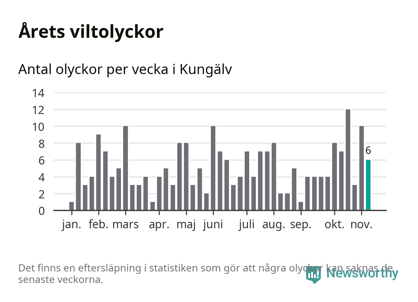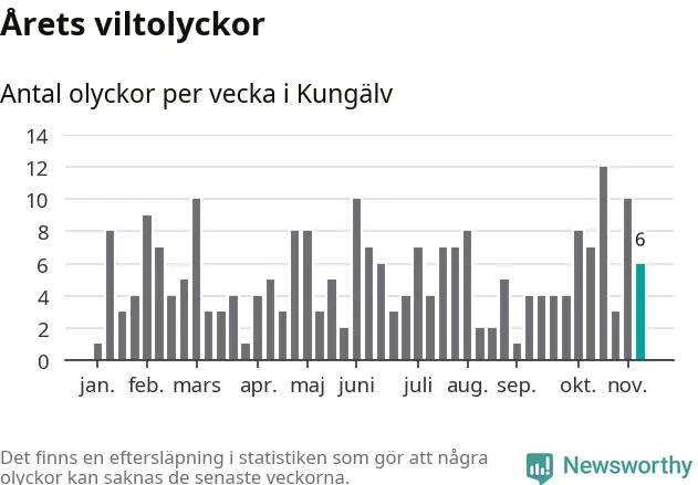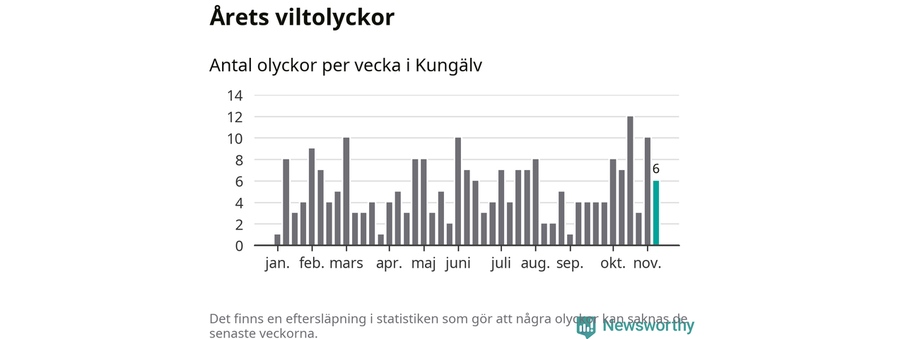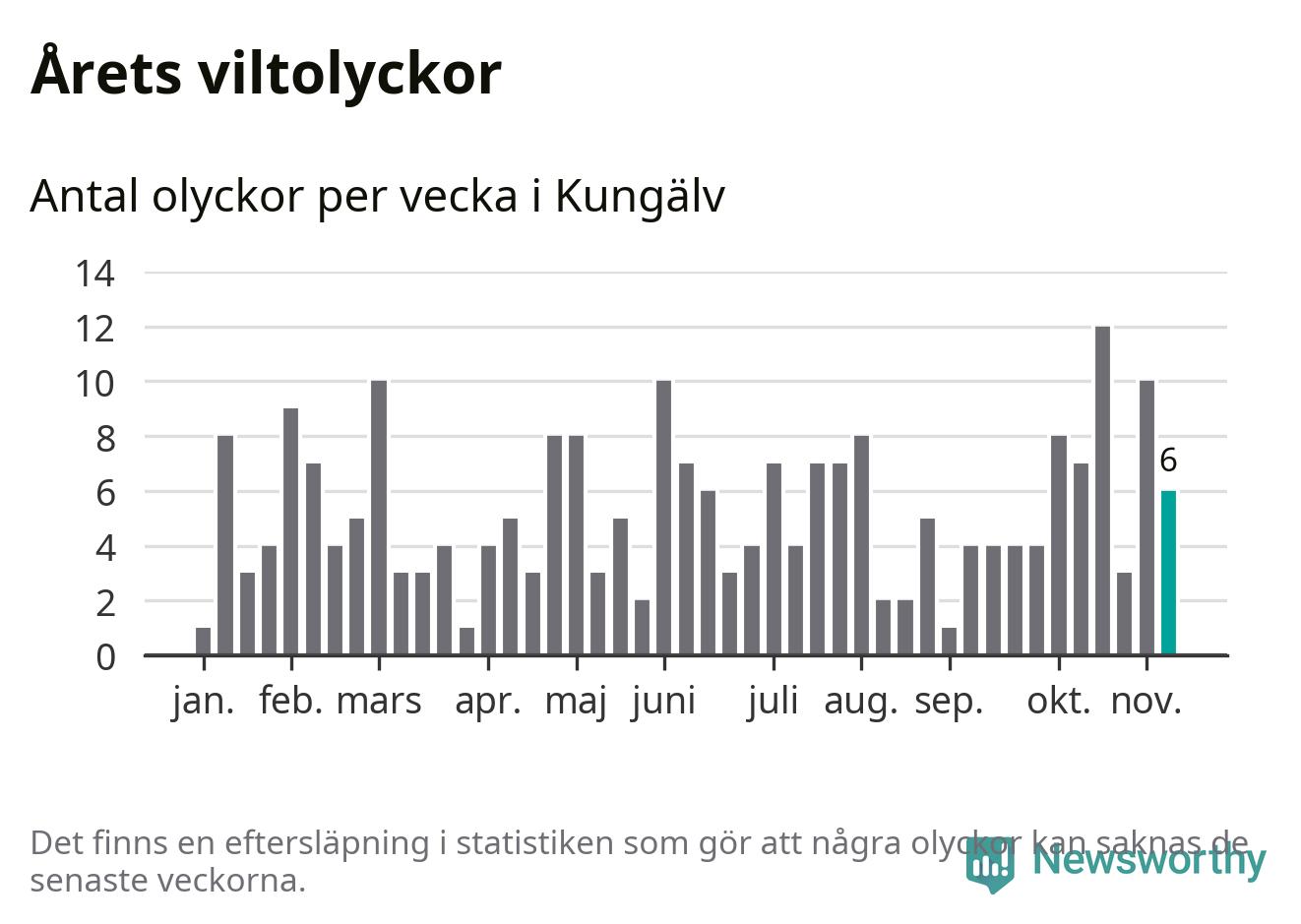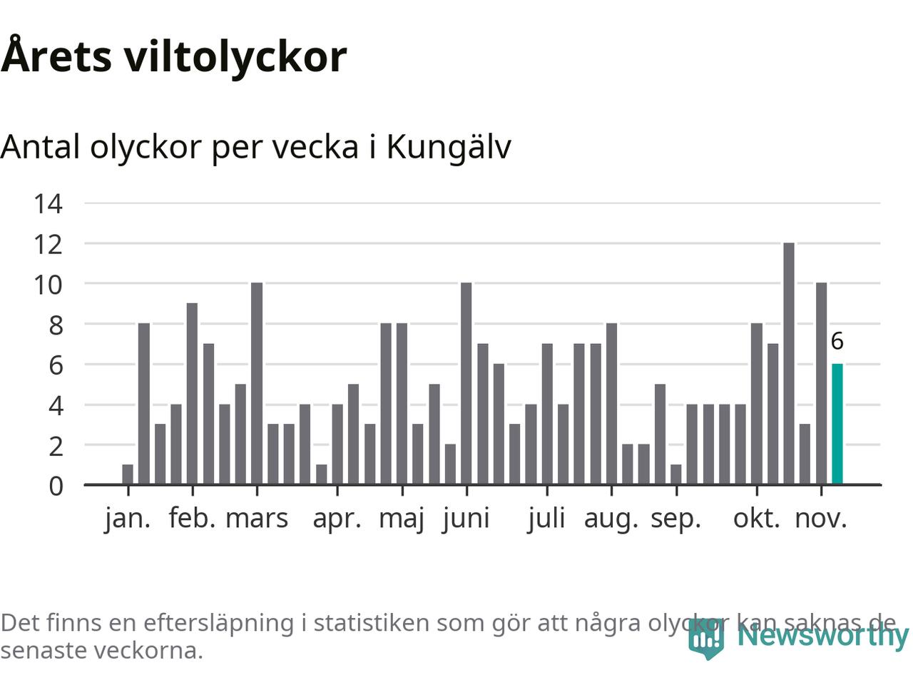 Hittills har sex viltolyckor rapporterats in i Kungälvs kommun från vecka 46. Se listan här.