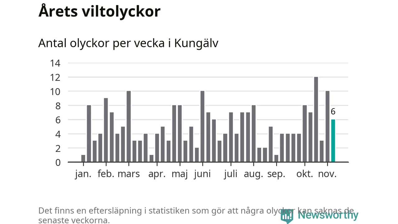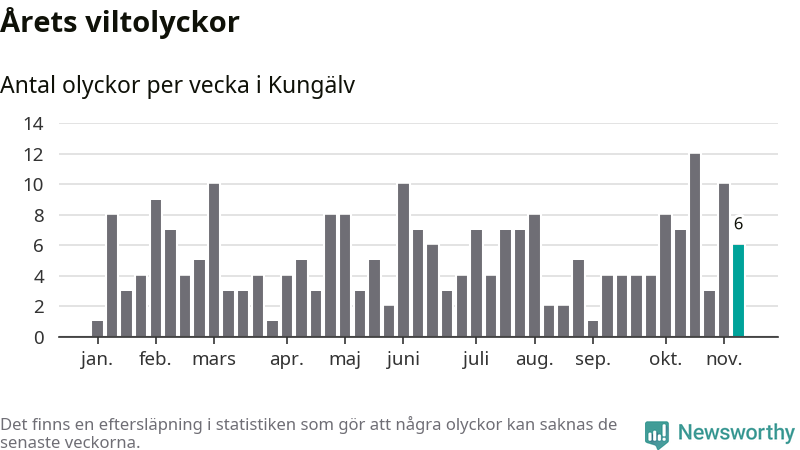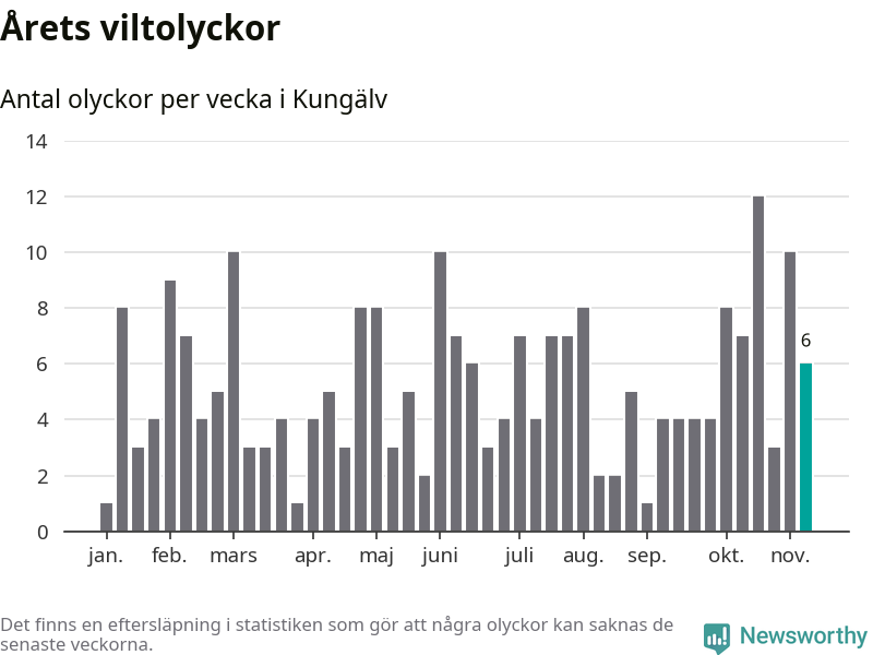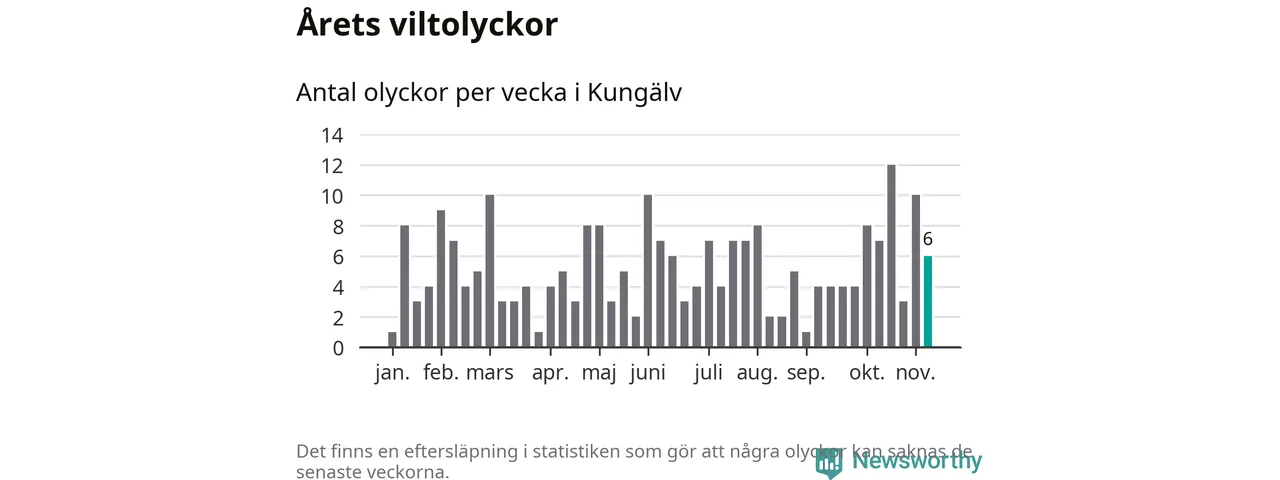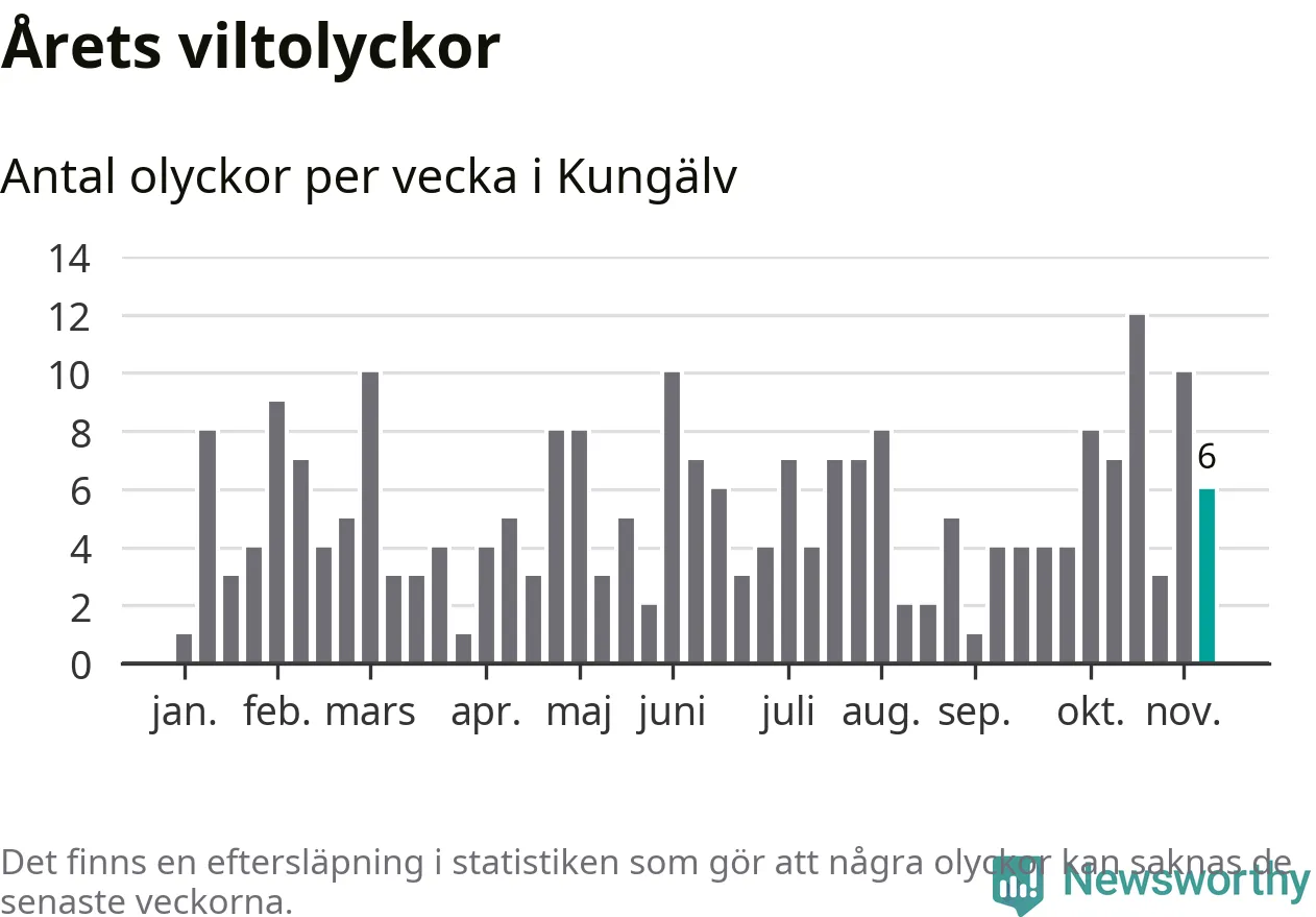 Hittills har sex viltolyckor rapporterats in i Kungälvs kommun från vecka 46. Se listan här.