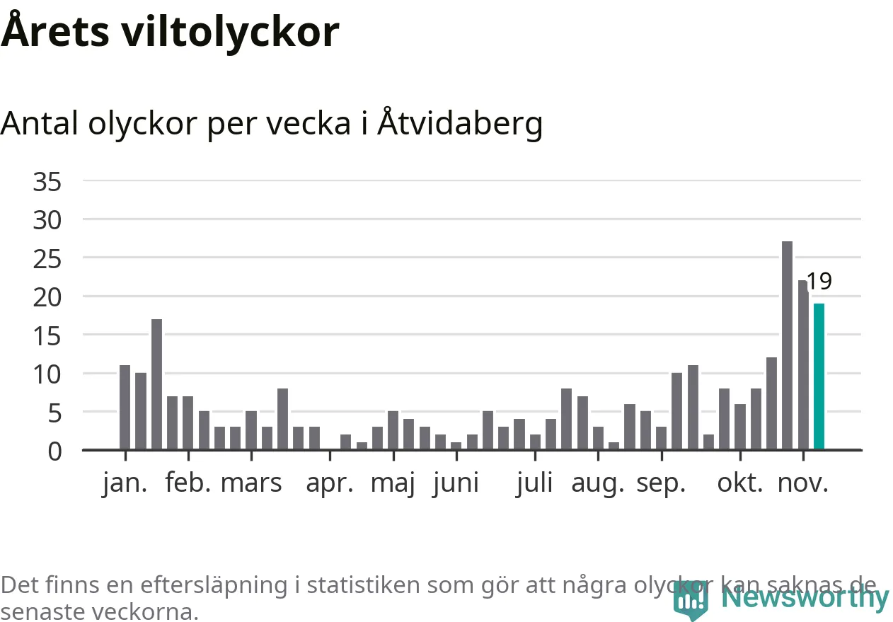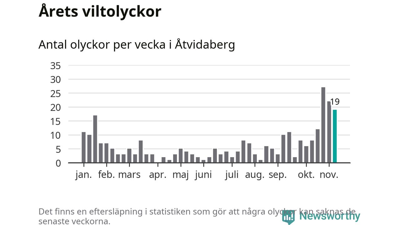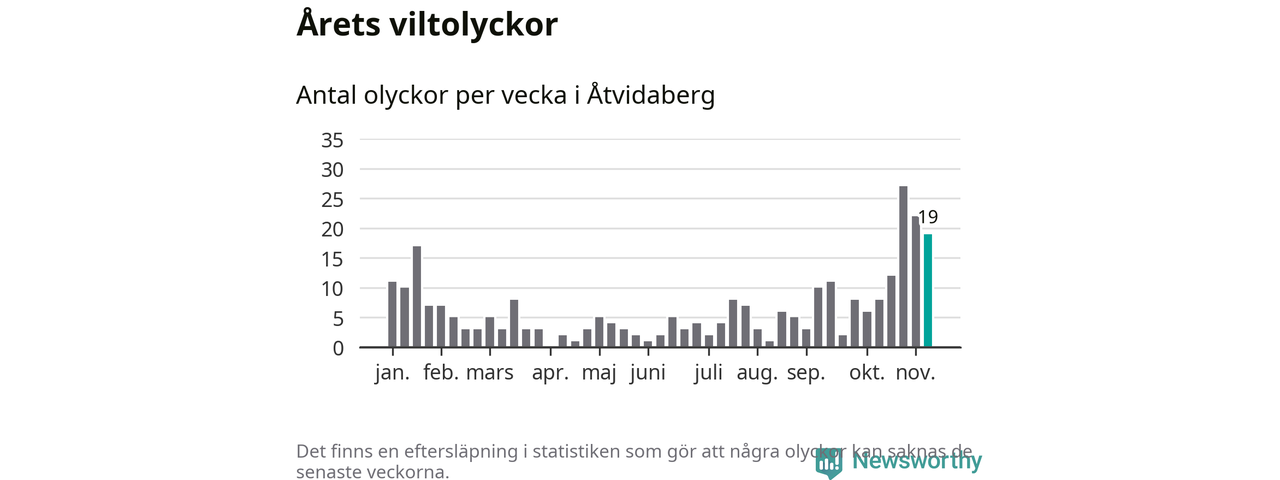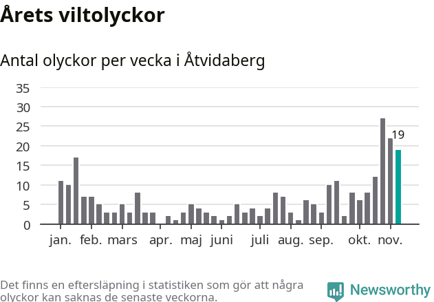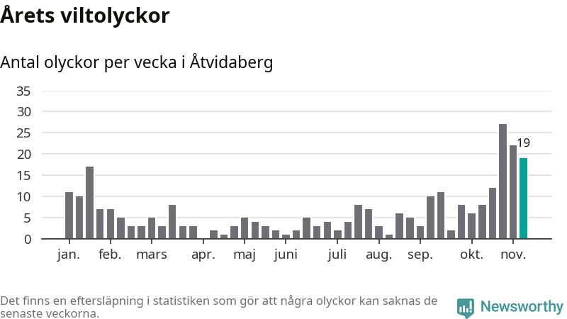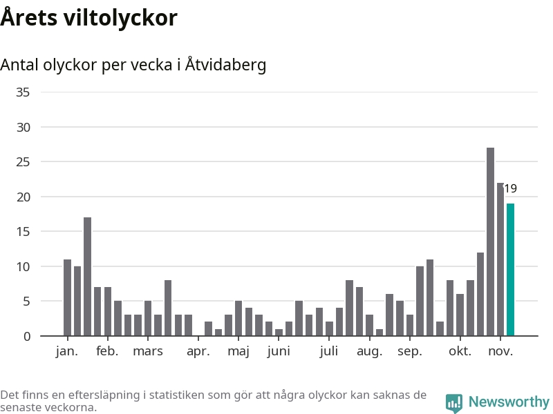 Hittills har 19 viltolyckor rapporterats in i Åtvidabergs kommun från vecka 46. Se listan här.