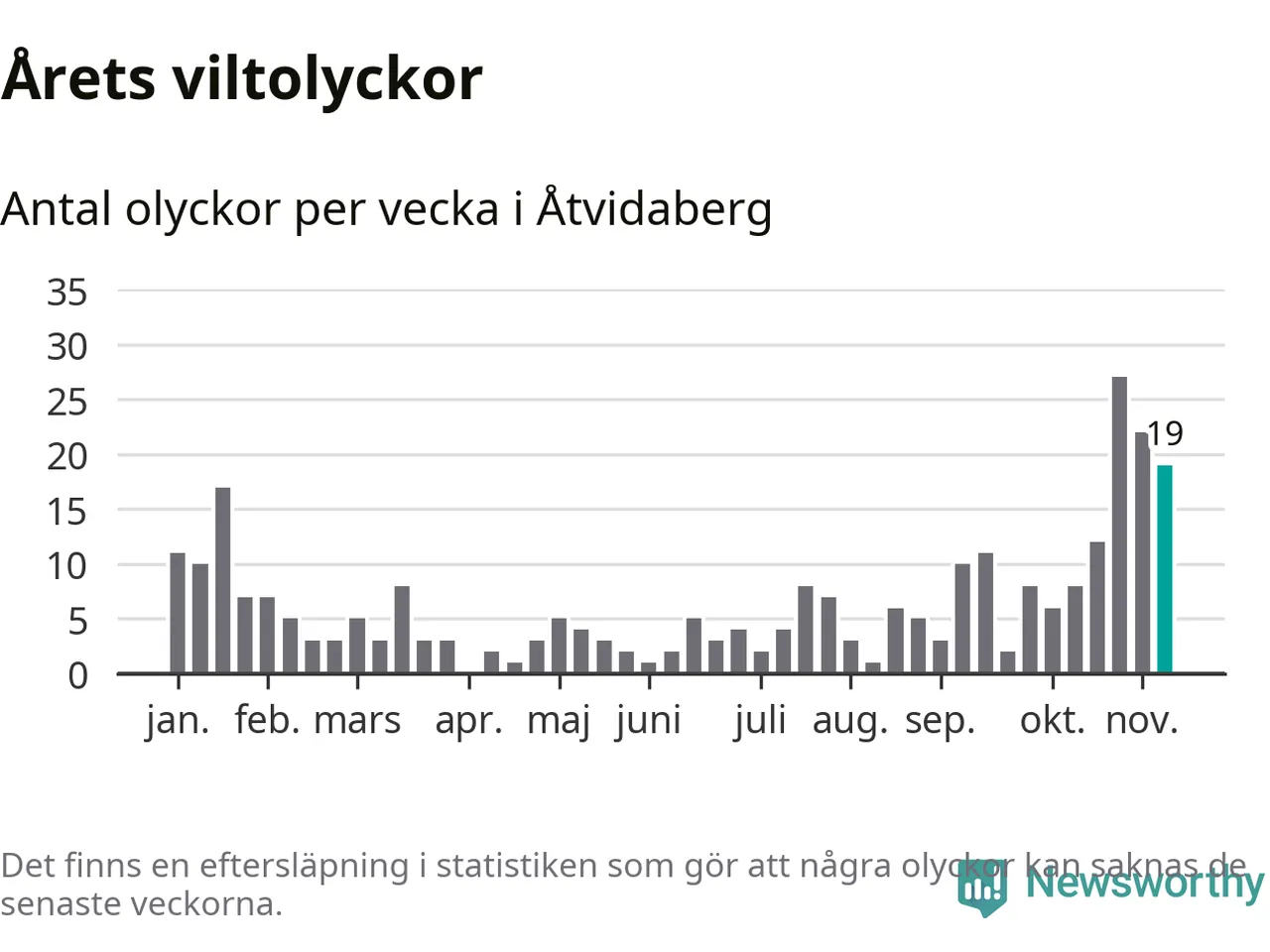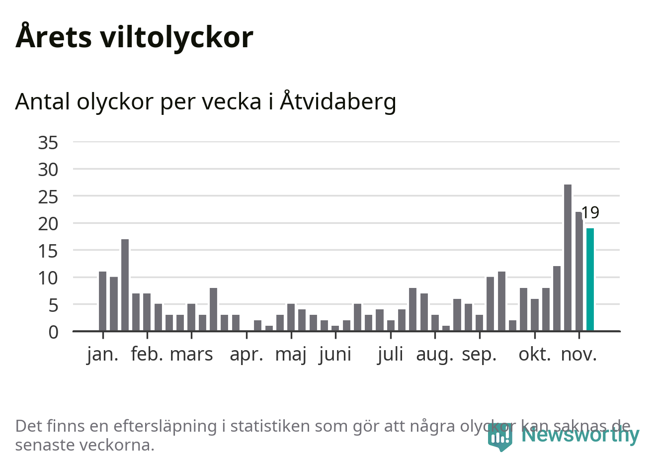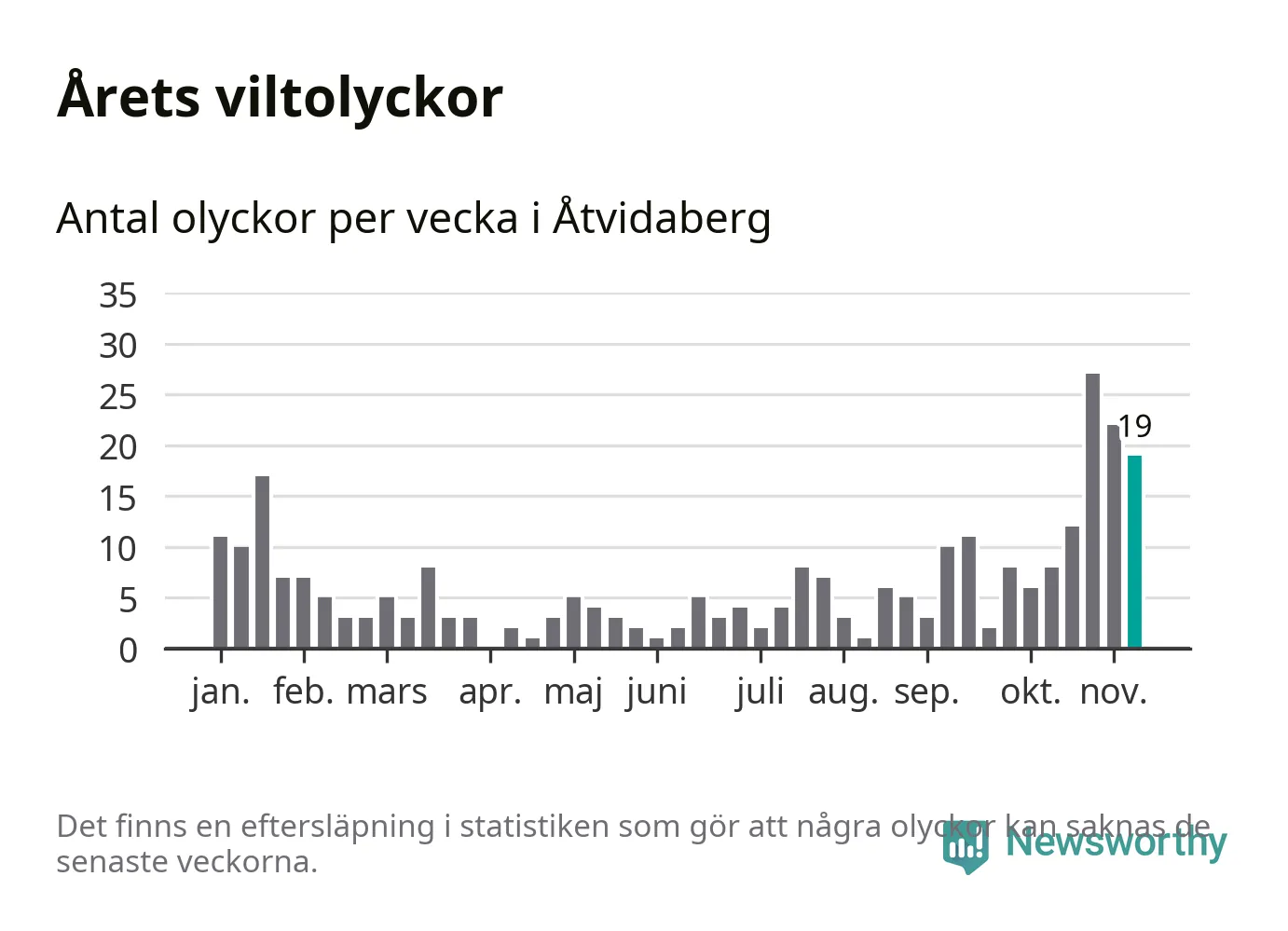 Hittills har 19 viltolyckor rapporterats in i Åtvidabergs kommun från vecka 46. Se listan här.