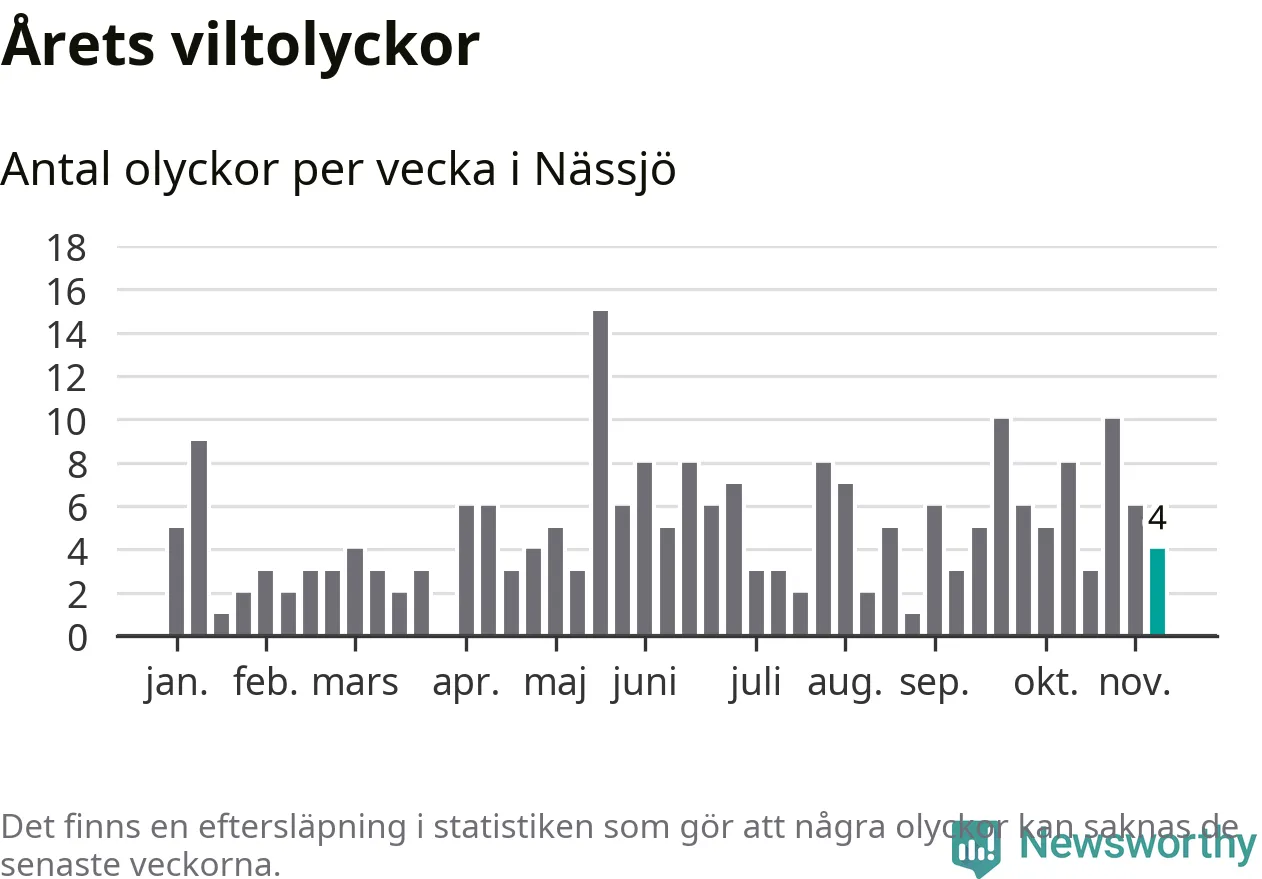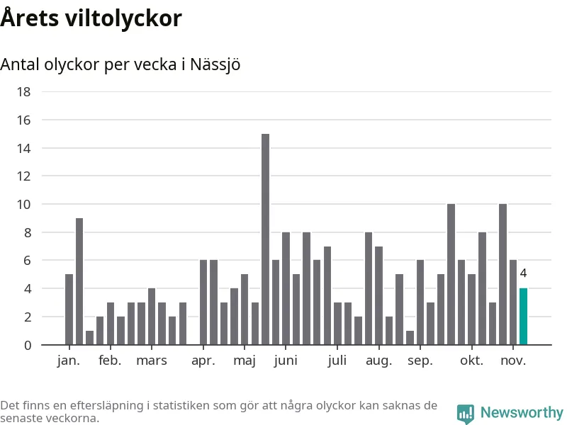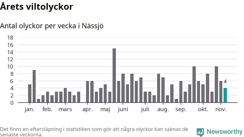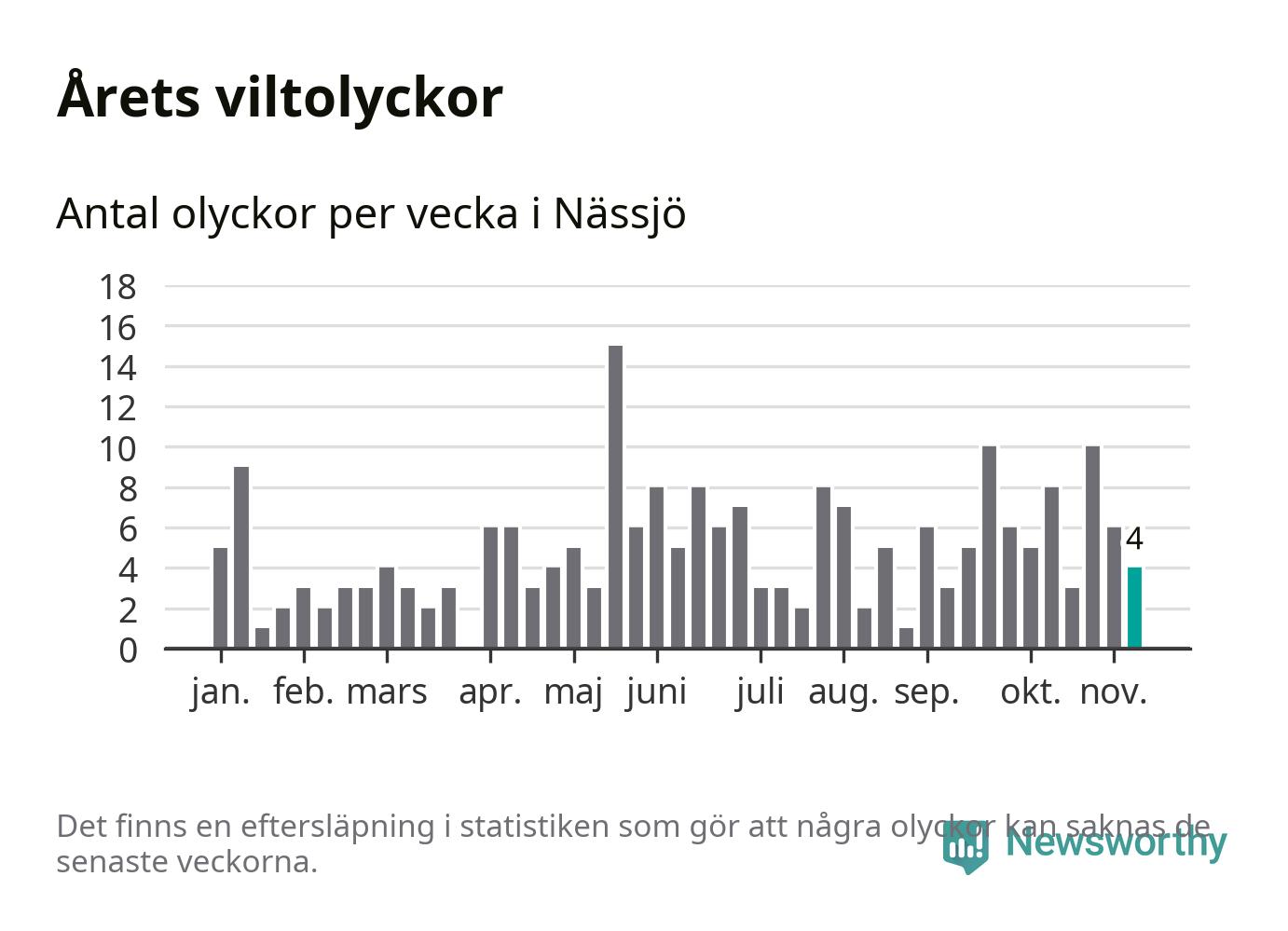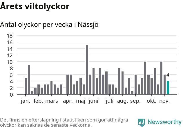 Hittills har fyra viltolyckor rapporterats in i Nässjö kommun från vecka 46. Se listan här.