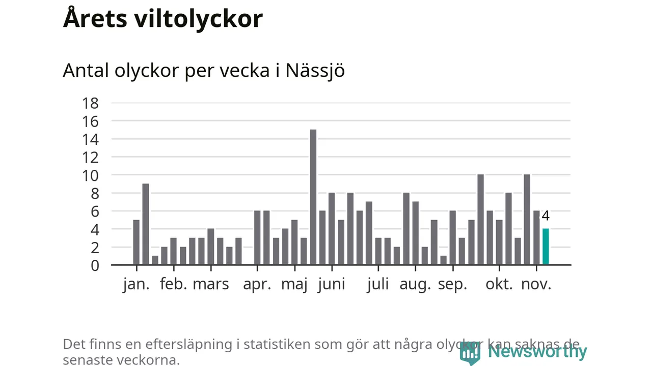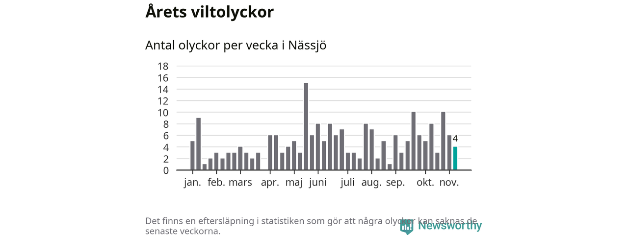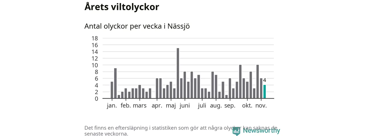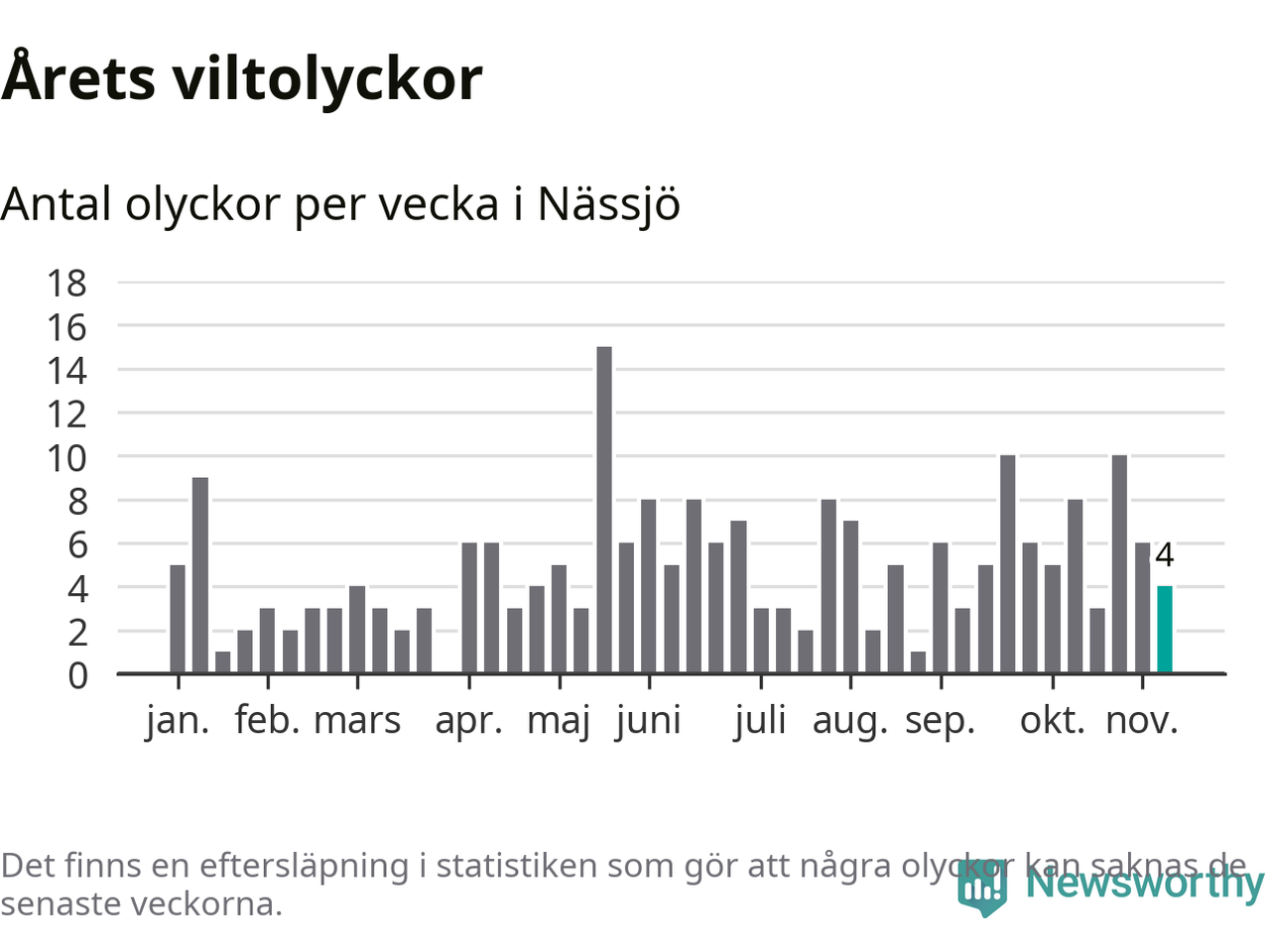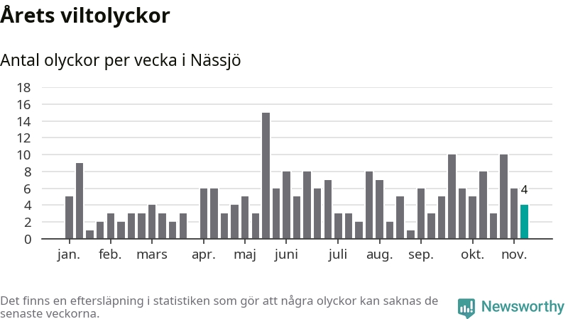 Hittills har fyra viltolyckor rapporterats in i Nässjö kommun från vecka 46. Se listan här.