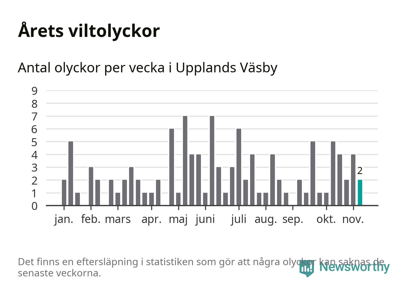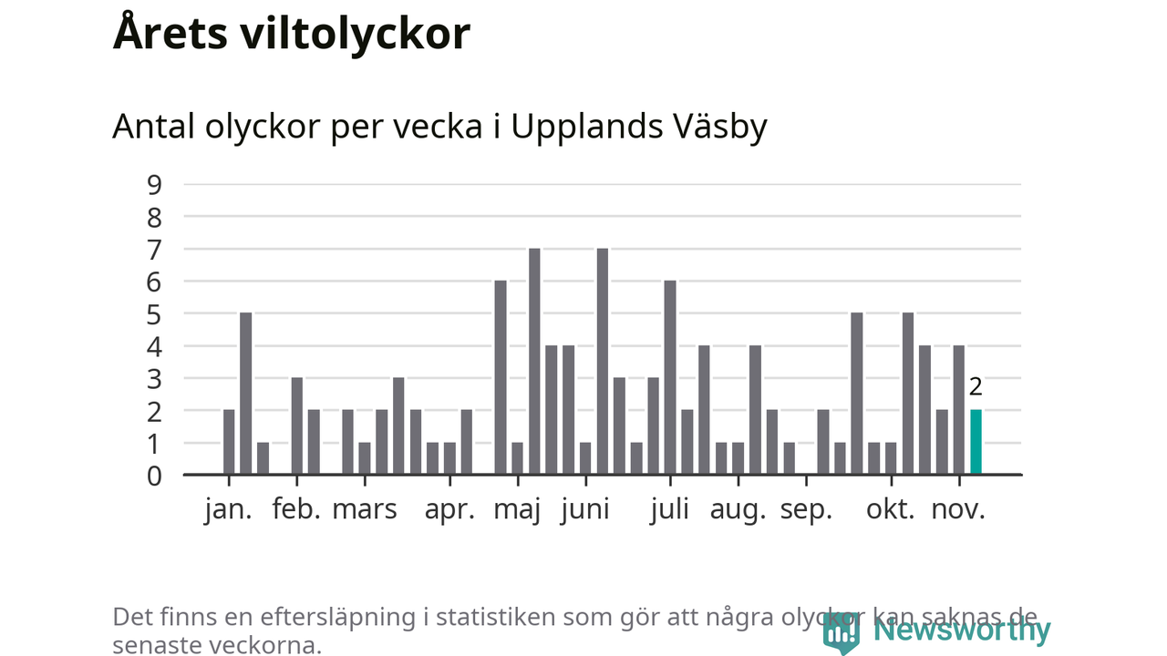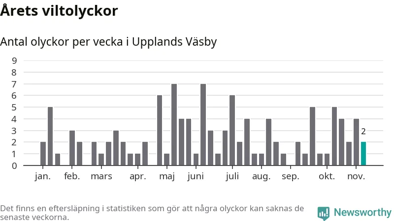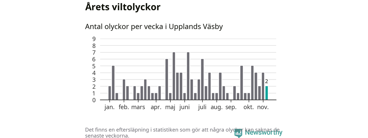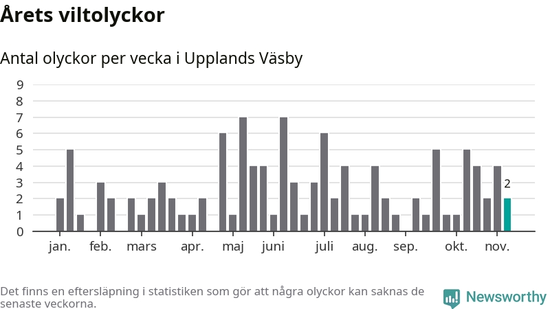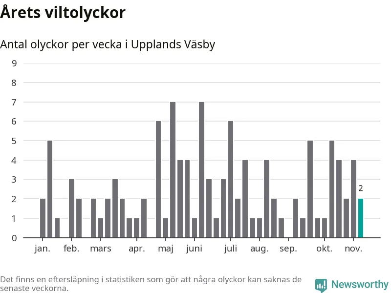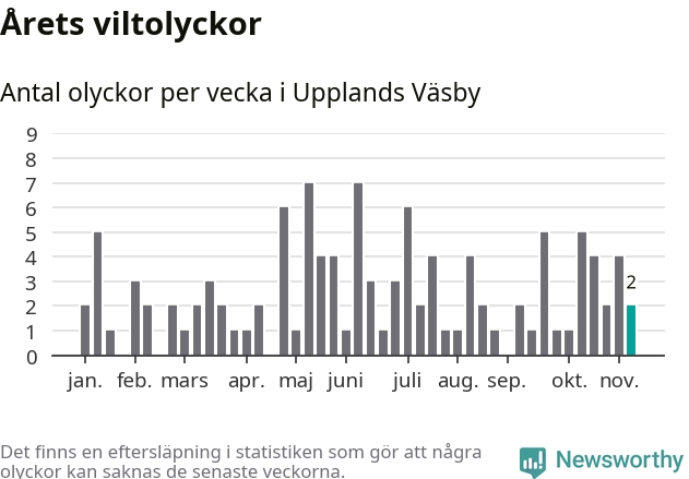 Hittills har två viltolyckor rapporterats in i Upplands Väsby kommun från vecka 46. Se listan här.