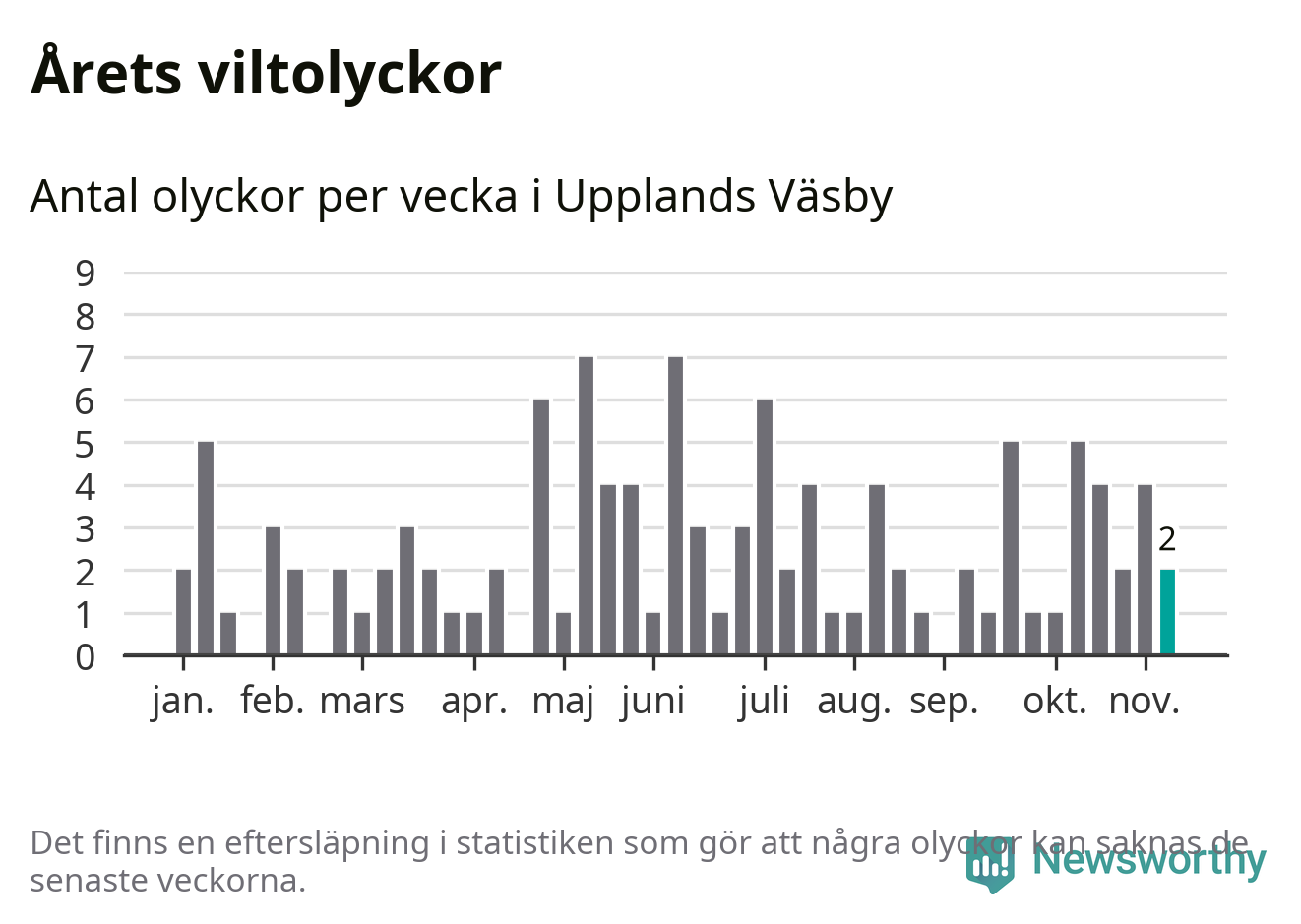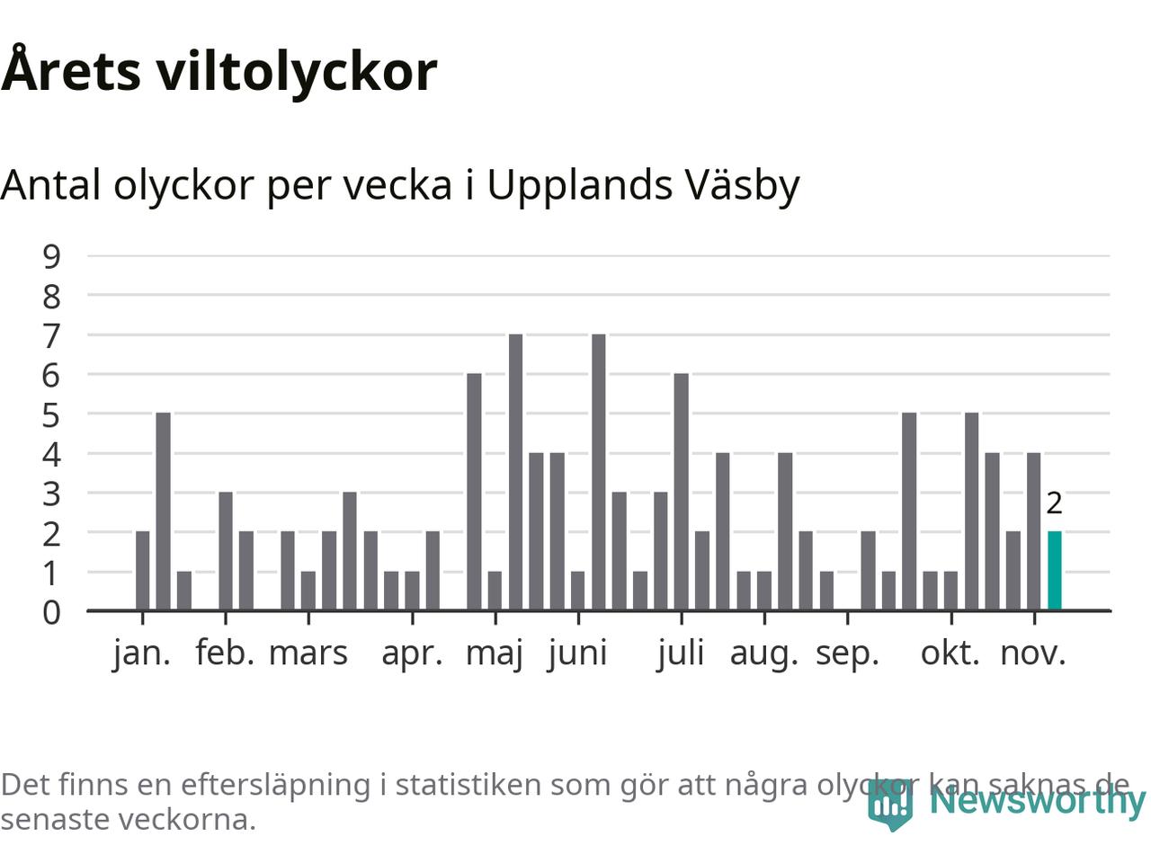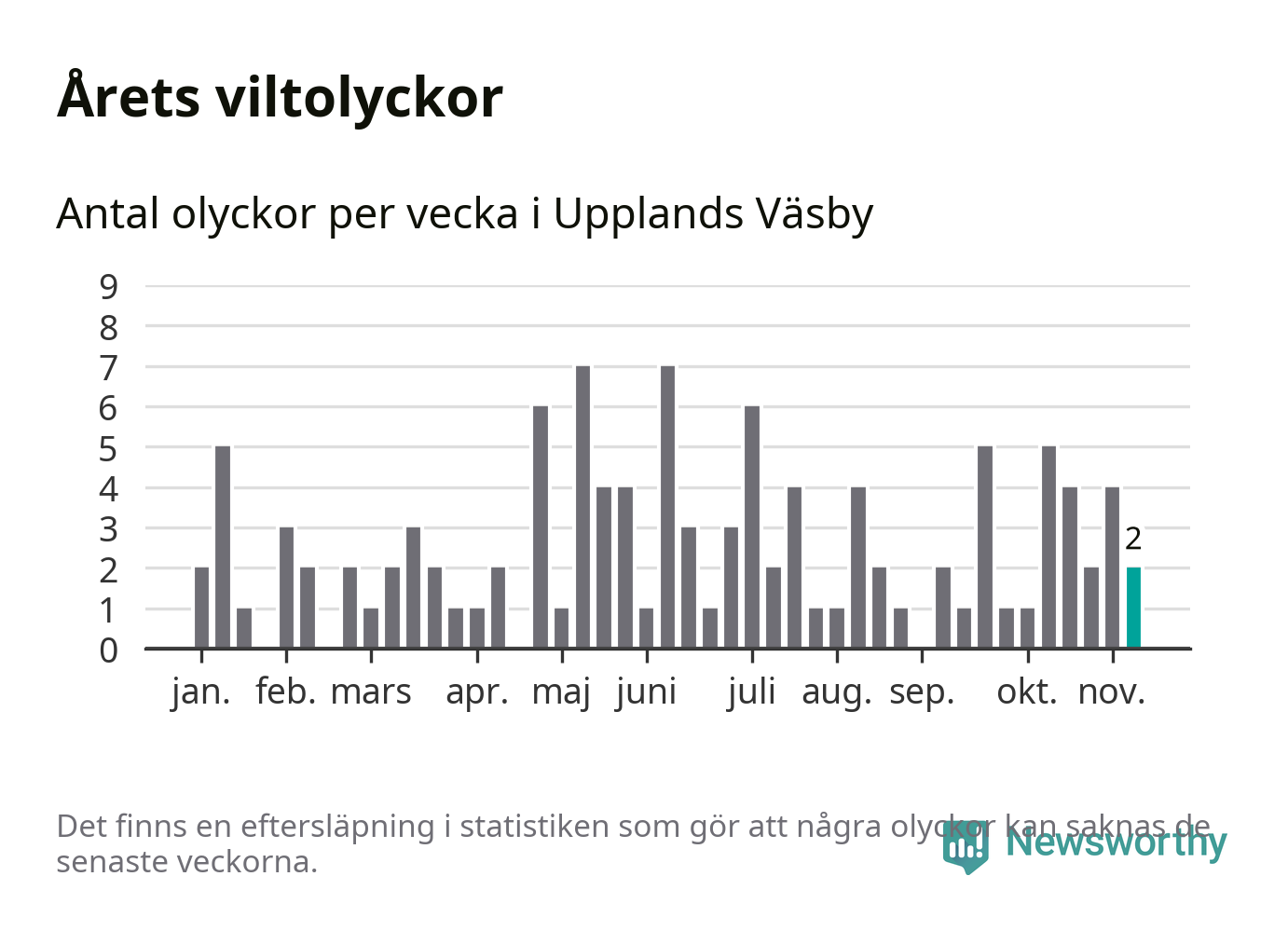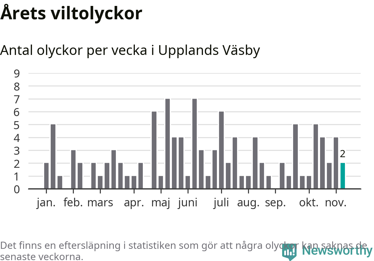 Hittills har två viltolyckor rapporterats in i Upplands Väsby kommun från vecka 46. Se listan här.