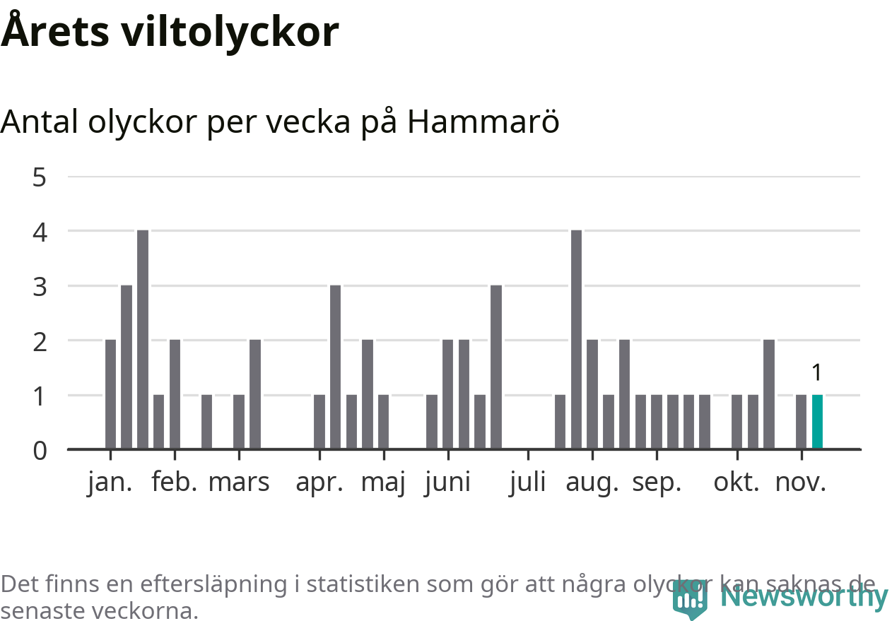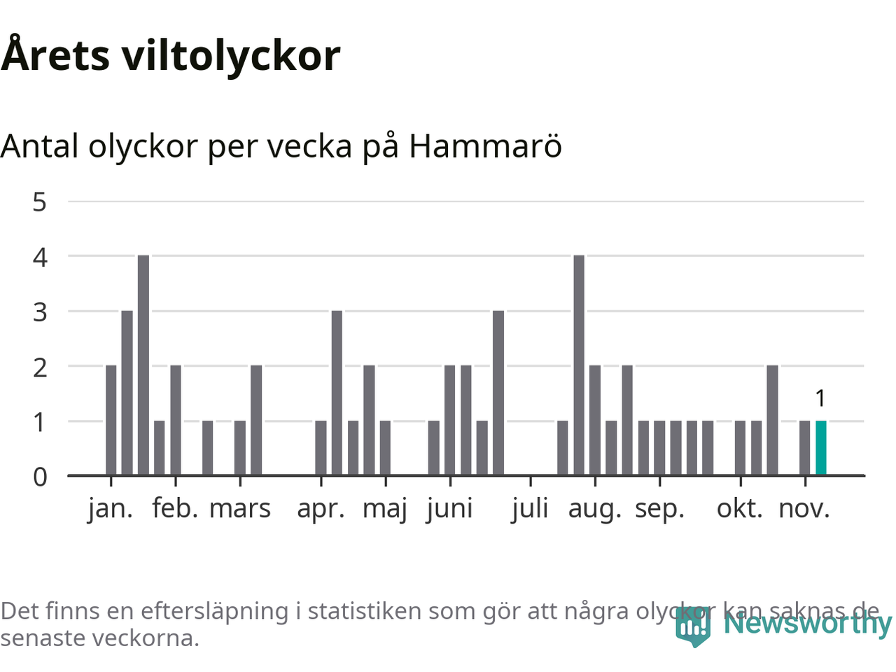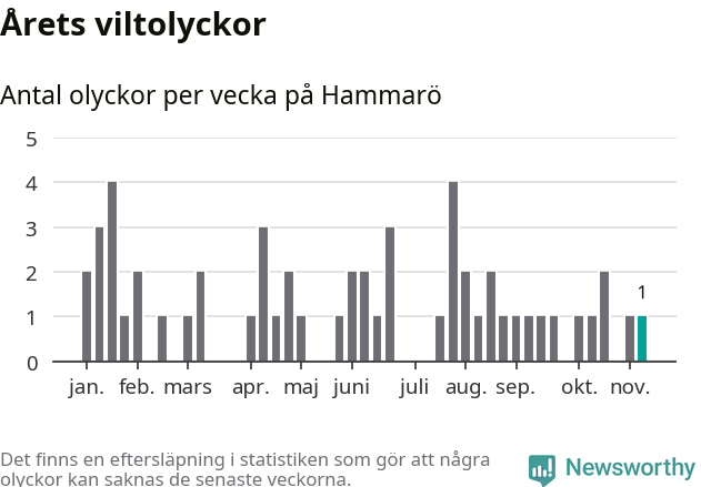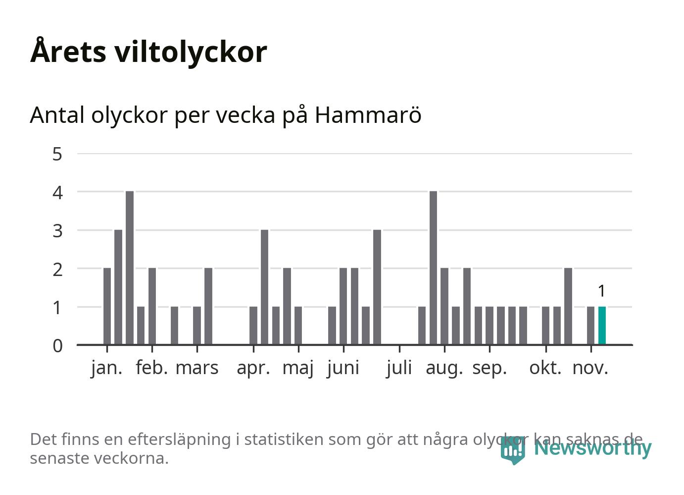 Från förra veckan (vecka 46) har hittills en viltolycka rapporterats in i Hammarö kommun.