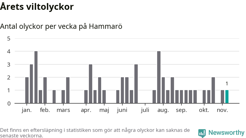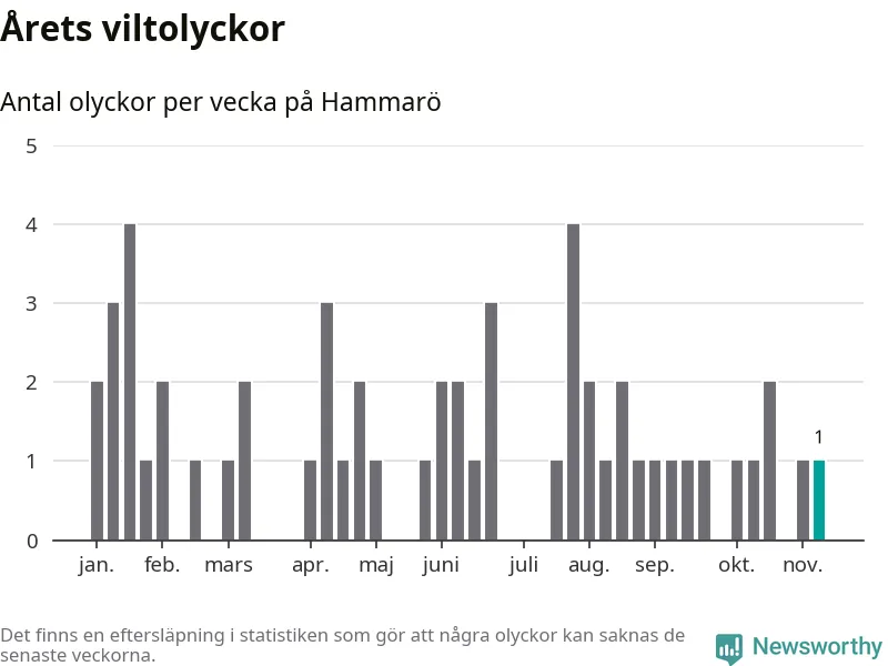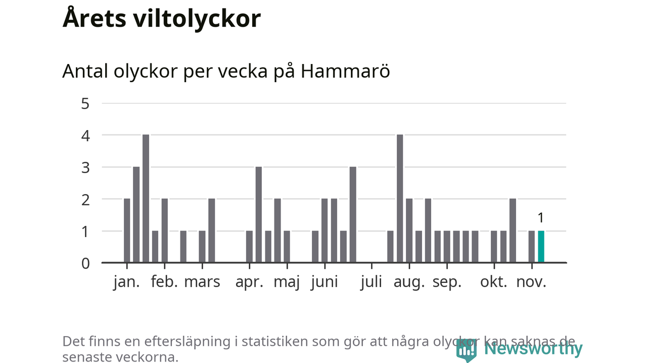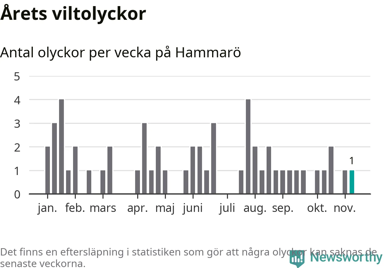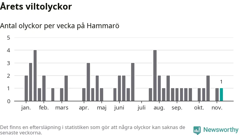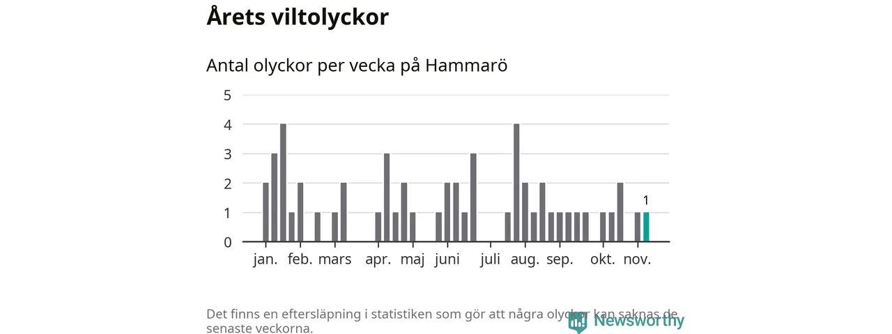 Från förra veckan (vecka 46) har hittills en viltolycka rapporterats in i Hammarö kommun.