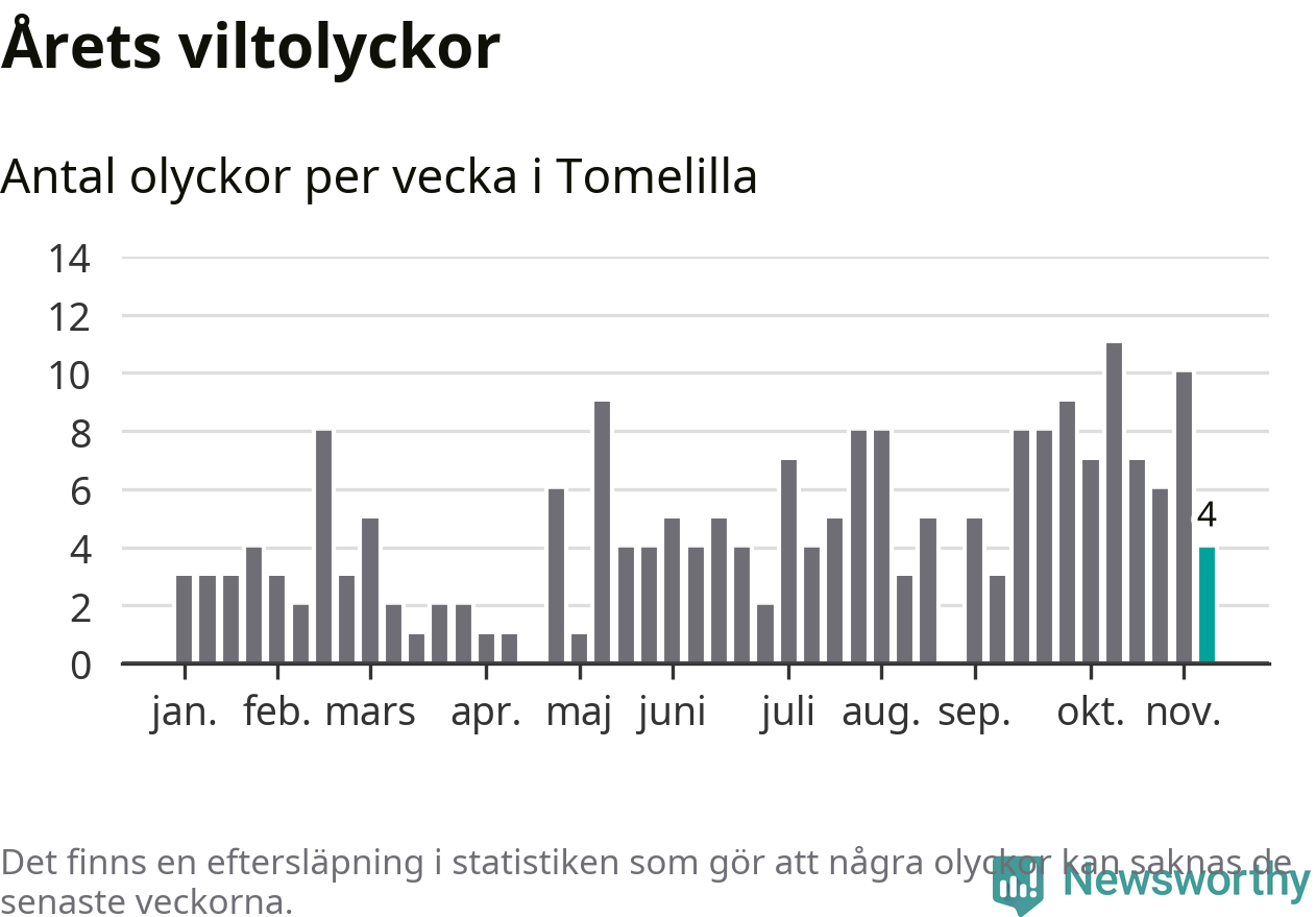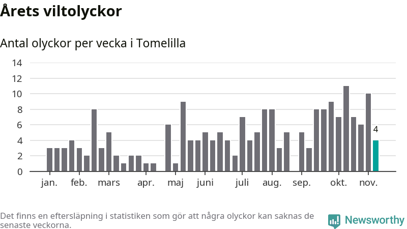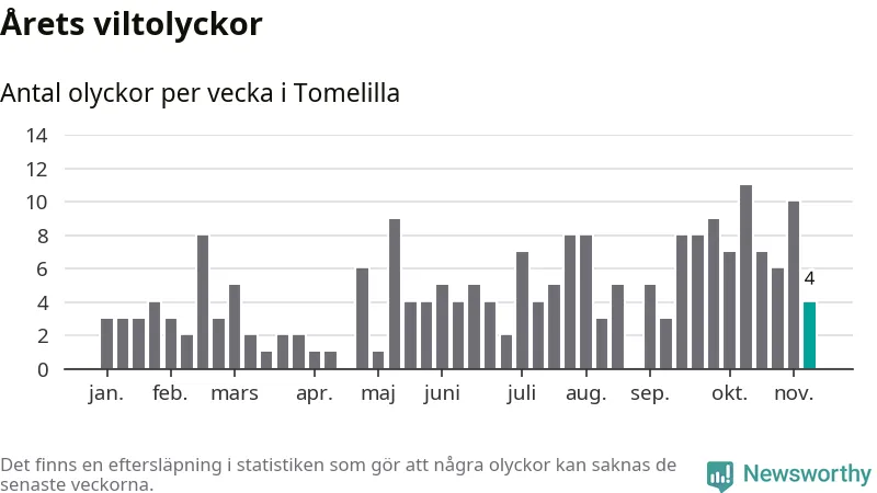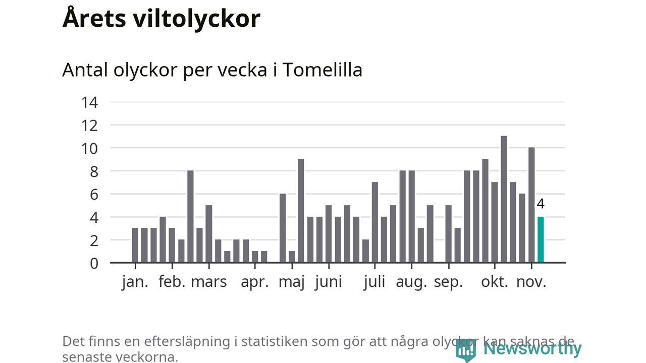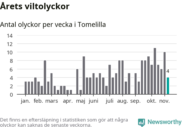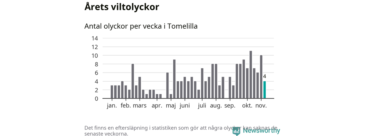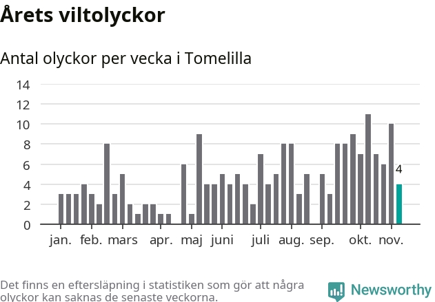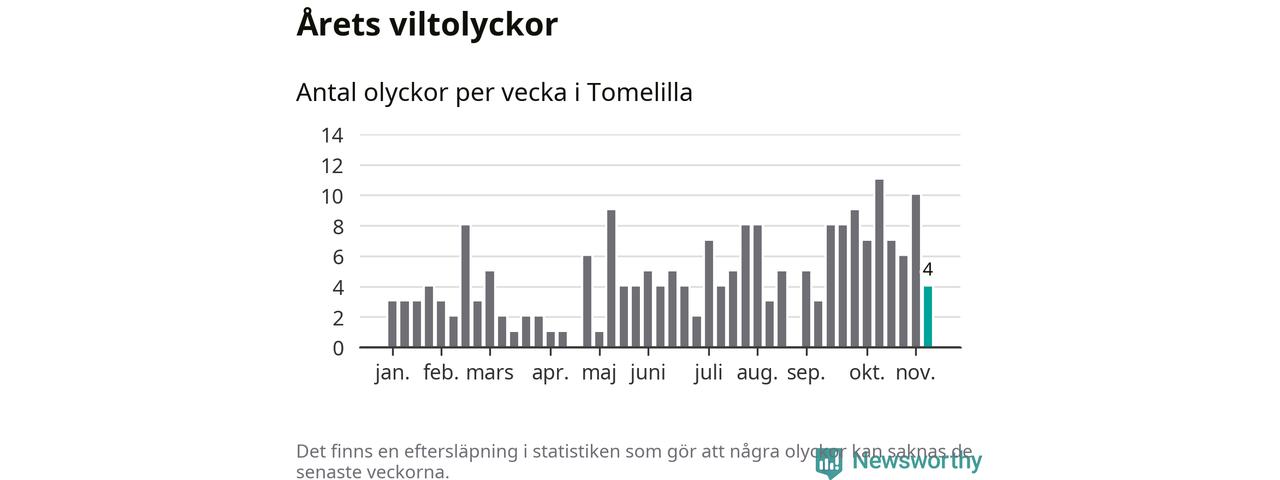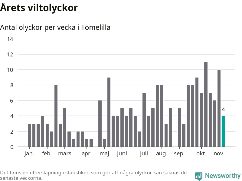 Hittills har fyra viltolyckor rapporterats in i Tomelilla kommun från vecka 46. Se listan här.