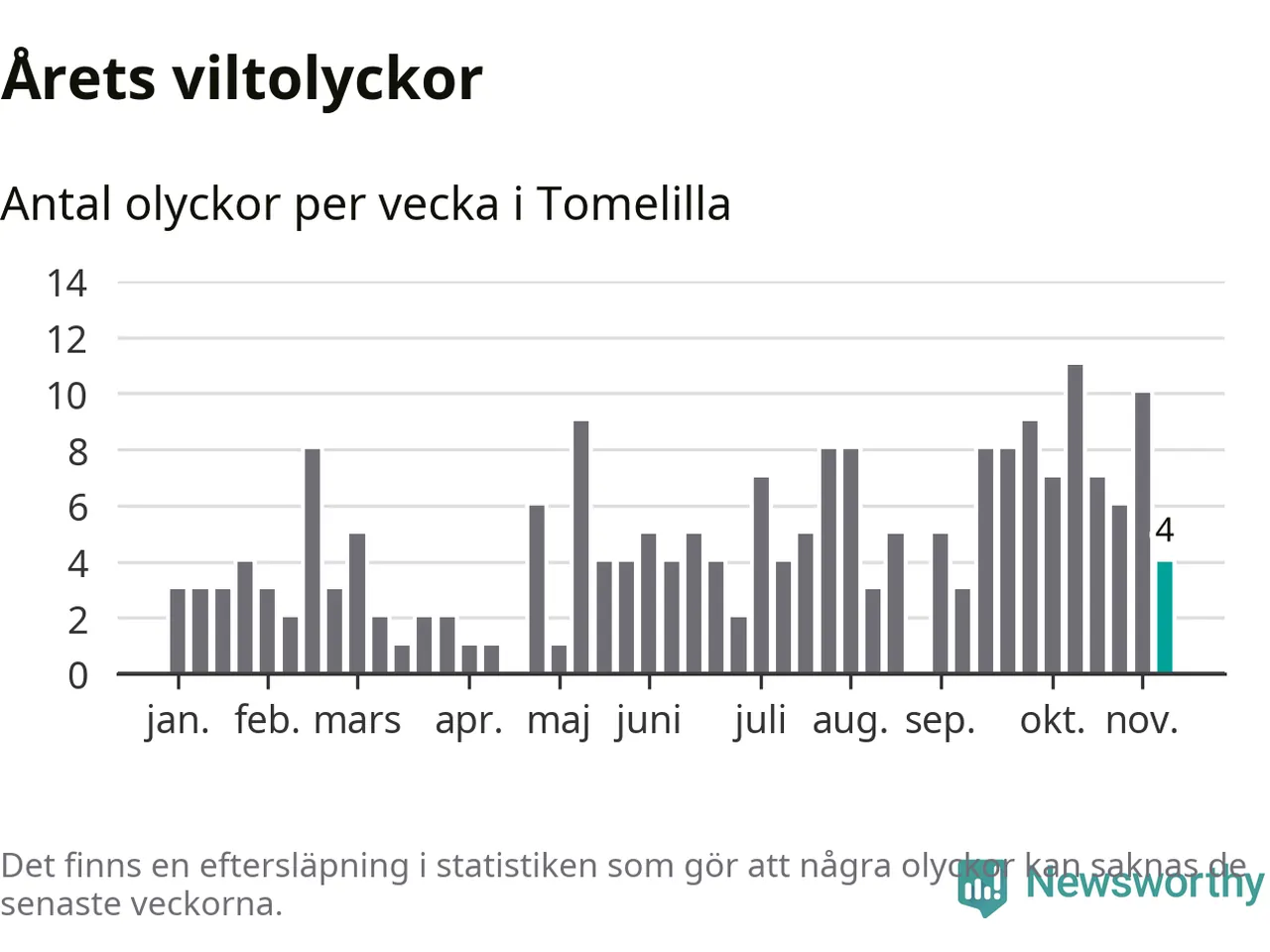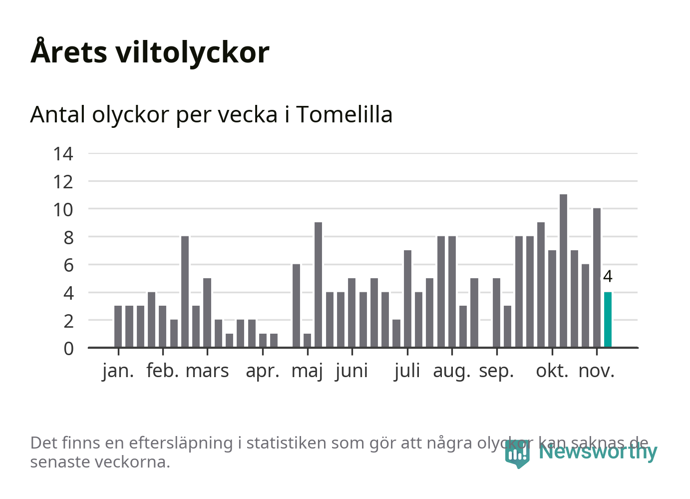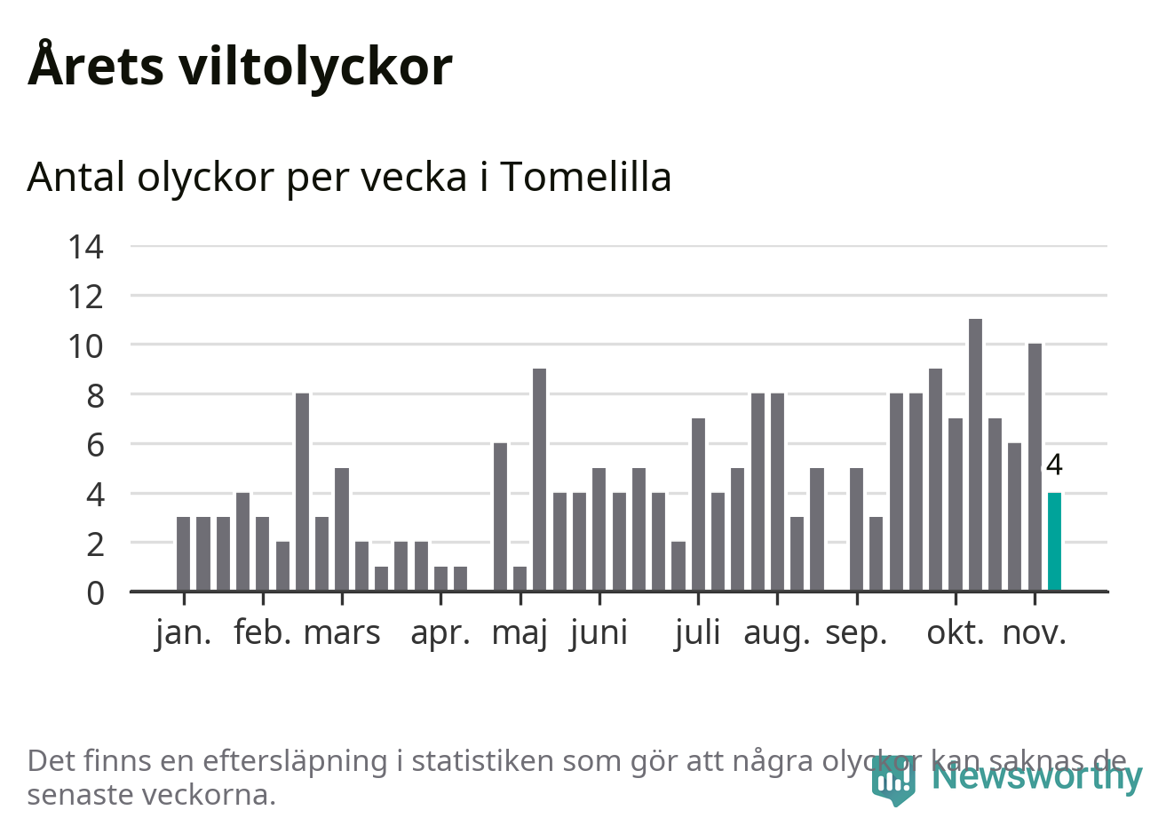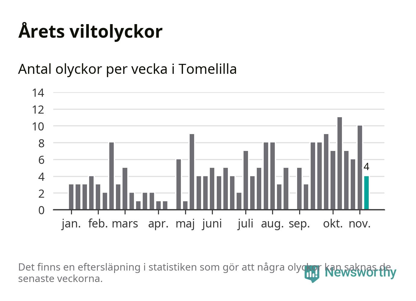 Hittills har fyra viltolyckor rapporterats in i Tomelilla kommun från vecka 46. Se listan här.