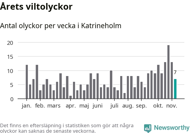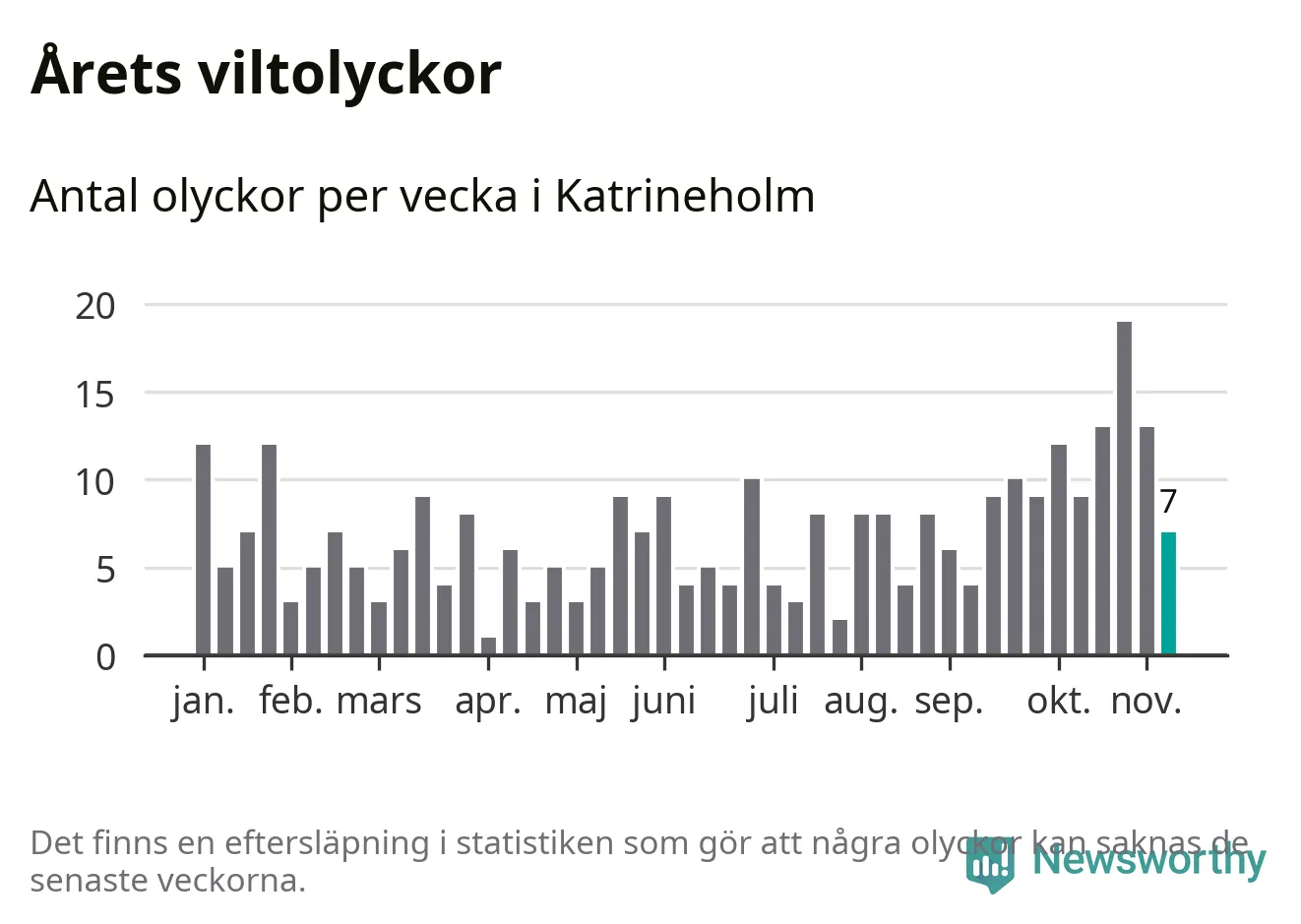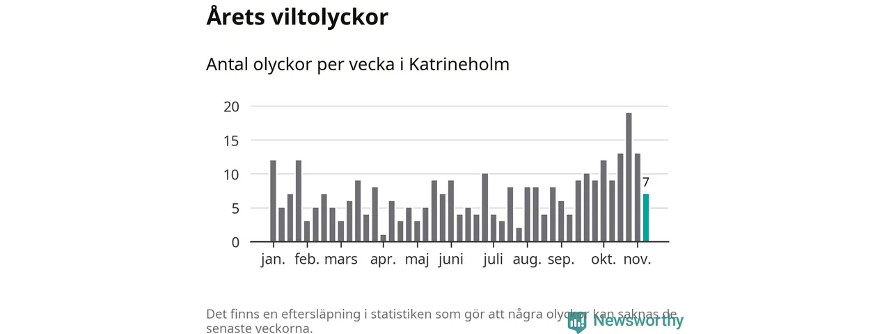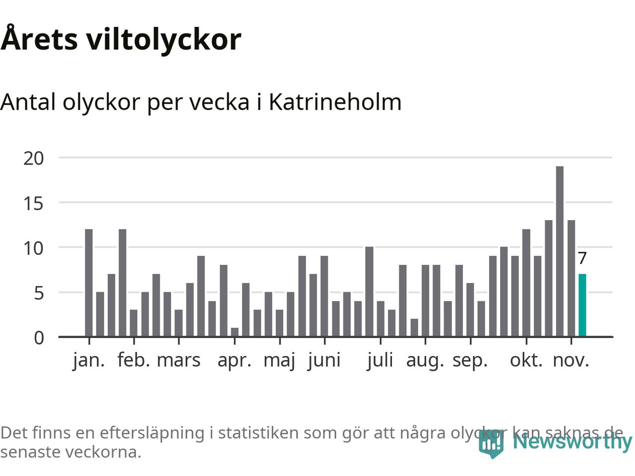 Hittills har sju viltolyckor rapporterats in i Katrineholms kommun från vecka 46. Se listan här.
